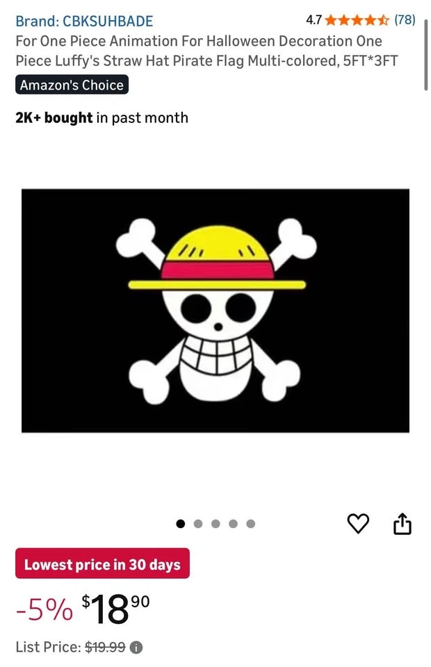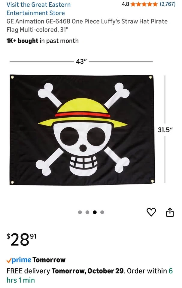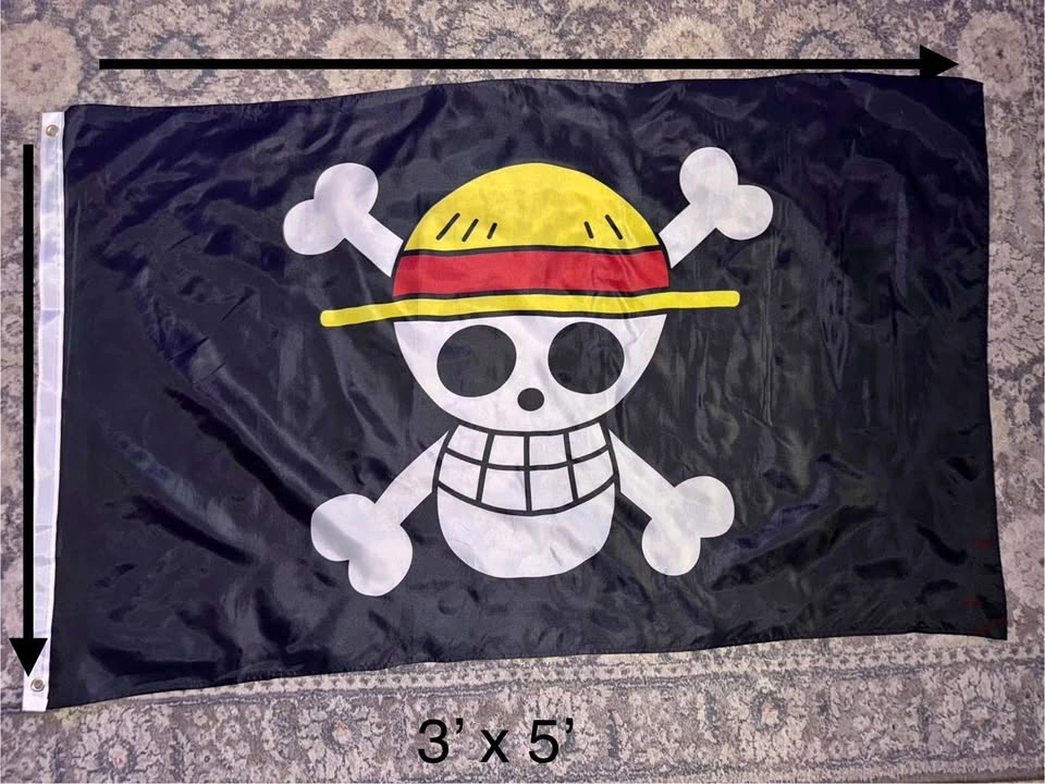 10Hello, I have for sale a OnePiece Strawhat Pirates Pirate Flag - 3ft x 5ft - Transparent Skull. I have 15 total. Similar flags are more expensive and smaller. Perfectly in time for Halloween! Buy multiple for a discount. Condition: Brand New Original MSRP: $20 + Tax + Shipping Offer (OBO): $15 I am located in the Loop (New Eastside/Lakeshore East). You can pull up to the curb without worry of ticket. Also, you can use my buildings garage for 30 minutes, free of charge.