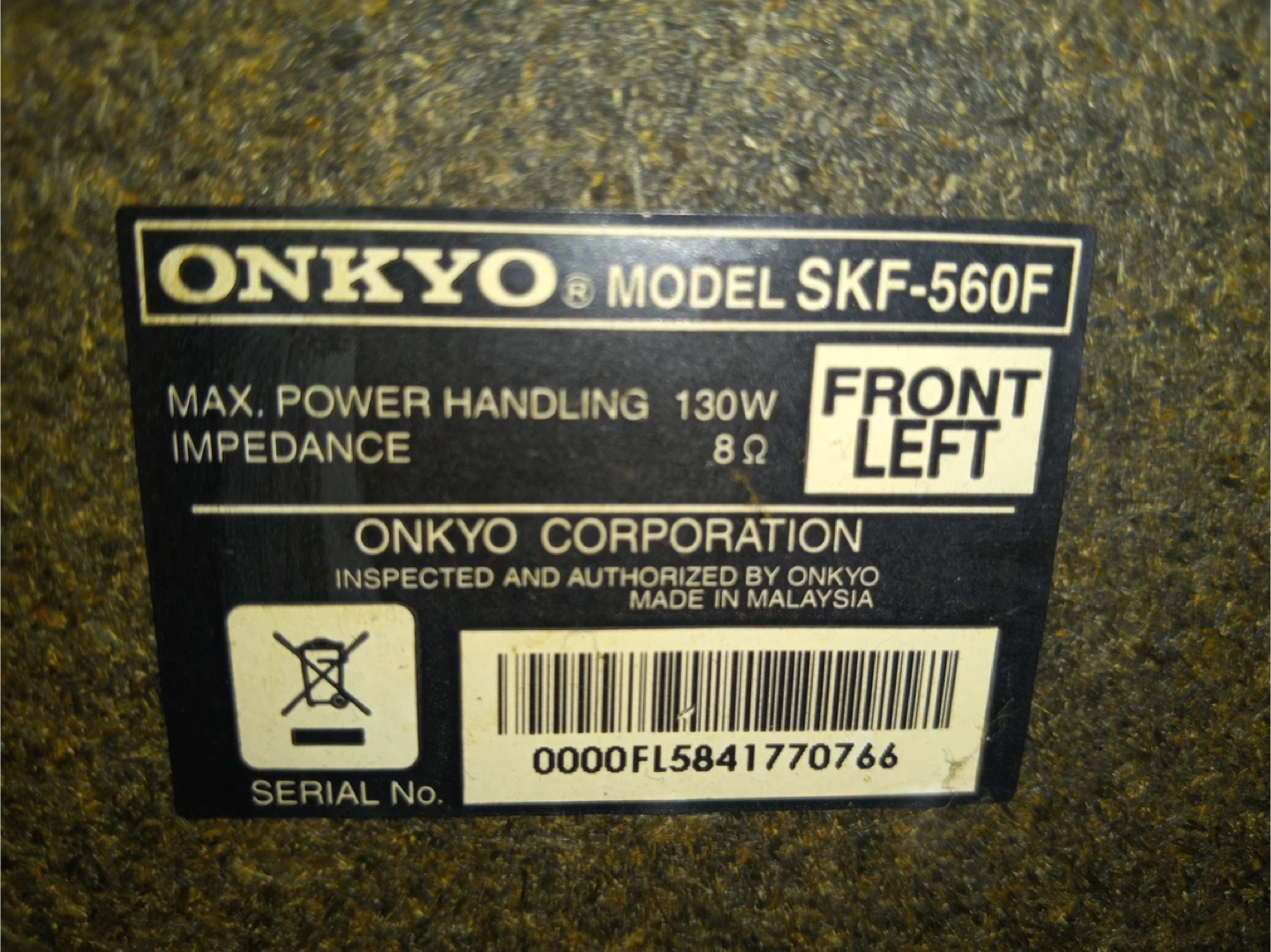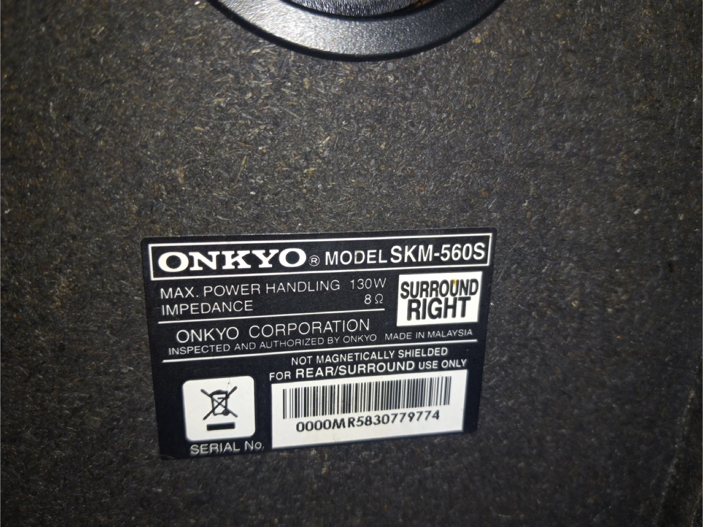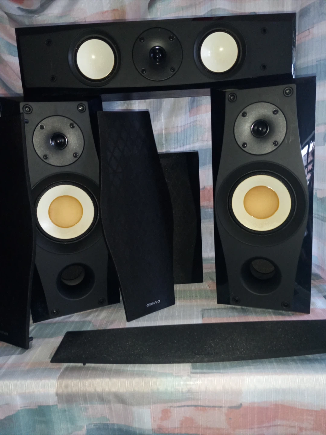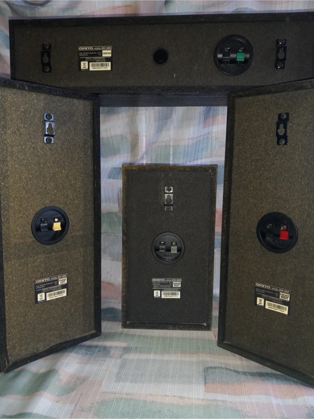 Selling a set of Onkyo speakers! Includes the following models: - SKF-560F (Front Left and Right) - SKM-560S (Surround Right) - SKC-560C (Center) Each speaker has a max power handling of 130W and an impedance of 8Ω