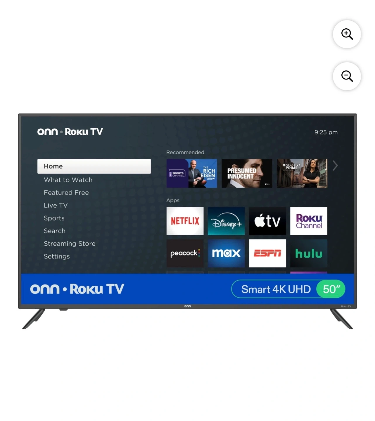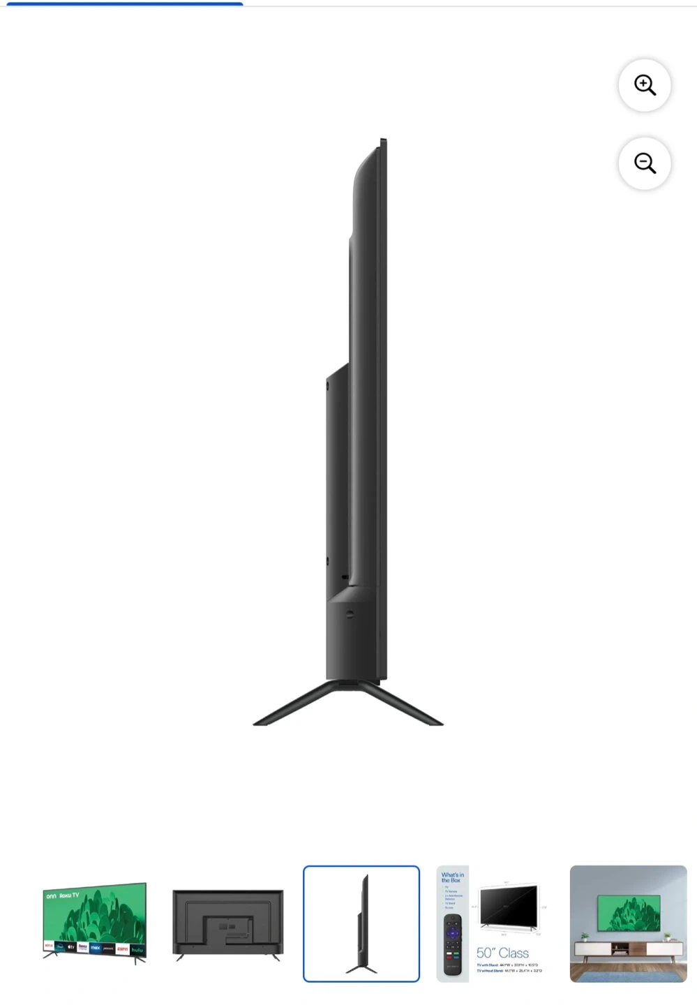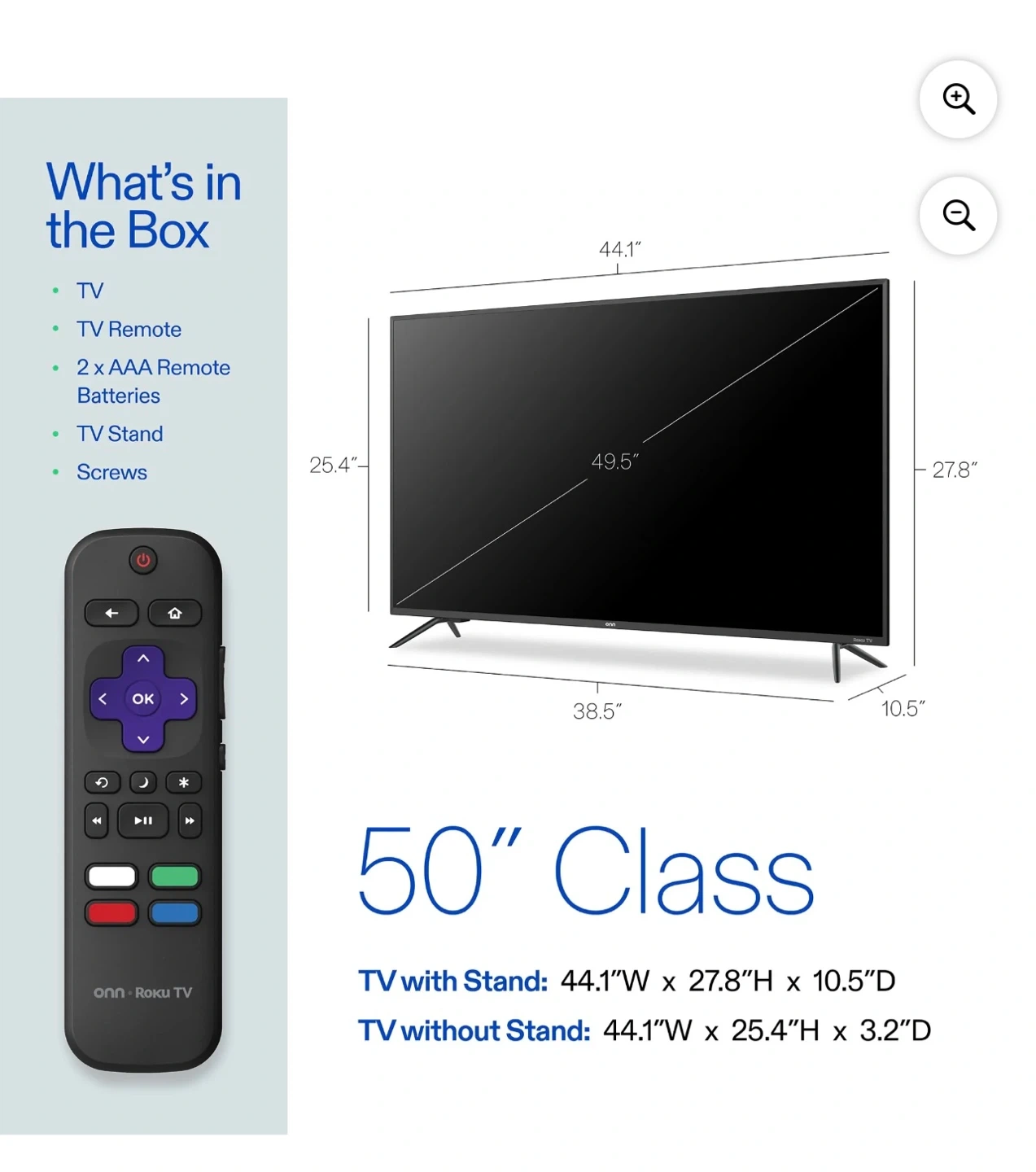 Selling an onn. Roku TV, a 50" Class Smart 4K UHD TV! What's included in the box: - TV - TV Remote - 2 x AAA Remote Batteries - TV Stand - Screws Dimensions: TV with Stand: 44.1"W x 27.8"H x 10.5"D TV without Stand: 44.1"W x 25.4"H x 3.2"D