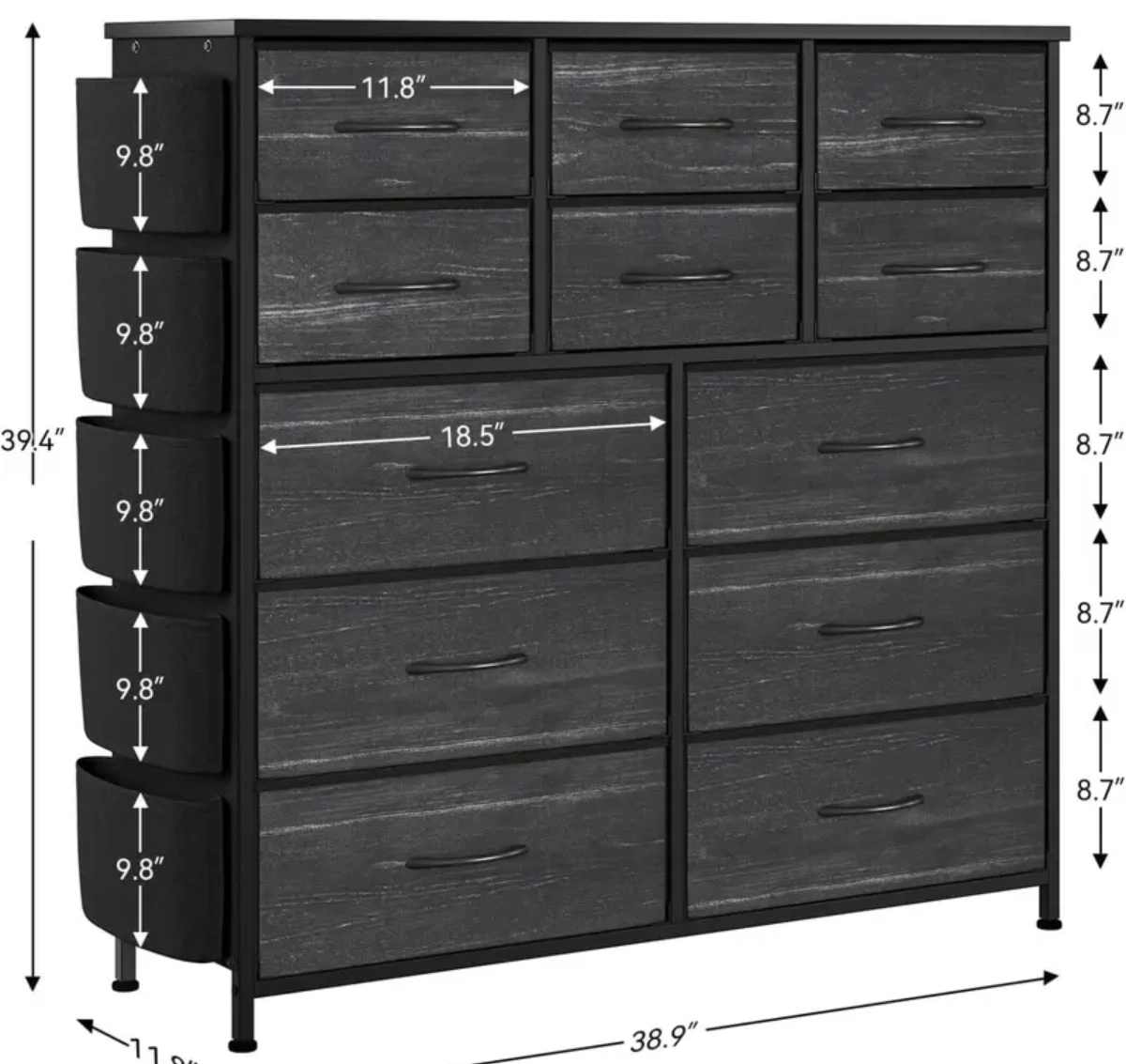 Here's a fabric dresser with metal frame and wooden top! It features 13 drawers/compartments of varying sizes.