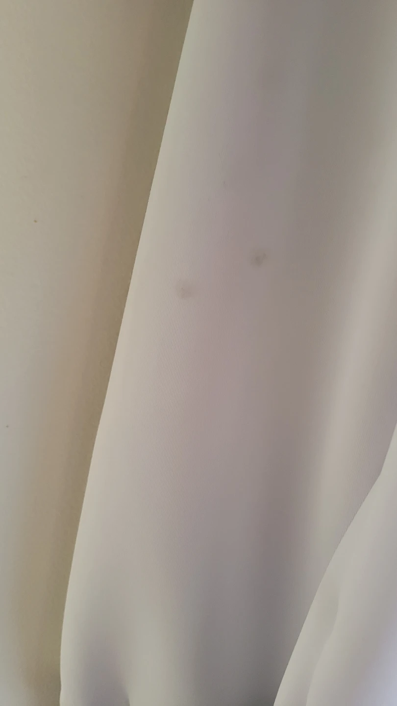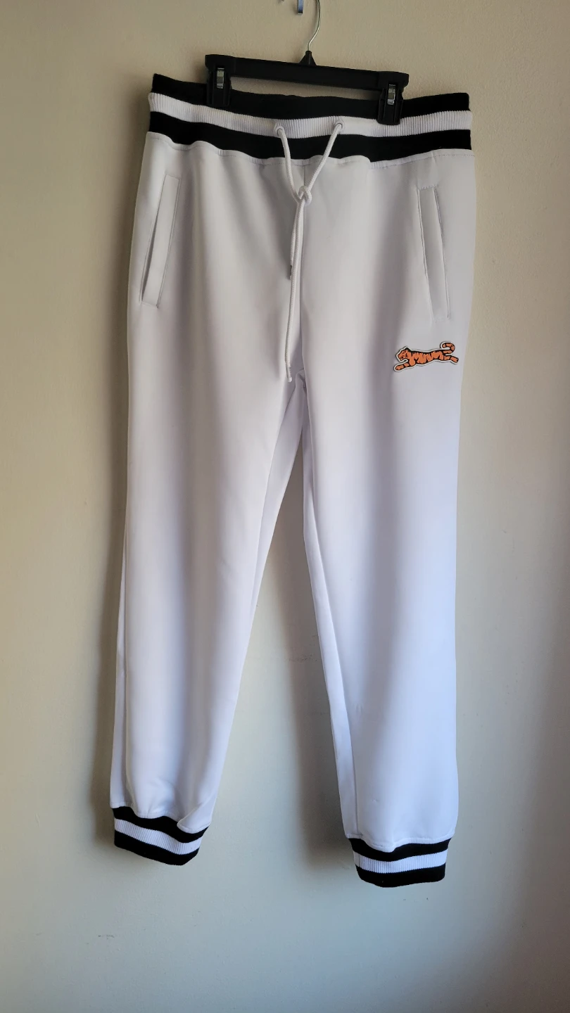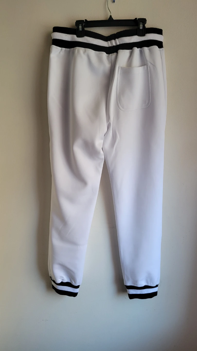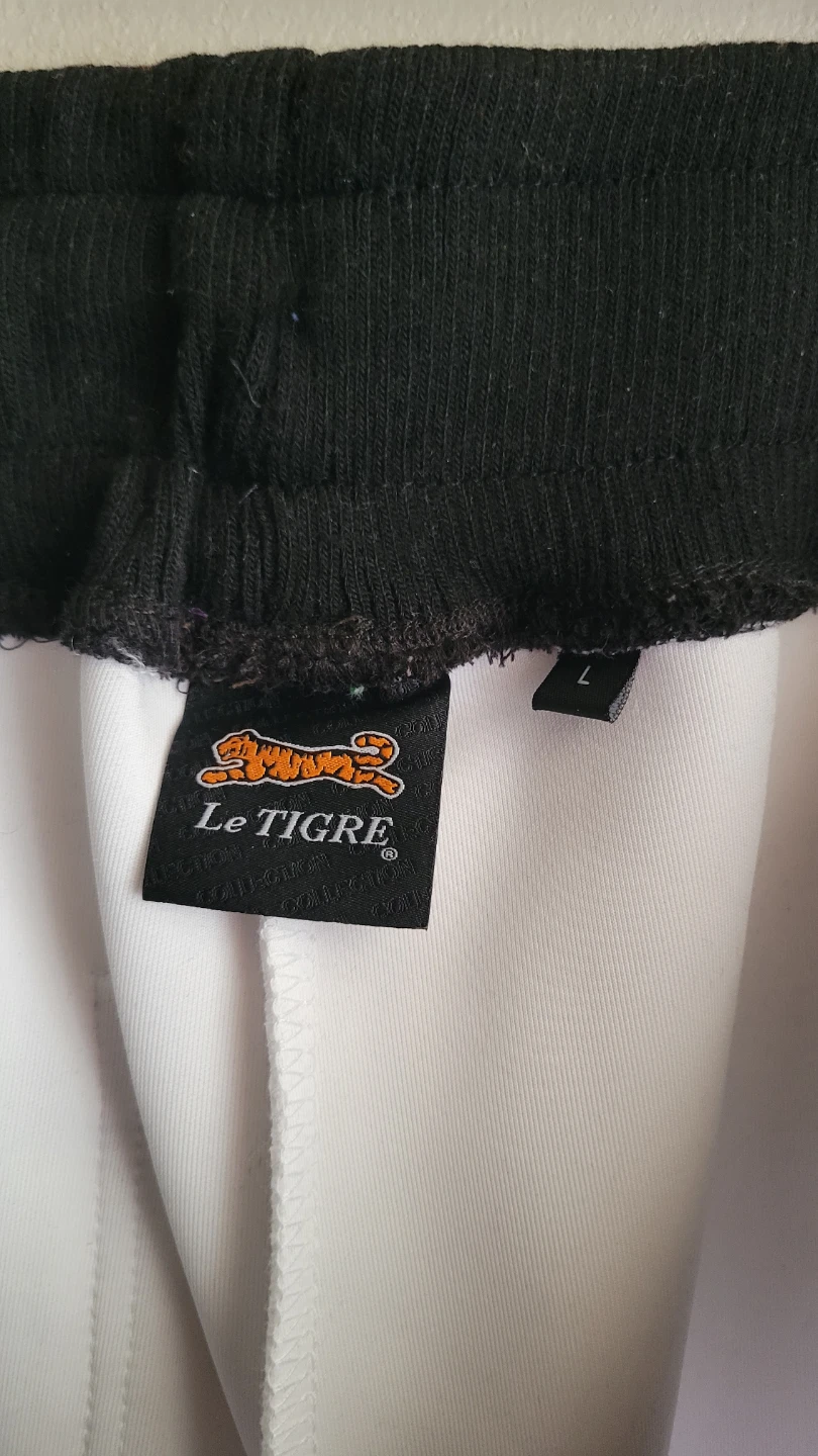 White Le Tigre track jacket and matching pants set. Features a tiger logo on the jacket size XL and pants. Size L. Jacket has a zip front and ribbed collar, cuffs, and hem. Pants have a drawstring waist and ribbed cuffs. Some small faint marks on the jacket material.