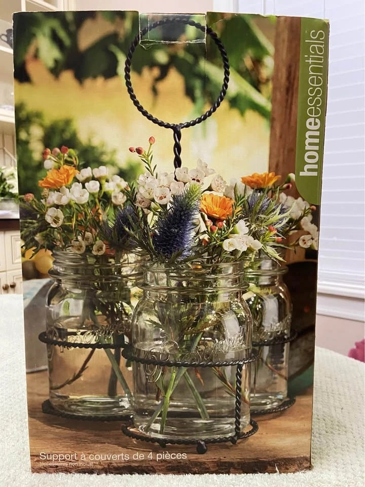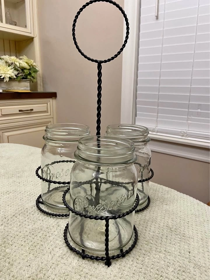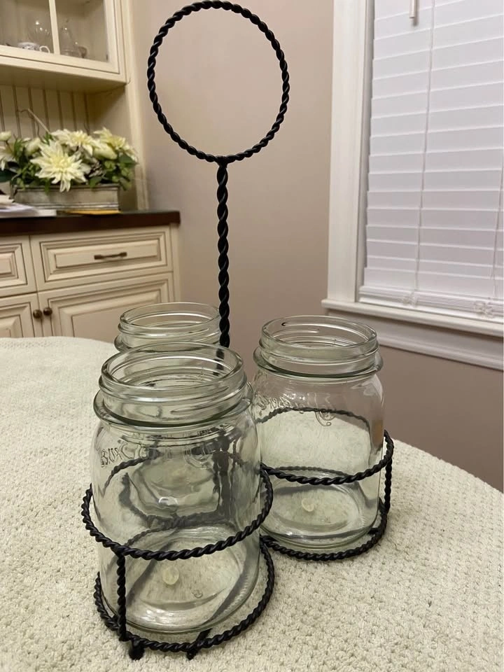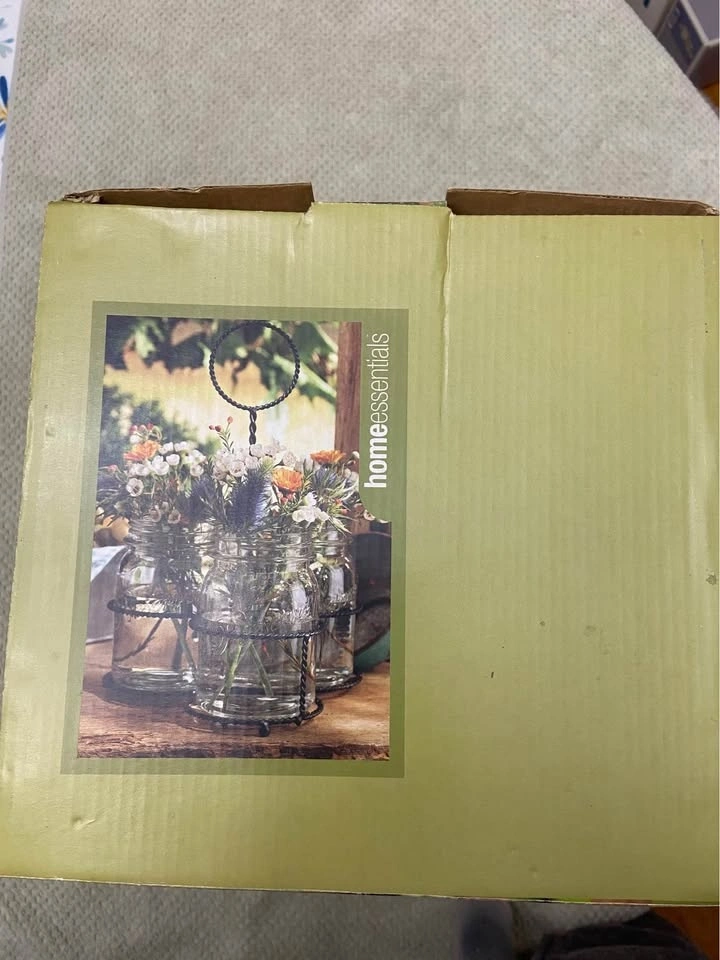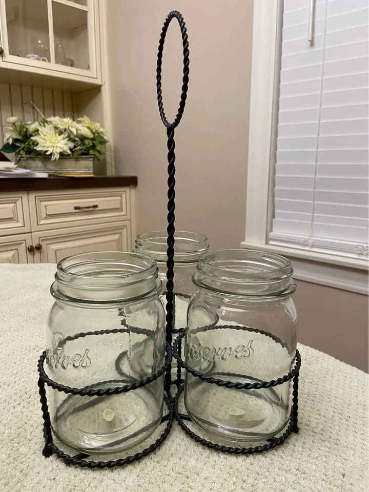Purchased from Macy’s. Original $19.99. Includes 3 glass jars and a metal holder. Glass jars say “Preserves”. Metal holder has a rustic finish. Lightweight and portable with a convenient handle for easy mobility. Ideal for hosting indoor/outdoor events.