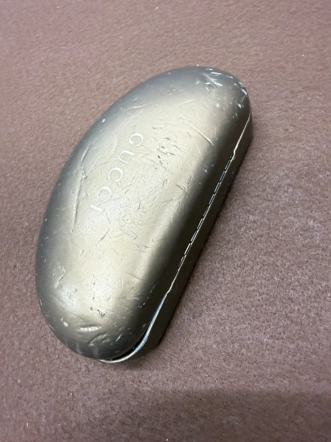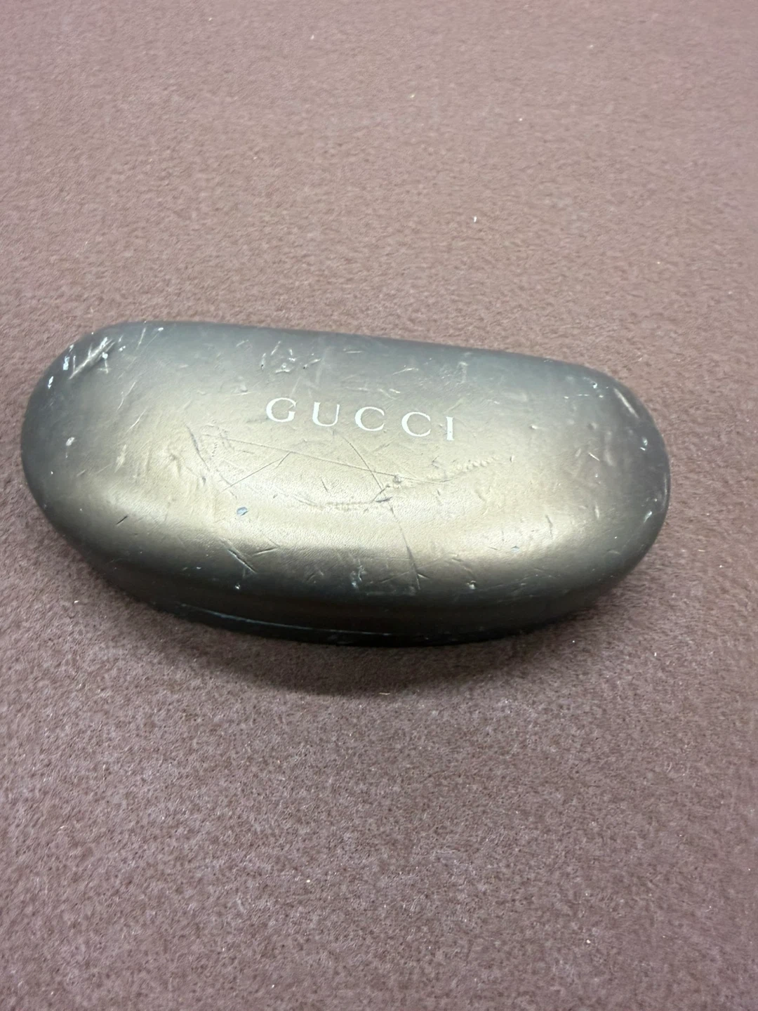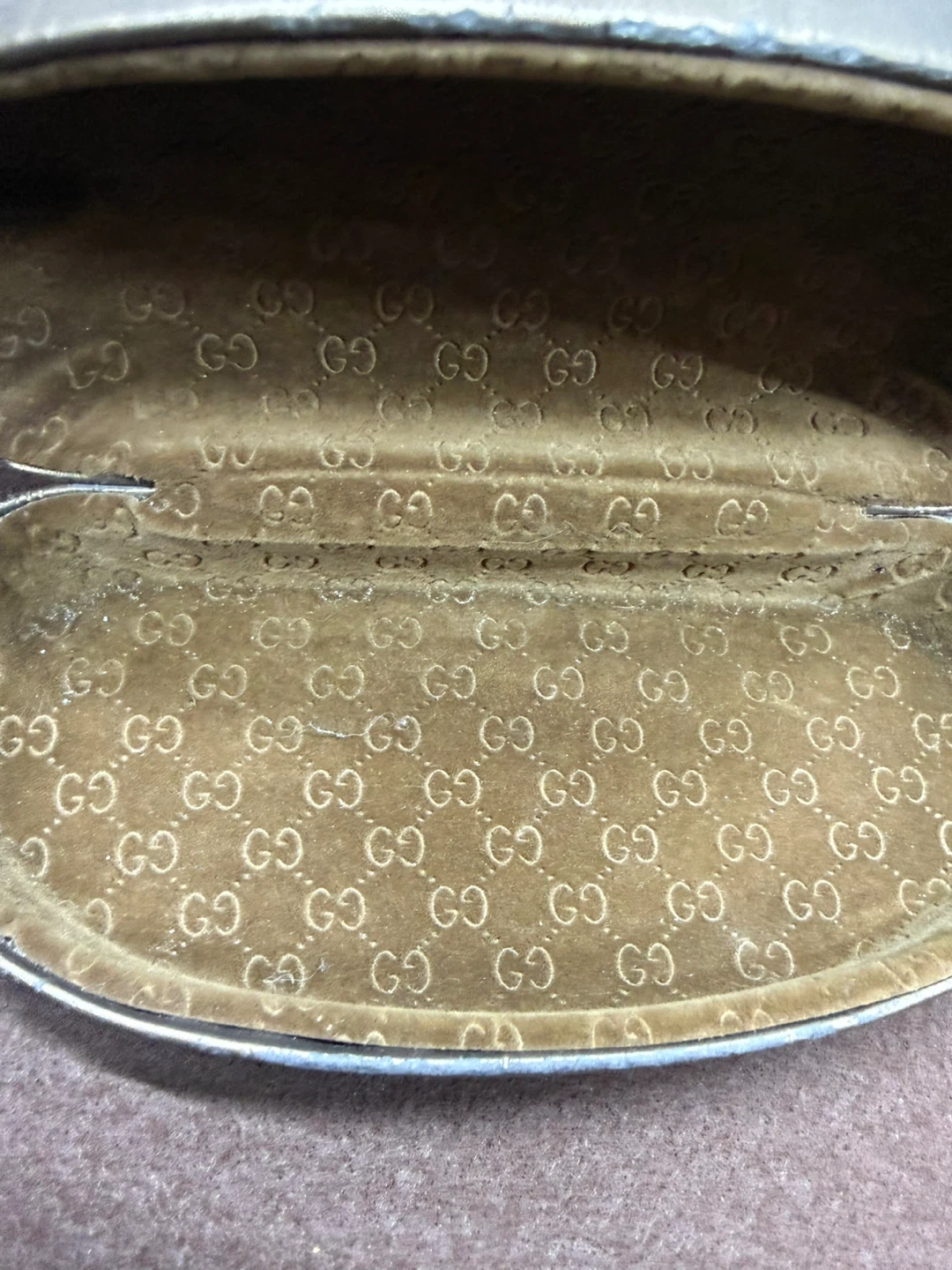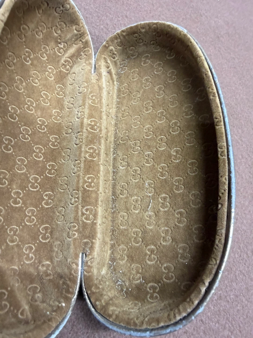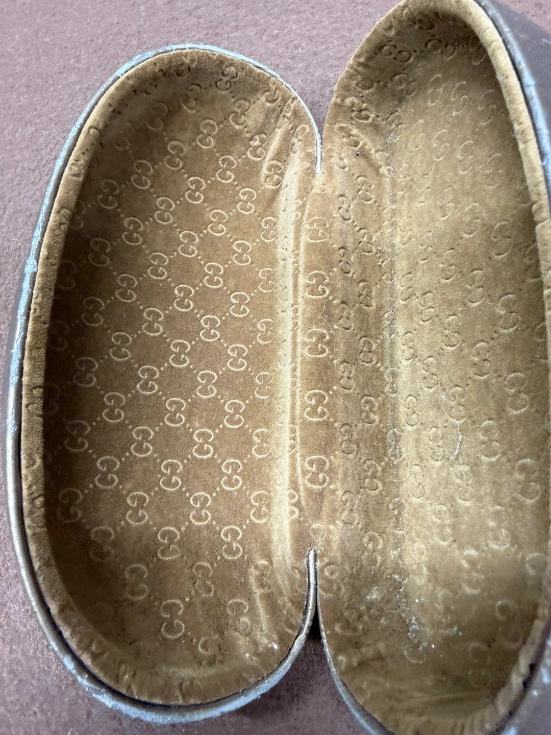 This is a pre-owned Gucci sunglasses case. The interior lining features the iconic GG pattern. It's a hard case designed to protect your eyewear.