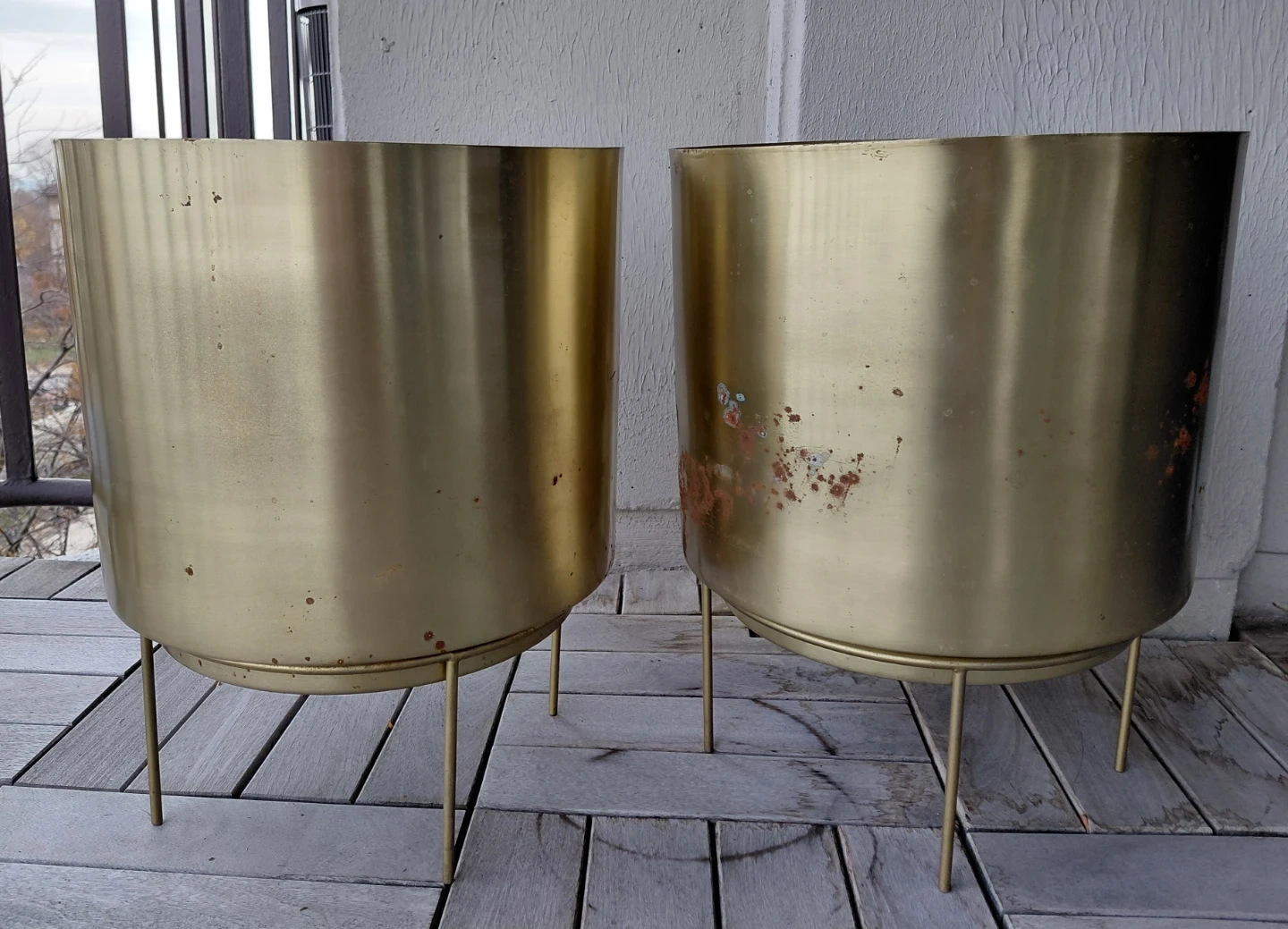 Two big metal planter boxes can be attached to a railing, filled with soil and natural fiber.