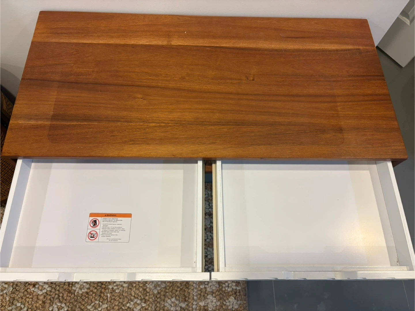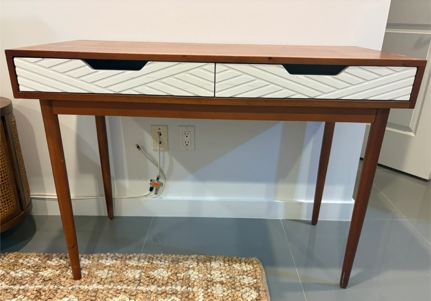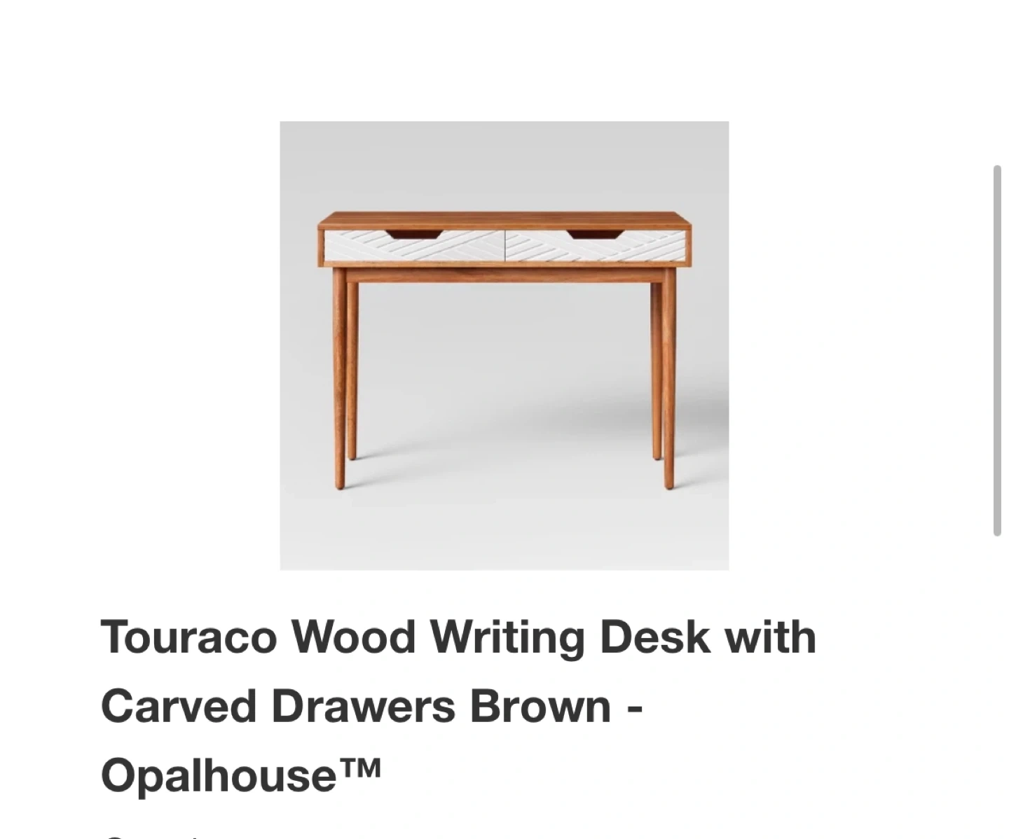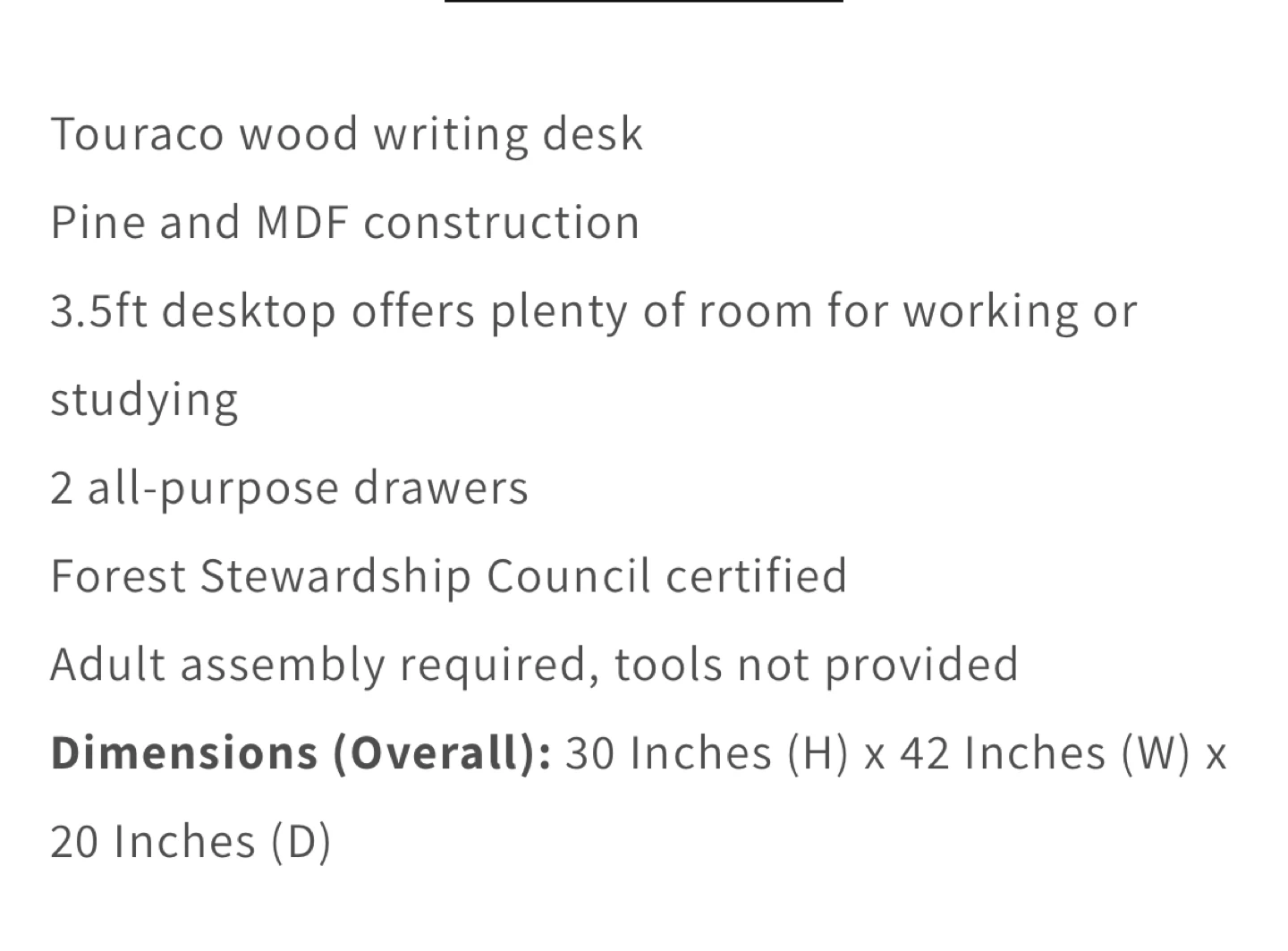 75Selling a Touraco wood writing desk from Target. It features a pine and MDF construction with a 3.5ft desktop, offering plenty of room for working or studying. It also has 2 all-purpose drawers. The dimensions are 30 inches (H) x 42 inches (W) x 20 inches (D)