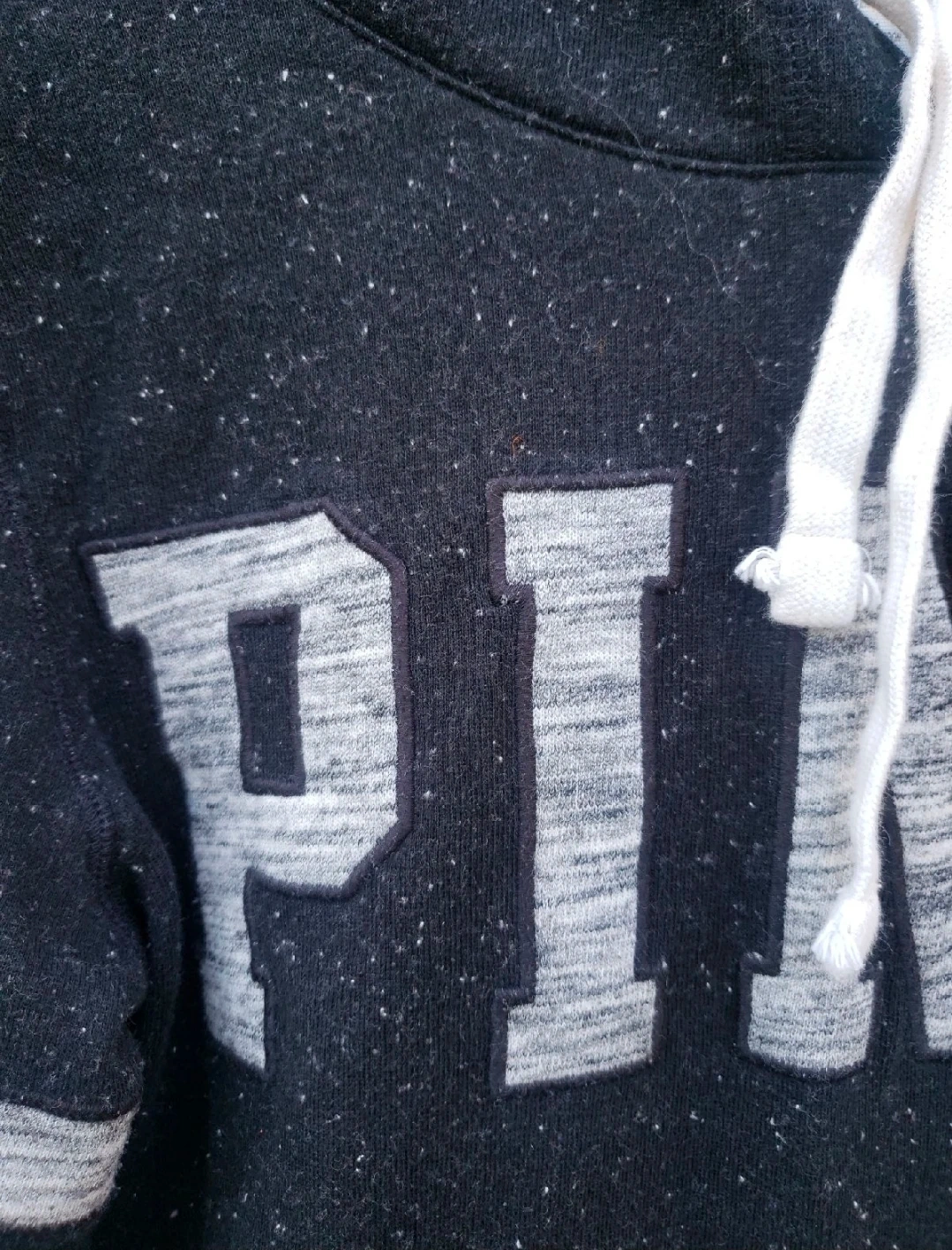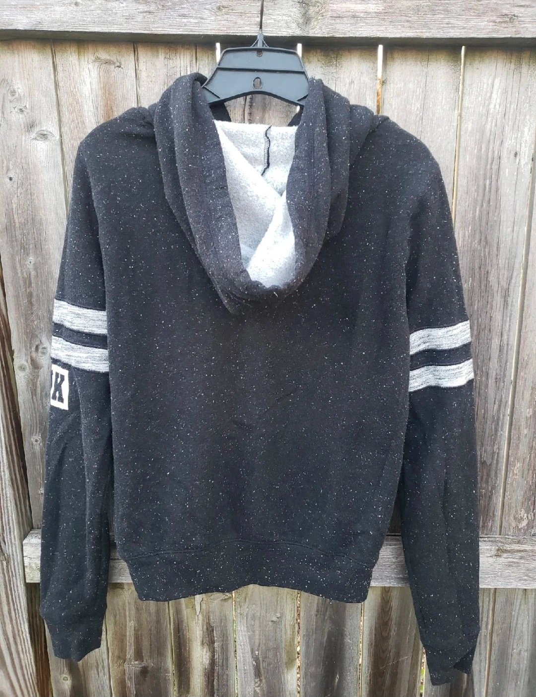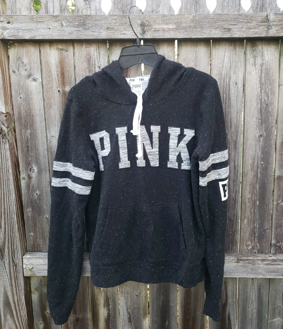Victoria's Secret PINK brand hooded sweatshirt. Black with white speckles throughout and 'PINK' graphic on the front. Features a drawstring hood and a front pouch pocket. Striped detailing on the sleeves.