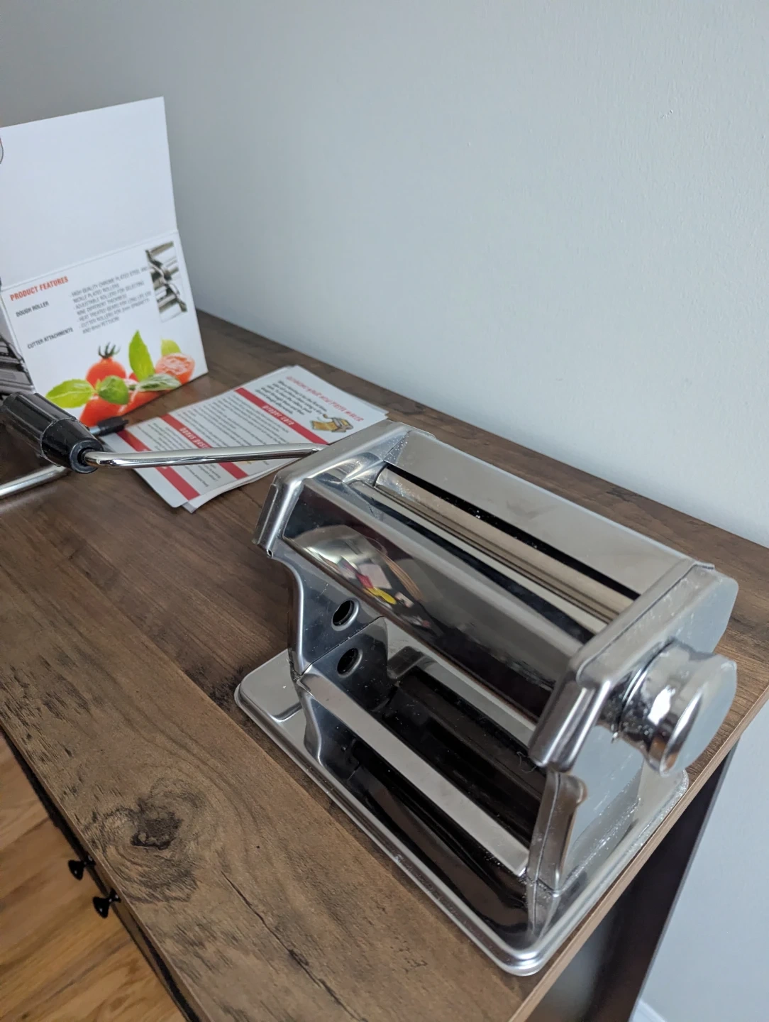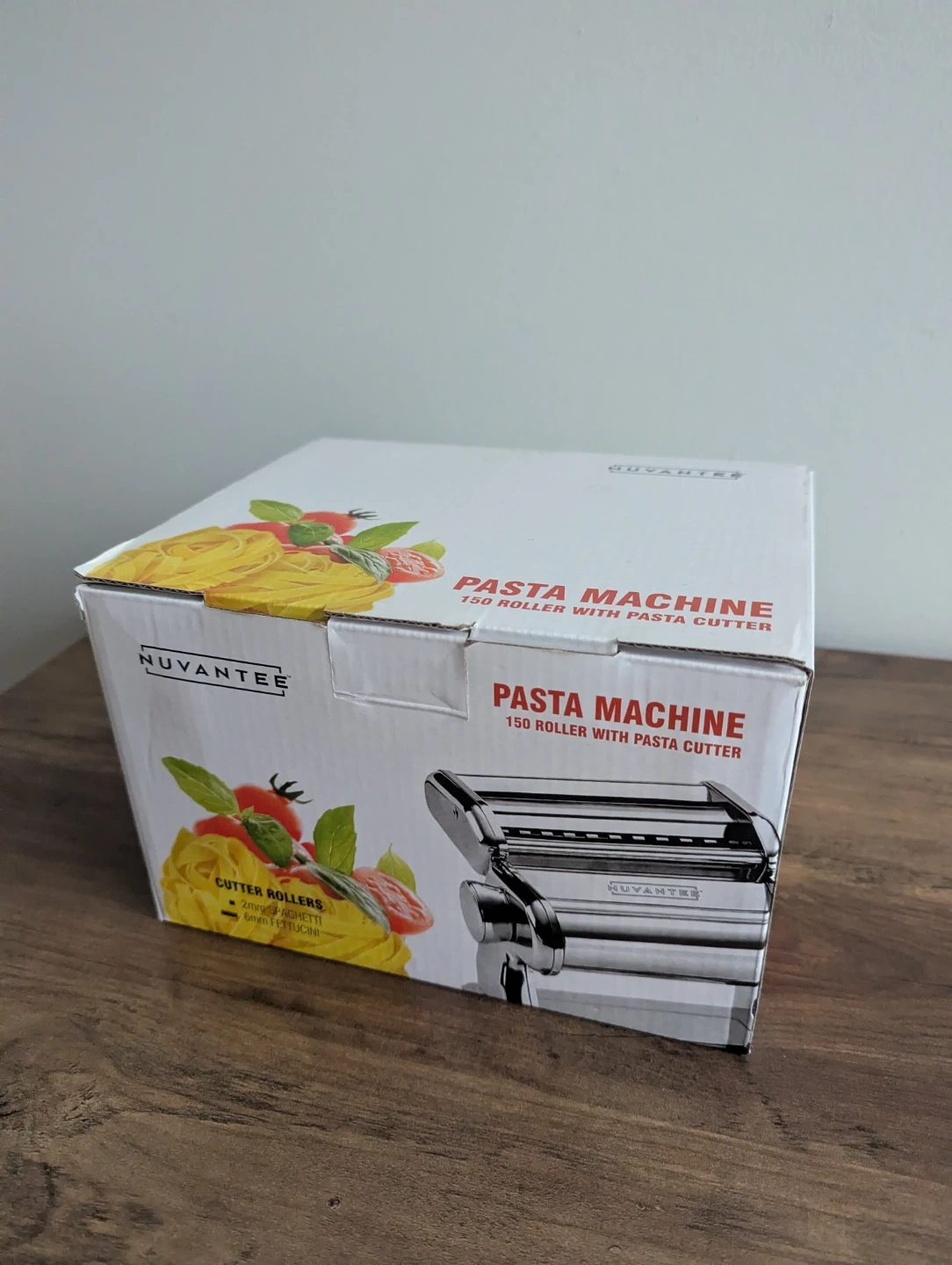 Make fresh pasta at home with this Nuvantee pasta machine. It's a 150 roller with a built-in pasta cutter. Includes cutters for fettuccine and spaghetti. Works very smoothly, I'm sadly parting ways because I'm moving.