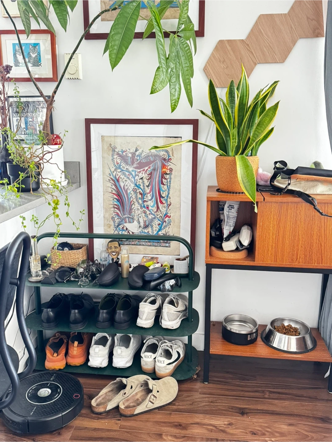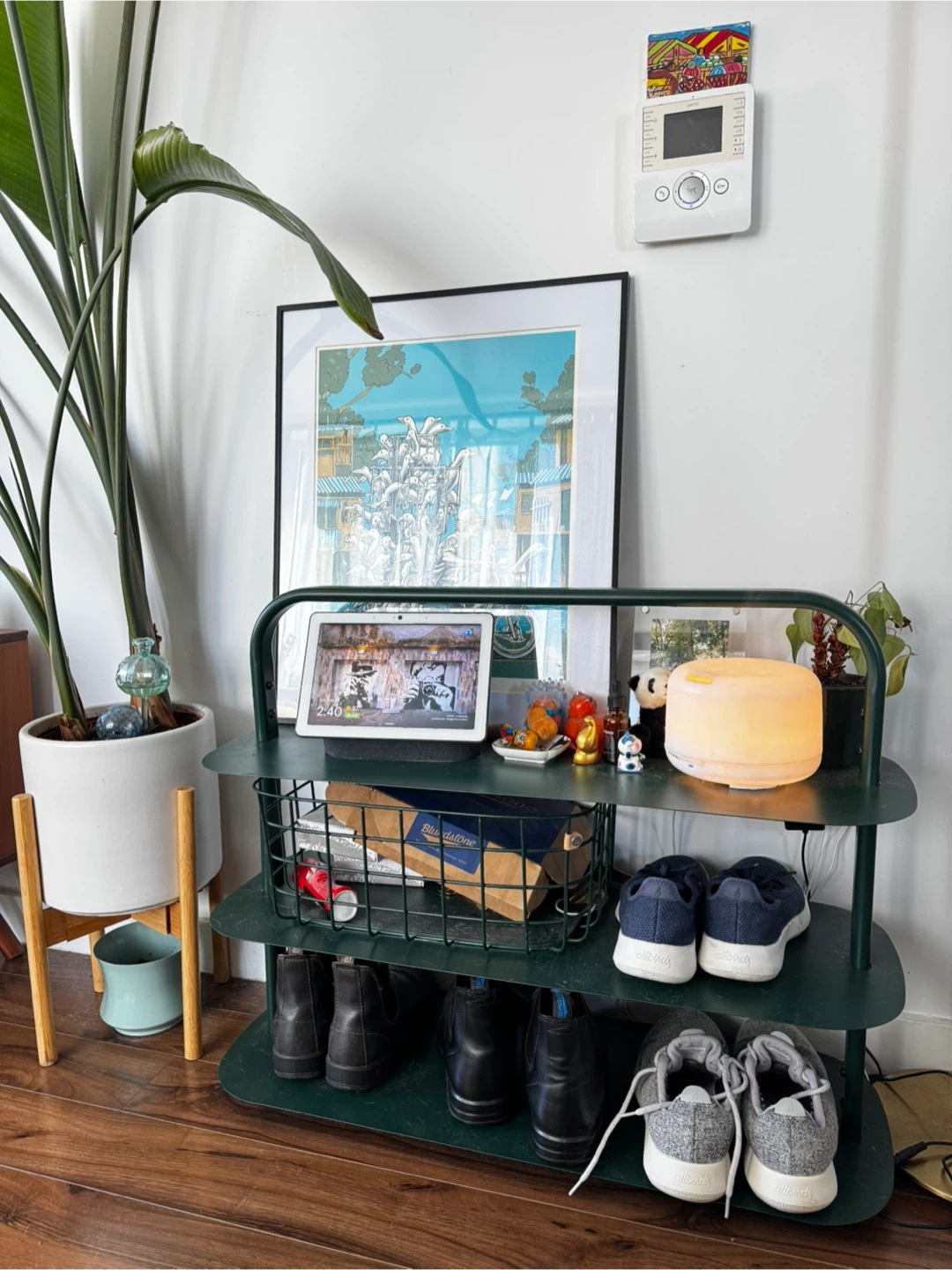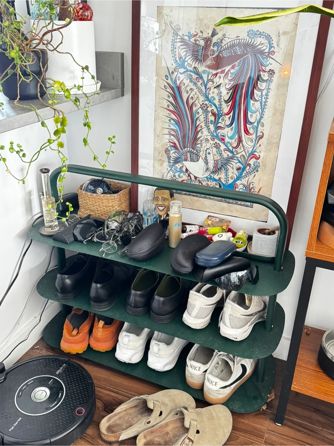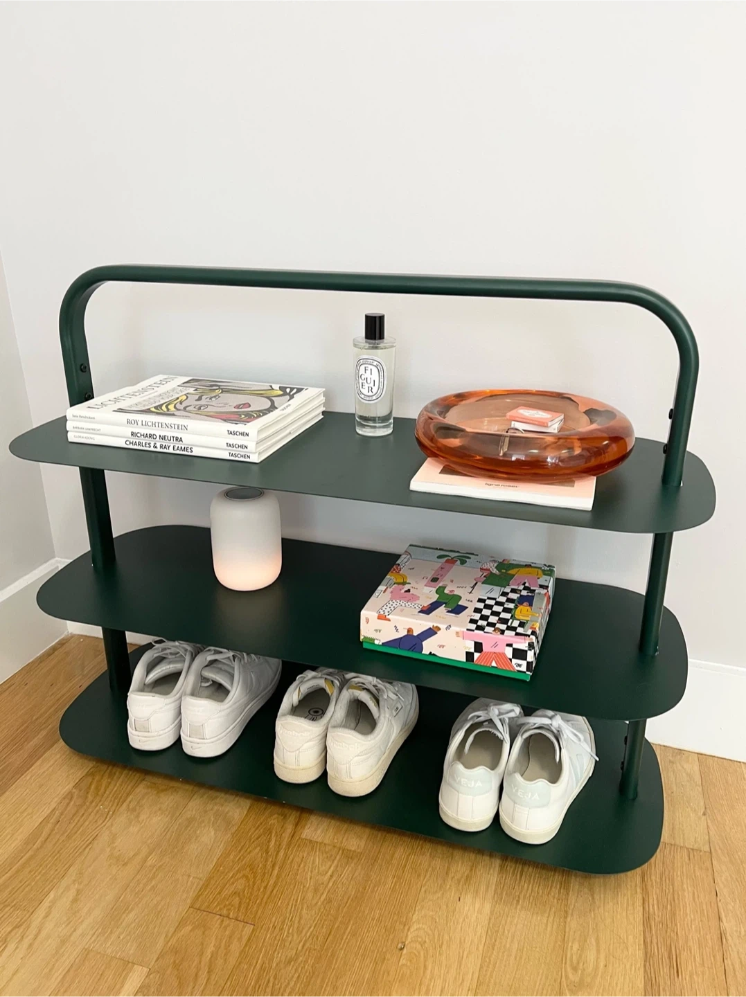 Selling a green metal shoe rack! It's in great condition and perfect for organizing your shoes. It has multiple tiers, providing ample space for your footwear collection as well. Originally retail value from Open spaces was 200 per shoe rack.
