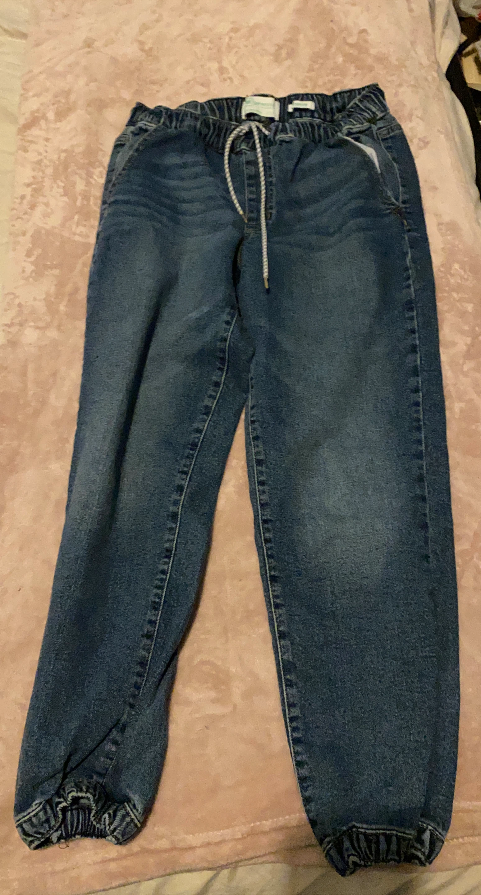 These are a pair of denim jogger pants from Opus. They have an elastic waistband with a drawstring and elastic cuffs at the ankles. The pants are in great condition and ready for a new home!