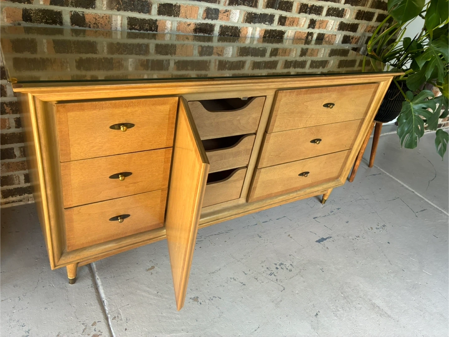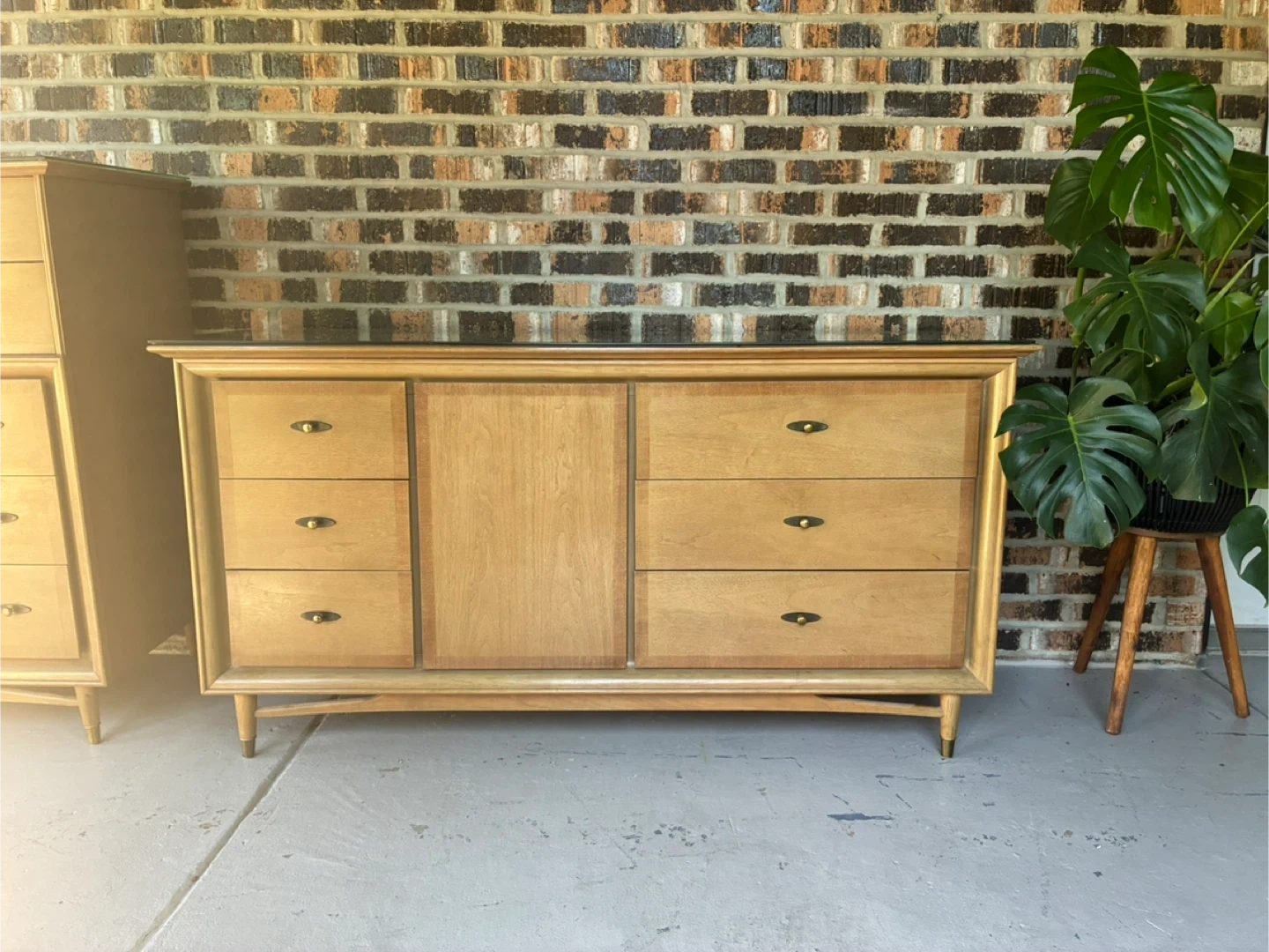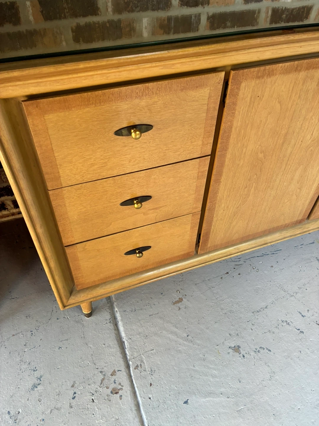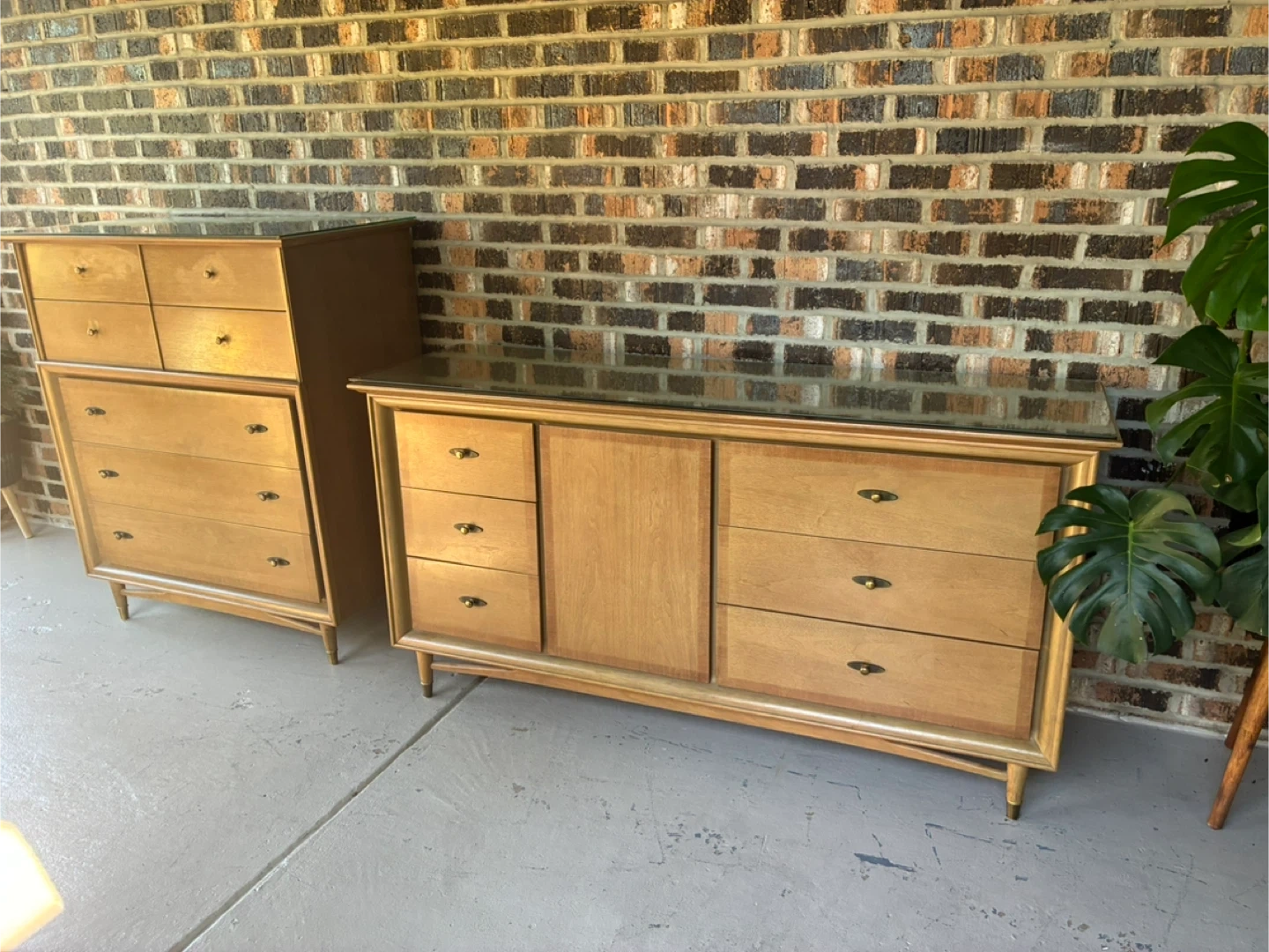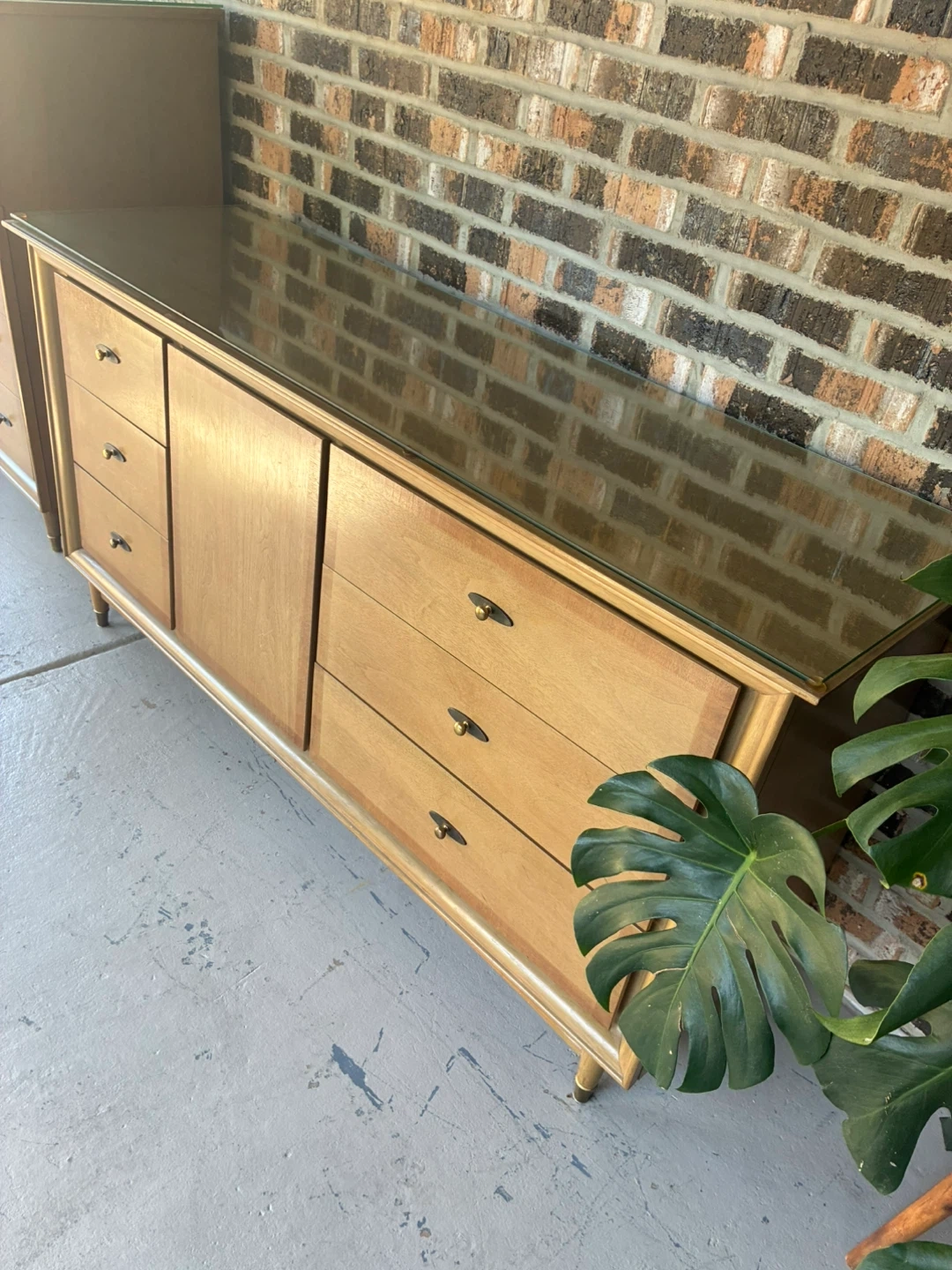 Mid century modern blonde Kroehler furniture dressers. Drawers slides smoothly with brass hardware. Both comes with glass on the top . Matching mirror available for free . Small nicks and discoloration due to age and use, overall in good vintage condition.