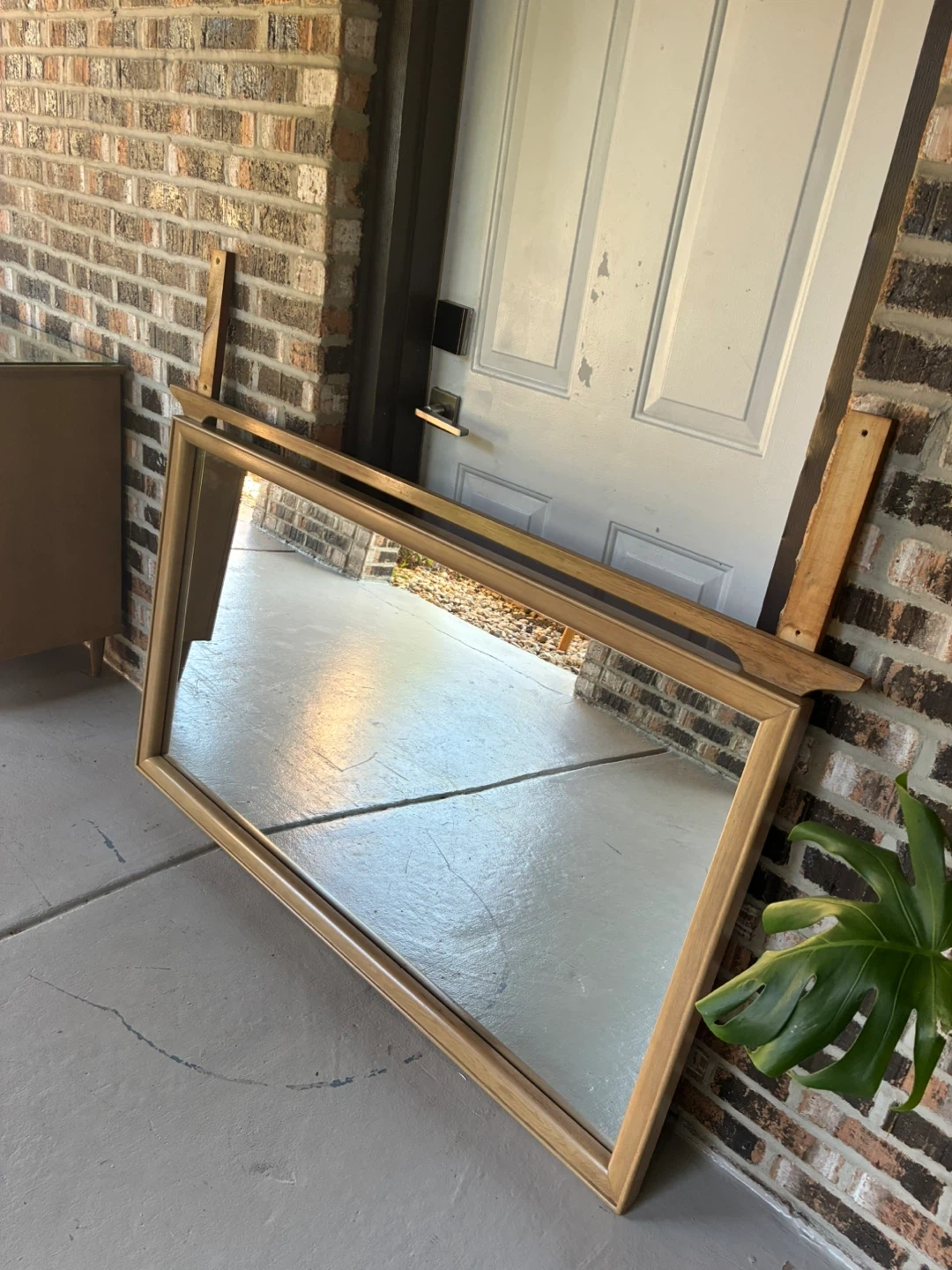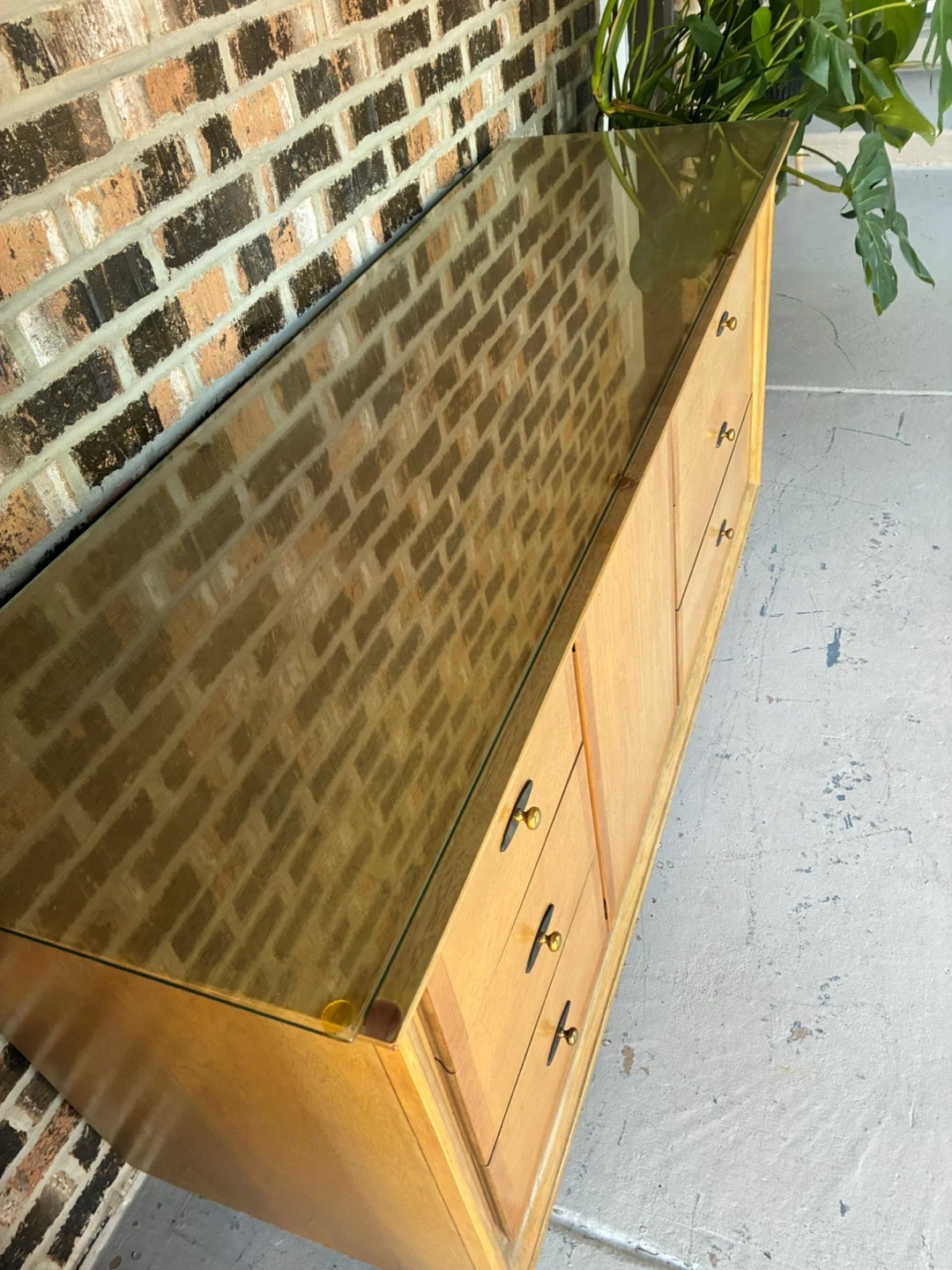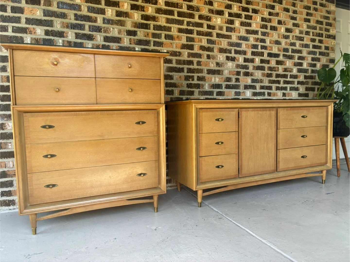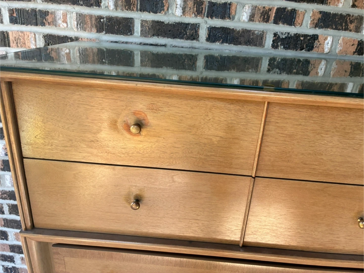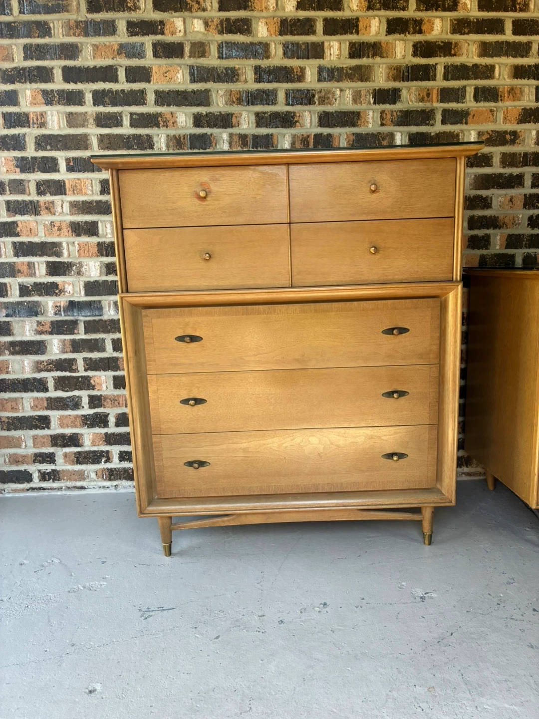 Mid century modern blonde Kroehler furniture dressers. Drawers slides smoothly with brass hardware. Both comes with glass on the top . Matching mirror available for free . Small nicks and discoloration due to age and use, overall in good vintage condition.