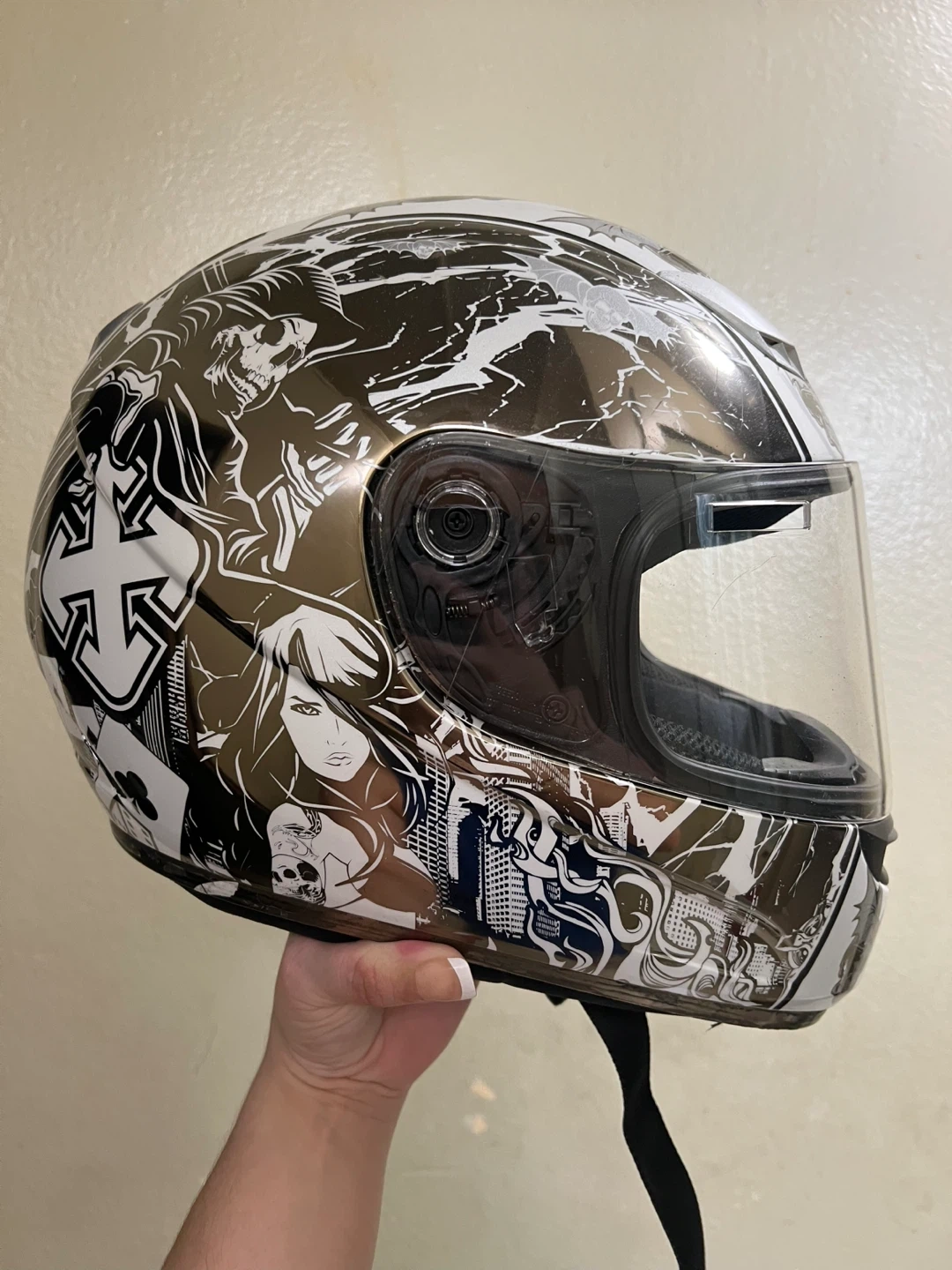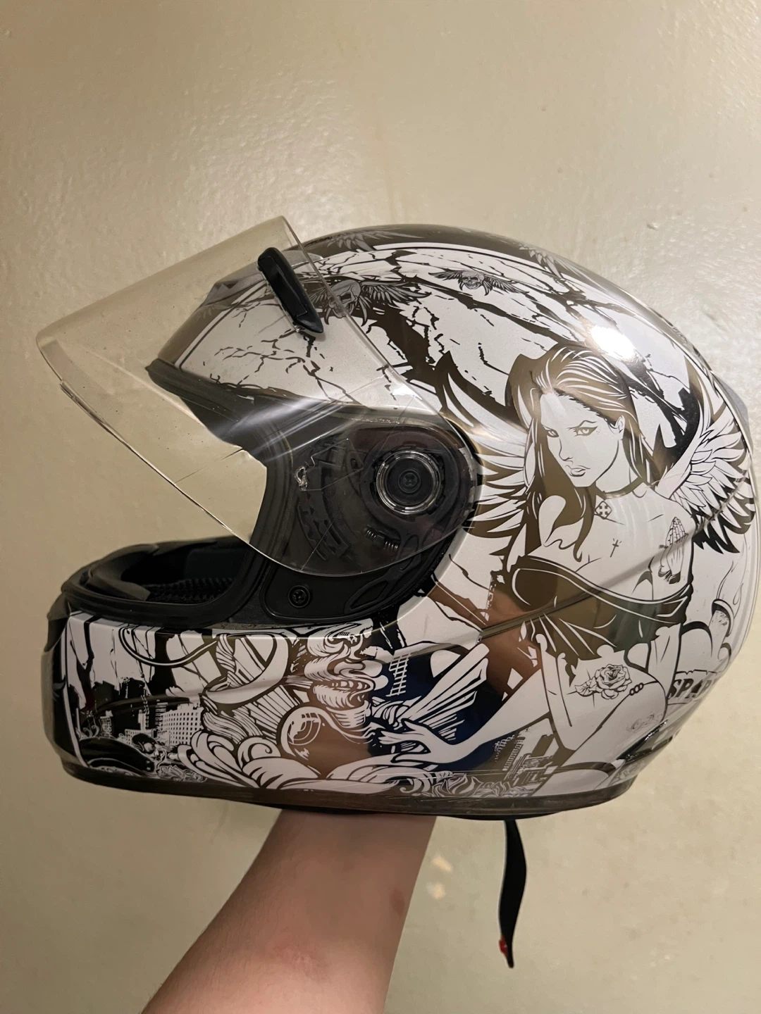 Thrifted SparX brand “Good v Evil” S-07 motorcycle helmet in a size SMALL. There’s some slight cracking and a missing piece on the right side of the face shield. The chin buckles are fully functional