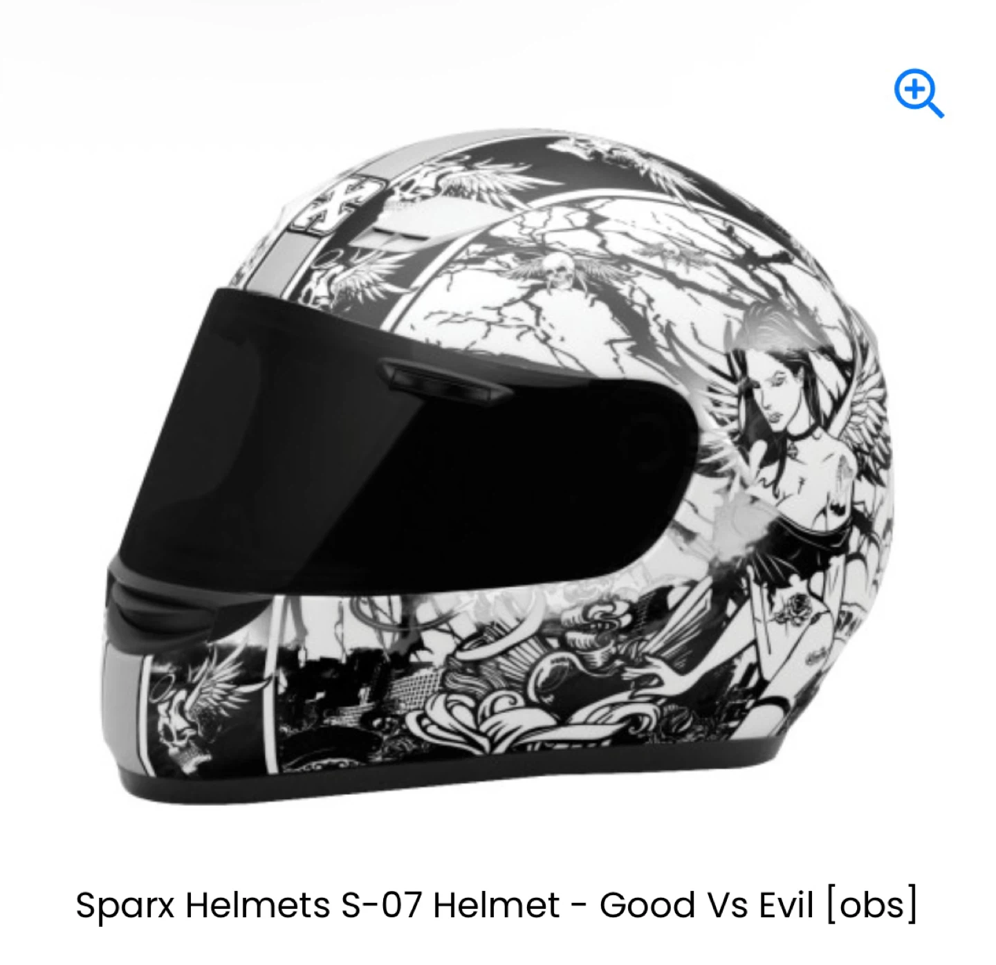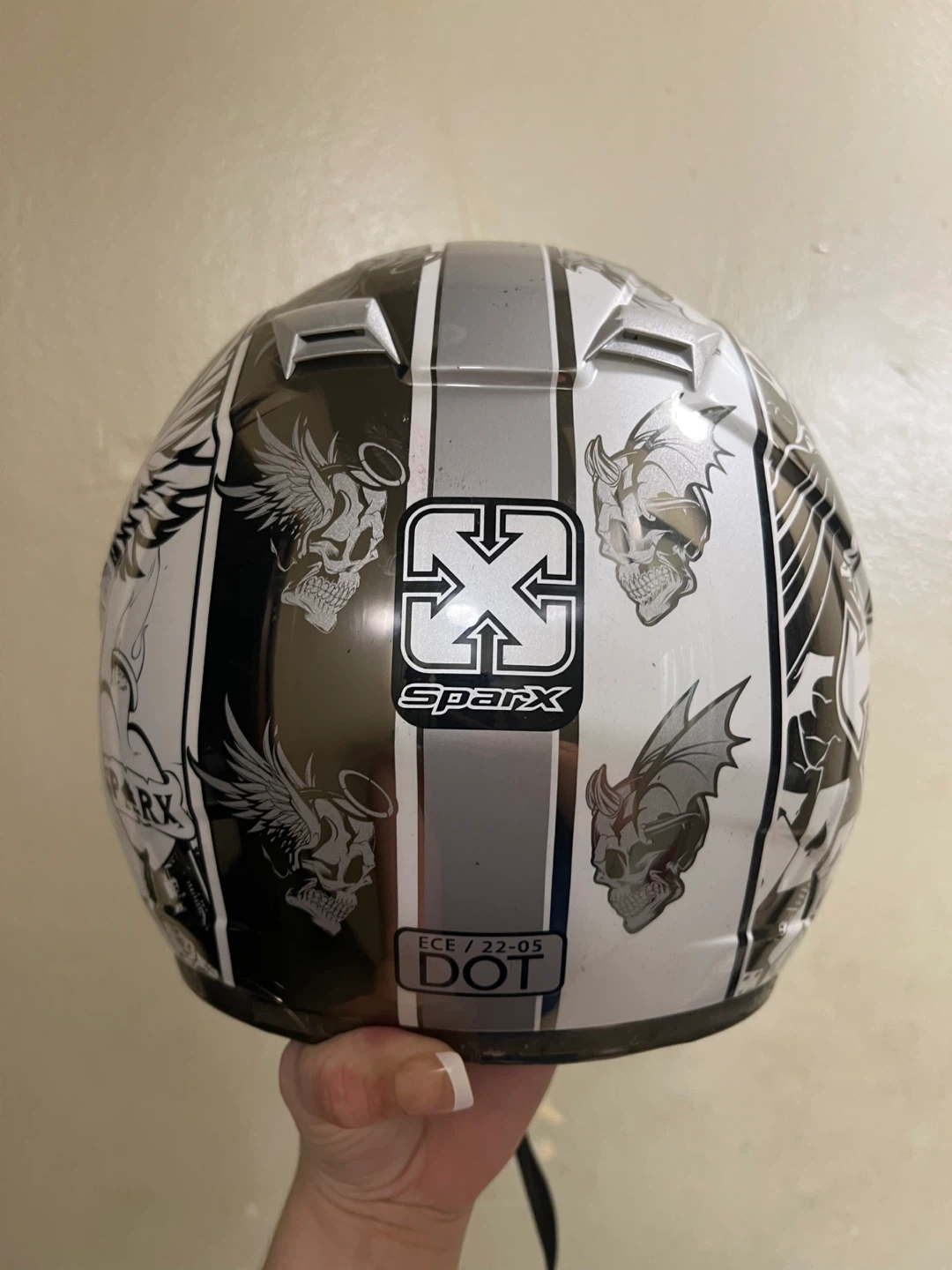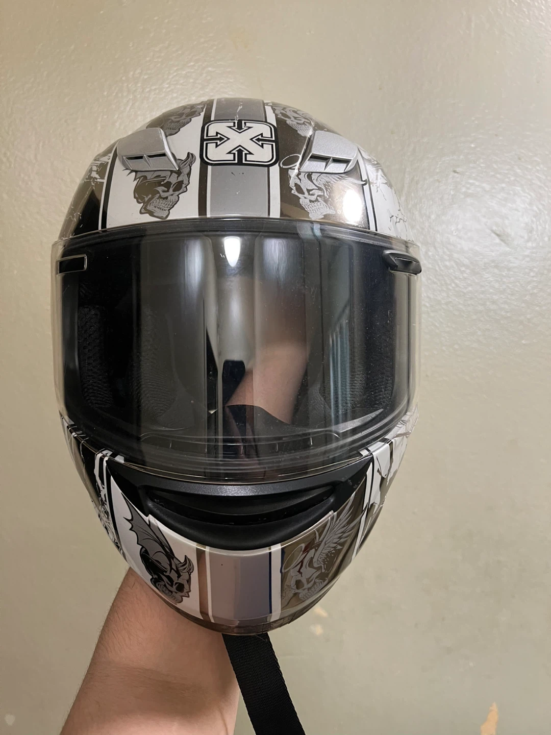 Thrifted SparX brand “Good v Evil” S-07 motorcycle helmet in a size SMALL. There’s some slight cracking and a missing piece on the right side of the face shield. The chin buckles are fully functional