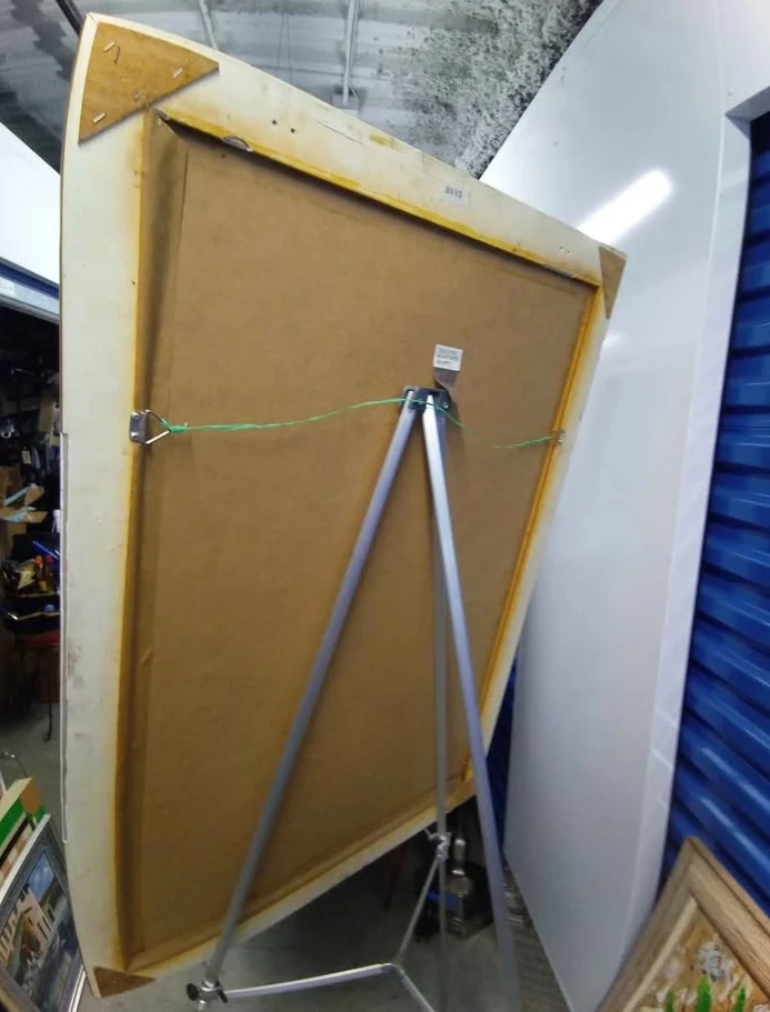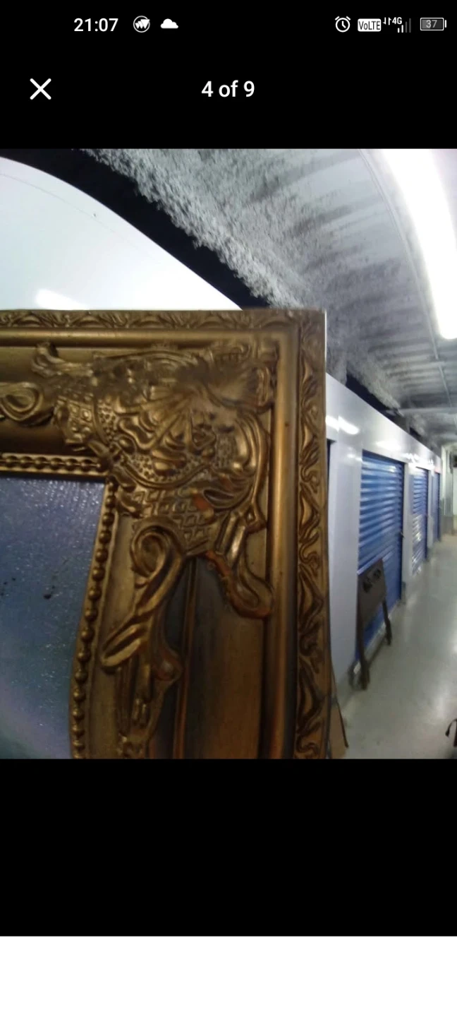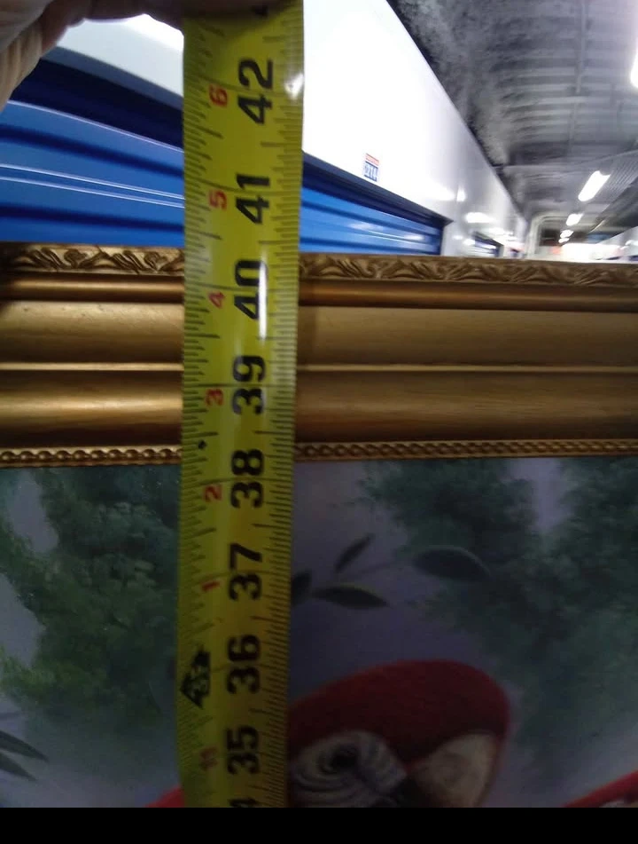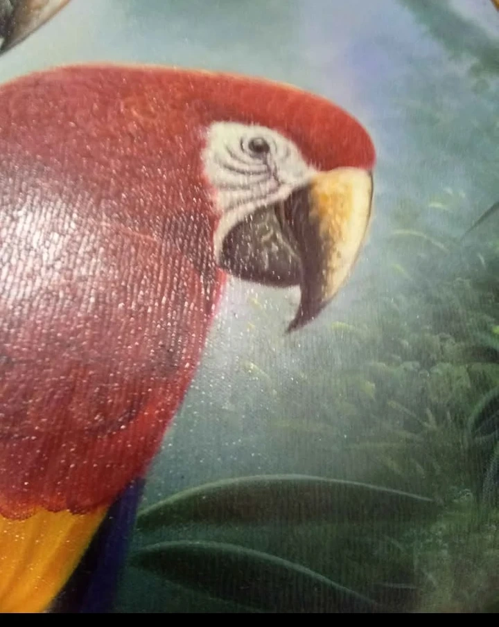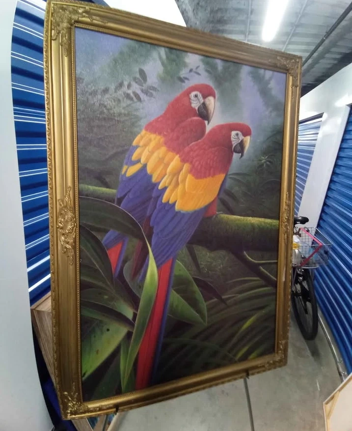 This is a framed painting featuring two vibrant macaw parrots perched on a branch amidst lush foliage. The frame has an ornate gold finish and some minor chips. It's a striking piece that brings a touch of the tropics to any room. The painting measures approximately 24x36 inches, including the frame.