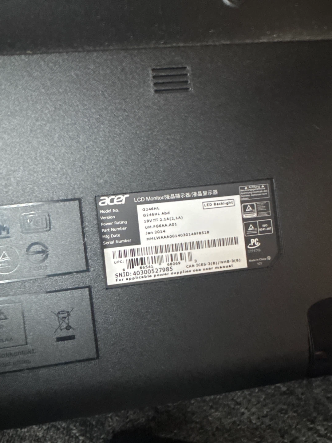 1 / 31 / 3Buy & SellAcer G246HL LCD MonitorAcer G246HL LCD Monitor$32This is an Acer G246HL LCD monitor. It's a 24-inch screen. The manufacturing date is January 2014.ConditionOkayBrandAcerWHERE TO MEET69th st and 38th aveView MapSELLERverifiedAlenaWoodside700 reviews1 chatsΒ·0 favoritesΒ·33 viewsSEND CHAT TO SELLERHi Alena! Iβm interested in your listing.Hi Alena! Iβm interested in your listing.Get the Karrot app to chatSign In to chat