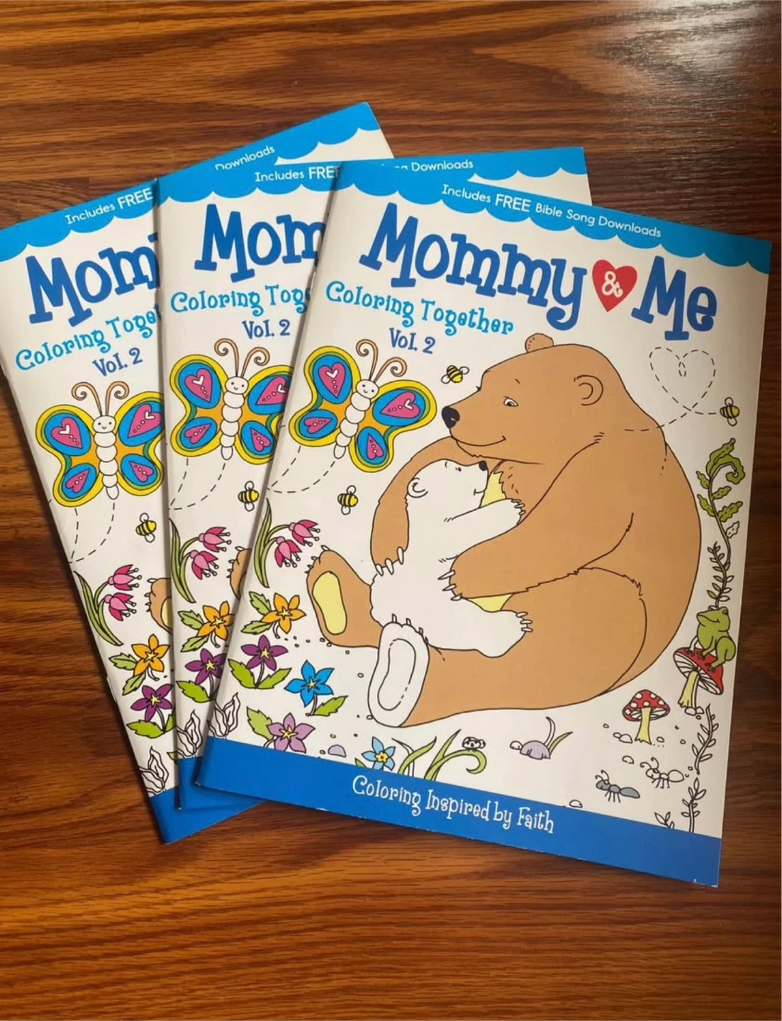 These are three 'Mommy & Me Coloring Together Vol. 2' coloring books. They include free Bible song downloads. Coloring inspired by faith!