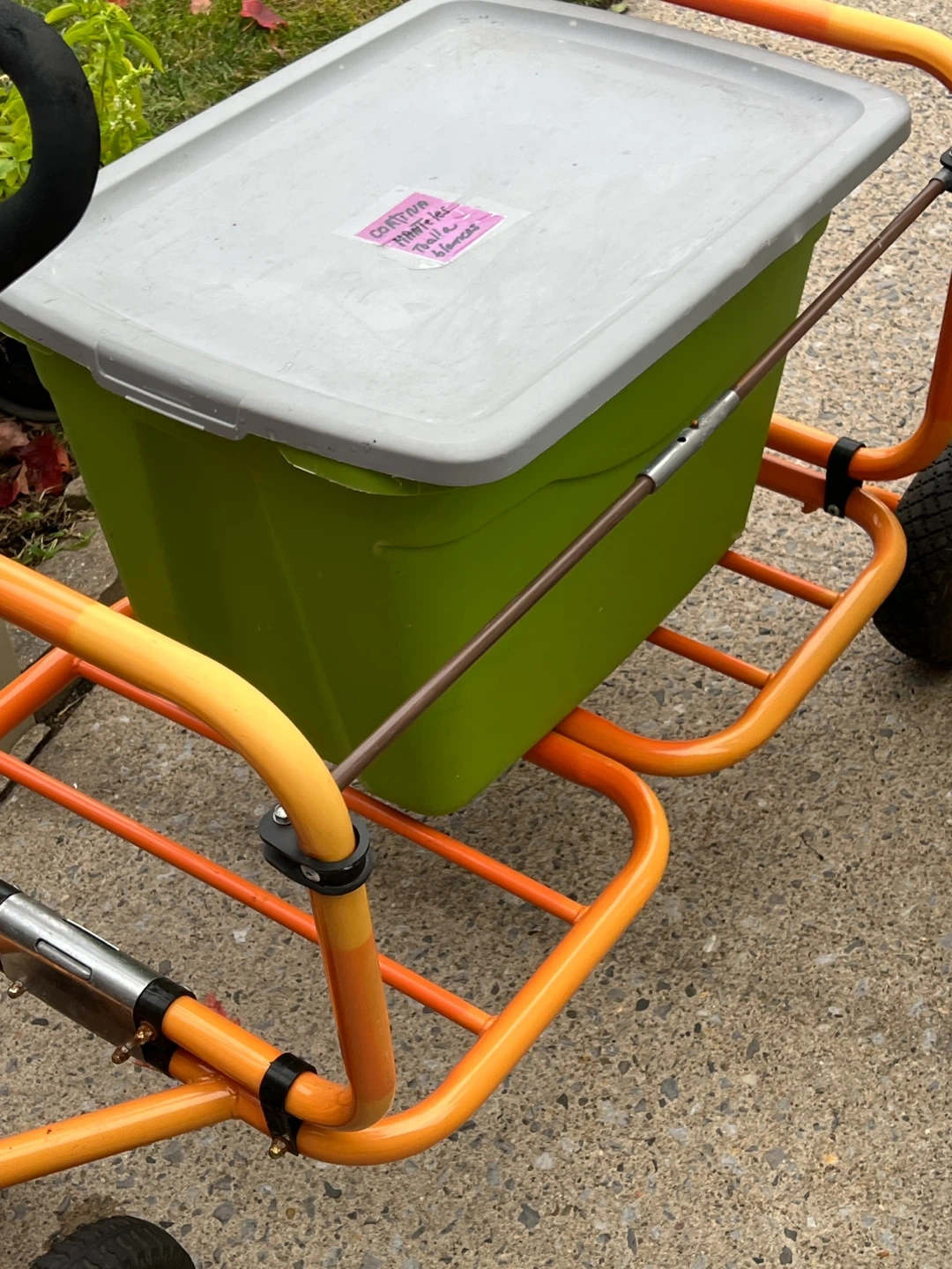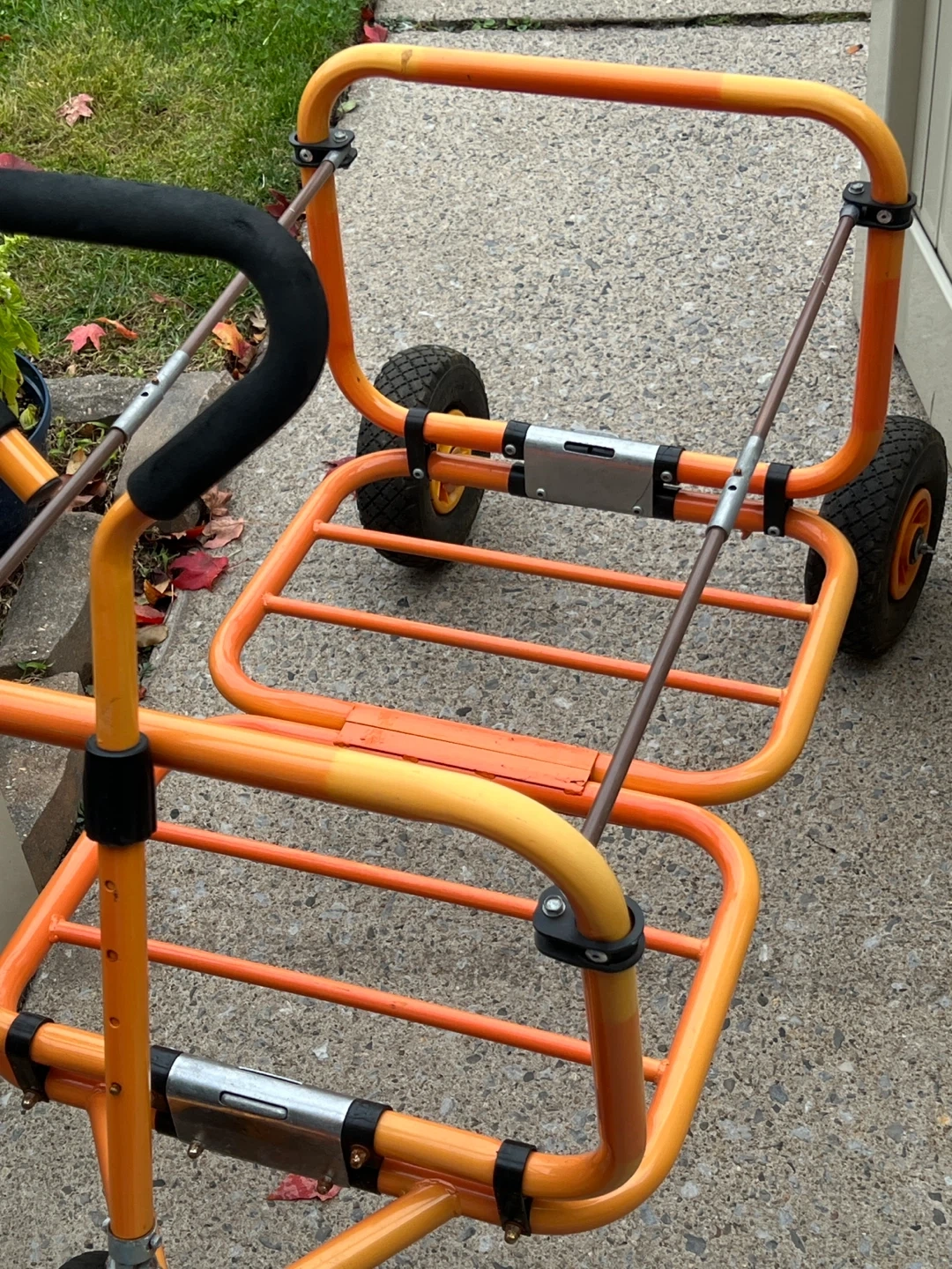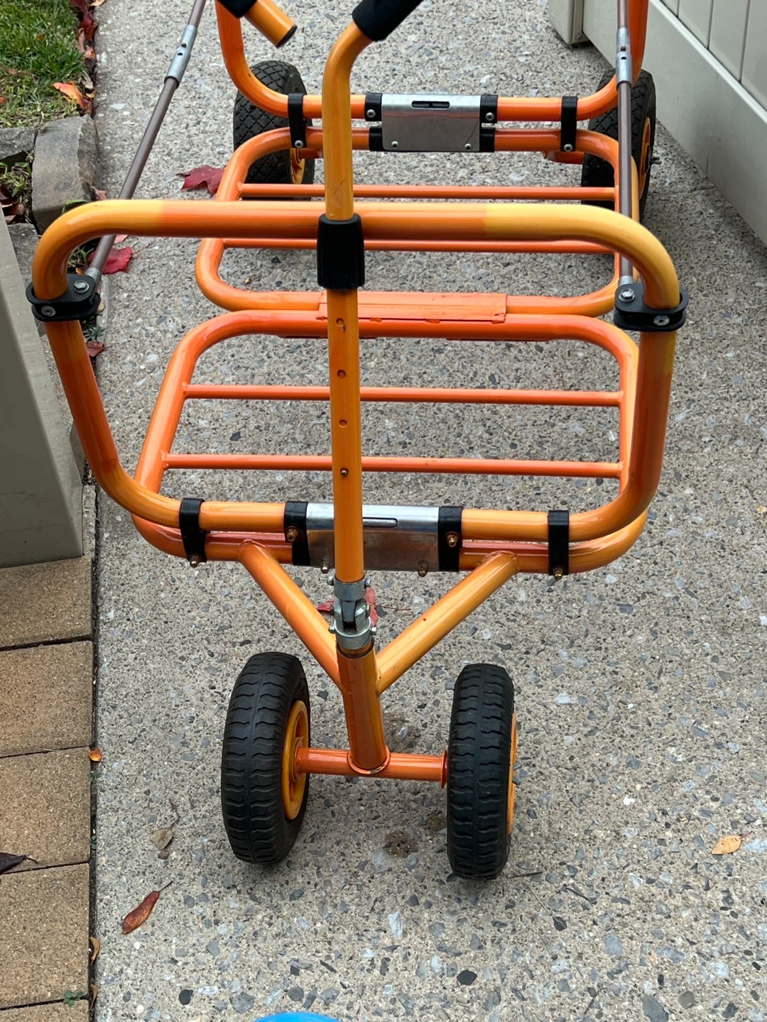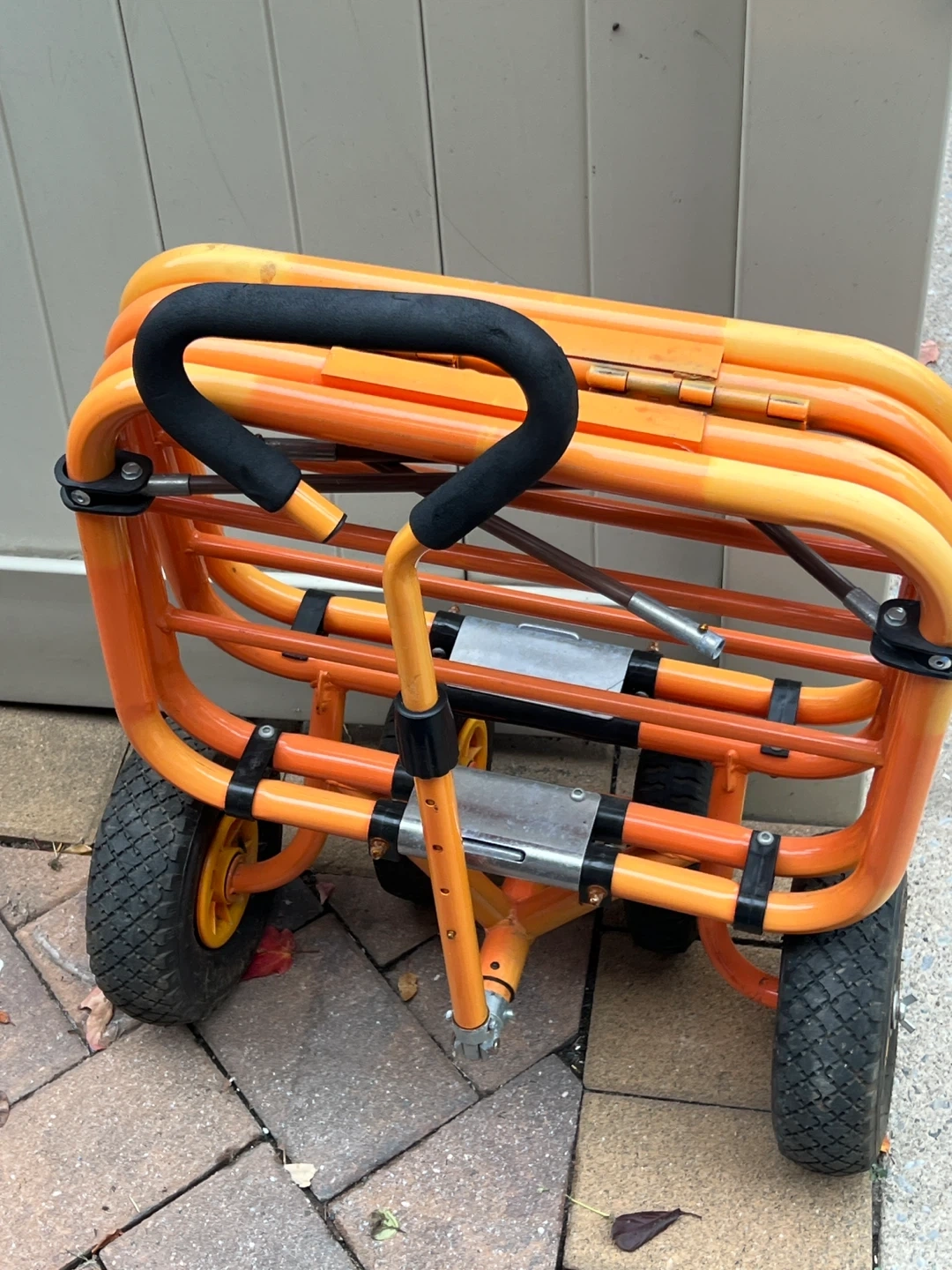 64Selling an orange folding wagon cart! It's in good condition and perfect for carrying items around the yard or garden. It folds up for easy storage too