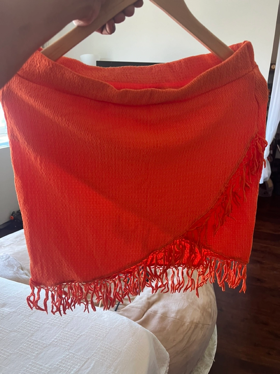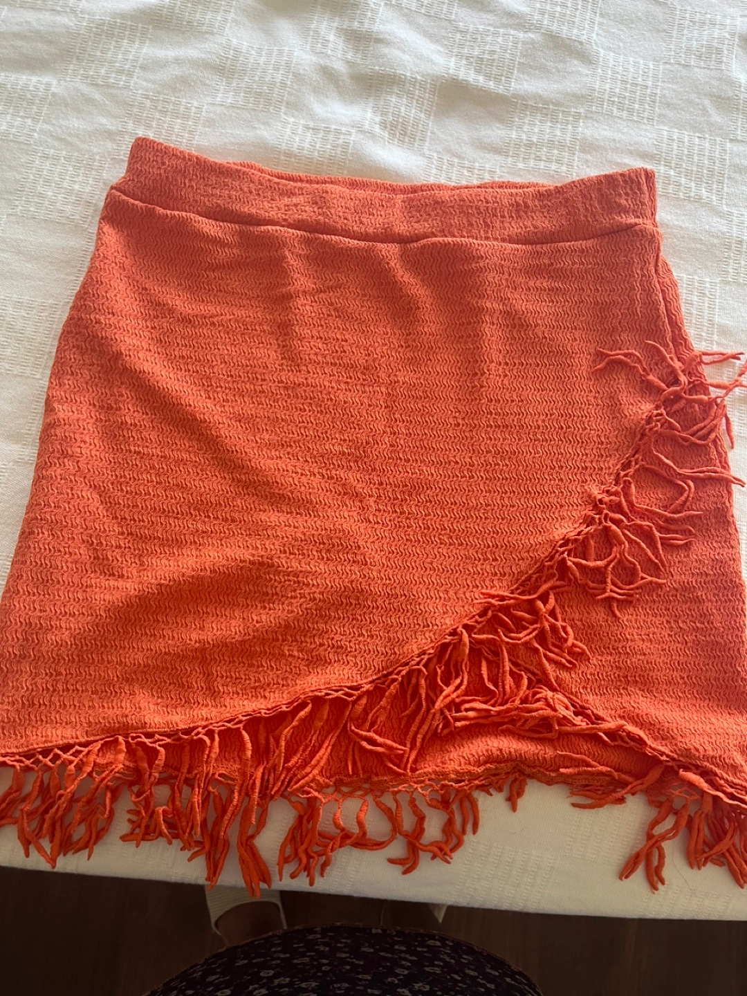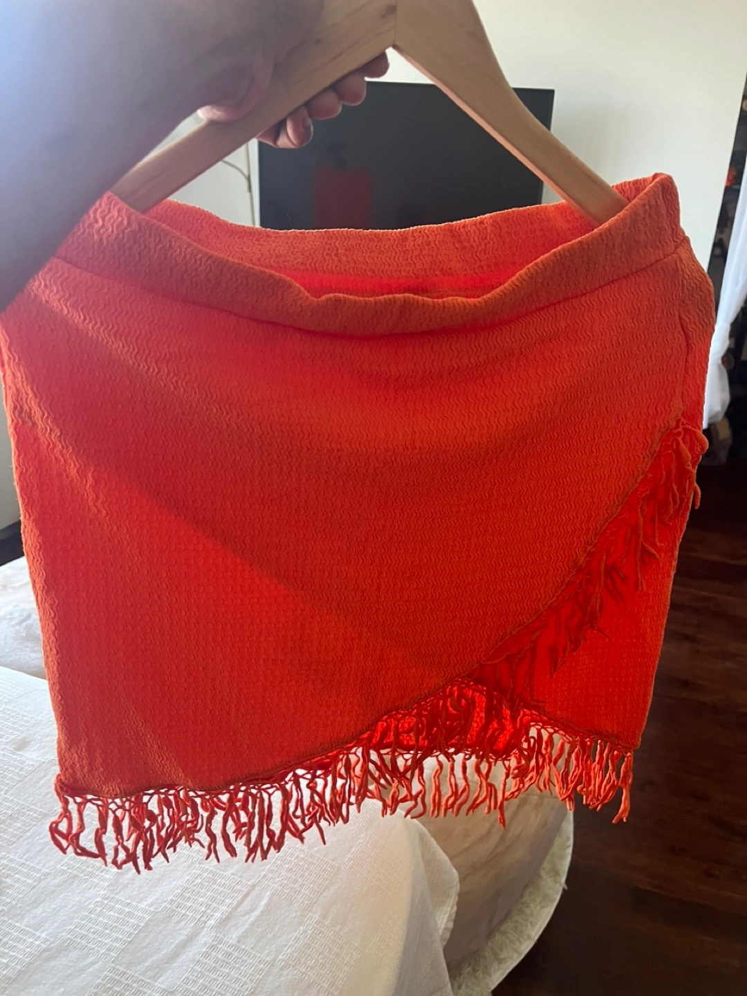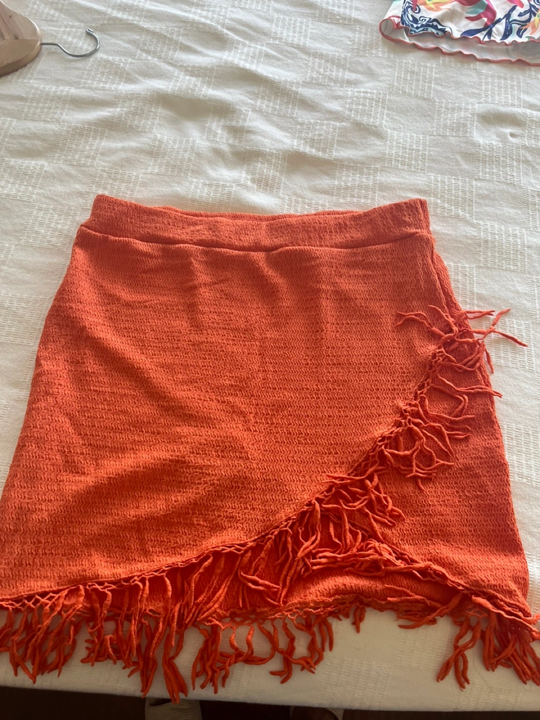 Cute orange mini skirt with fringe detail! It's perfect for summer outings or adding a pop of color to your wardrobe. The skirt is in great condition and ready for a new home. Pre-washed and never worn