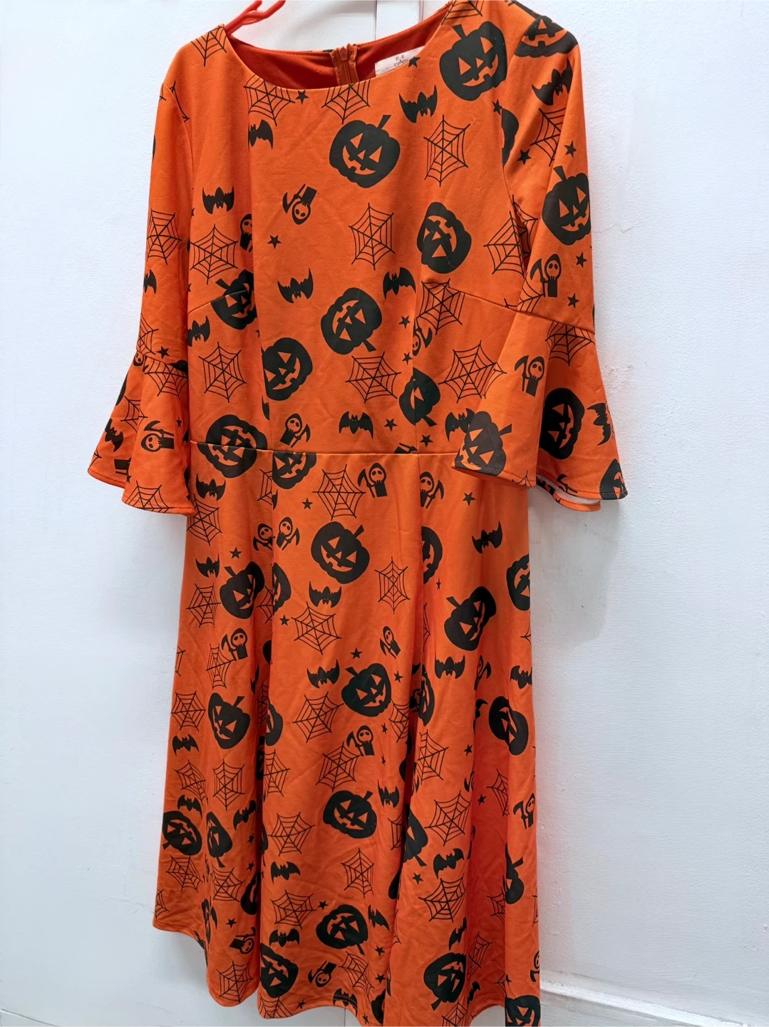 10Selling a fun orange dress with a Halloween print! It features pumpkins, bats, spiderwebs, and ghosts. Perfect for the spooky season