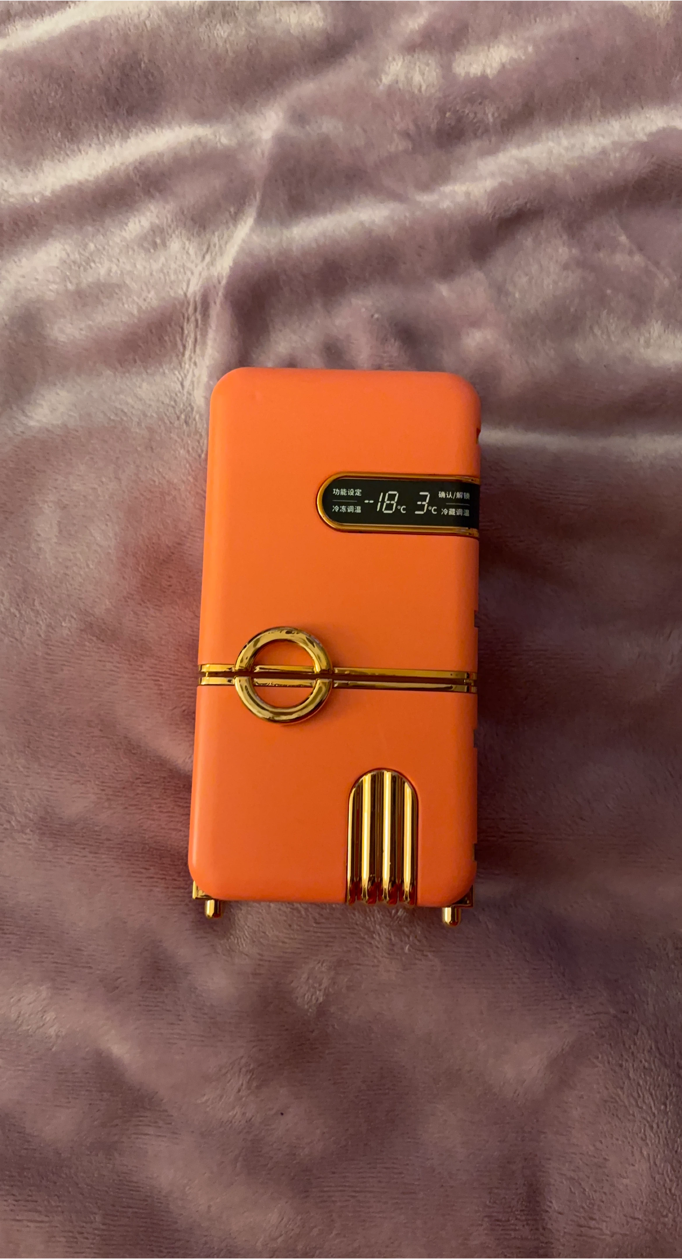12This is an orange mini fridge. It features a digital display showing the temperature. It's a fun and functional item! This is a kids toy.