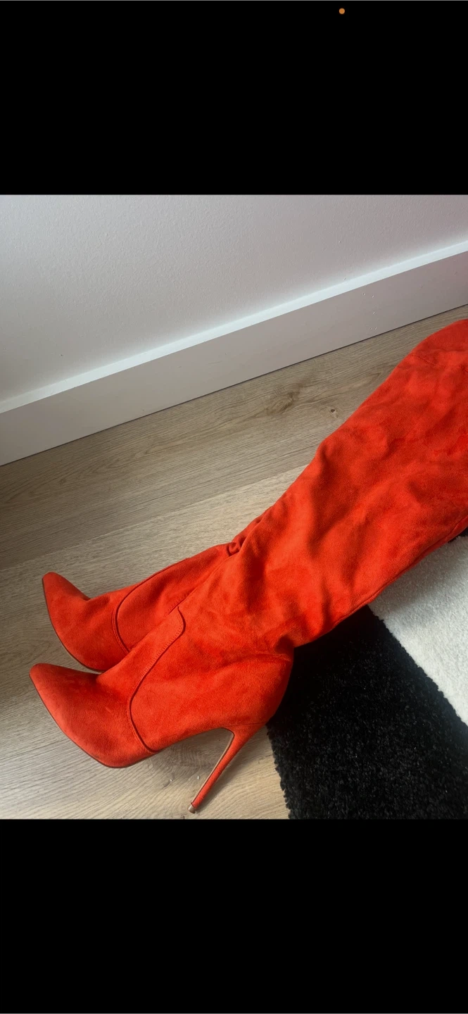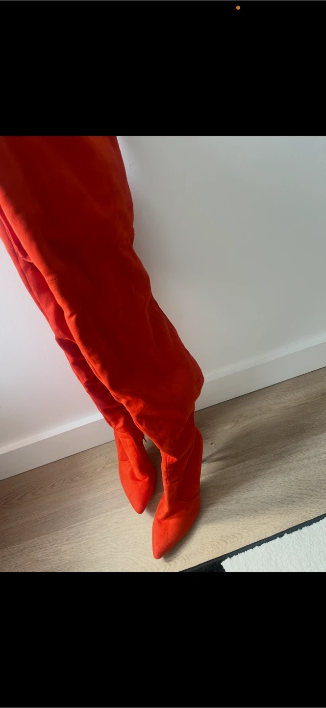 These are a pair of vibrant orange thigh-high stiletto boots. They are perfect for making a statement!