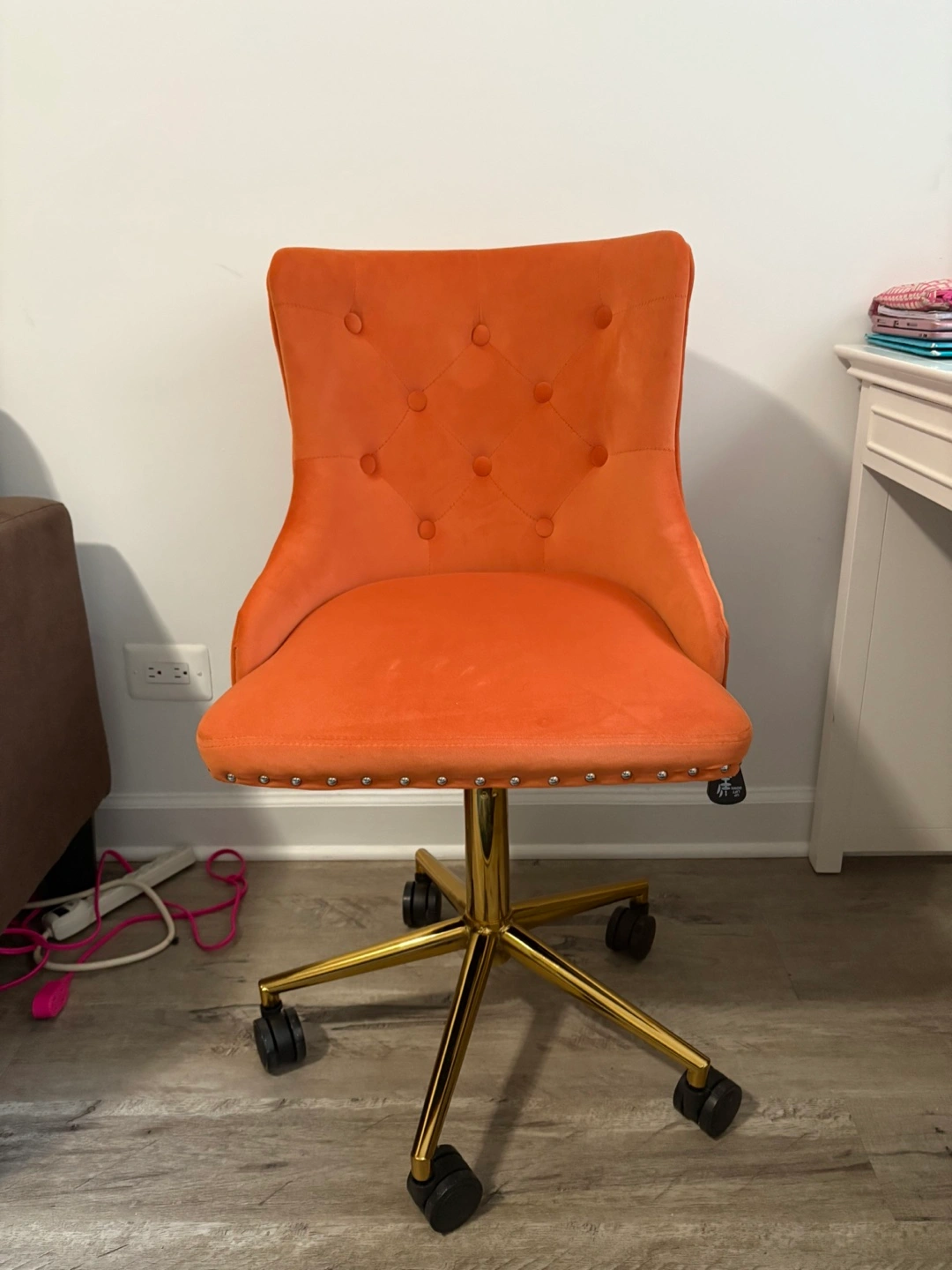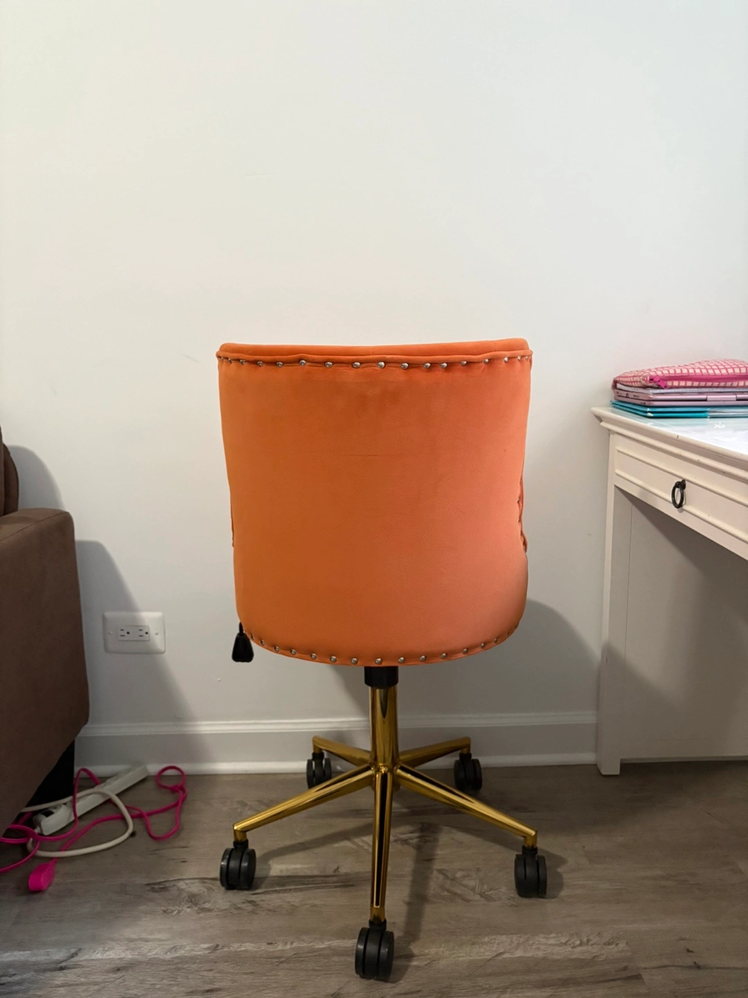 10Orange velvet chair. Features gold legs. Has rolling wheels. Great to sit in while you unwind after a long day.
