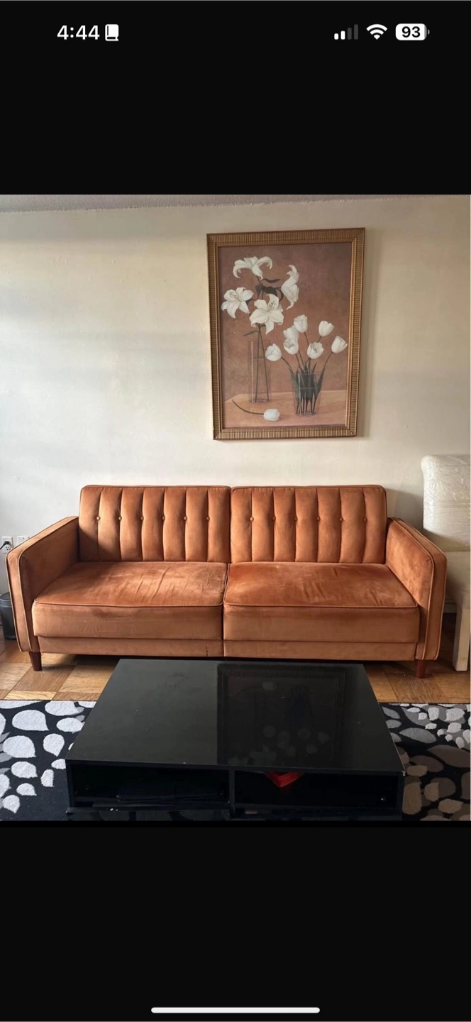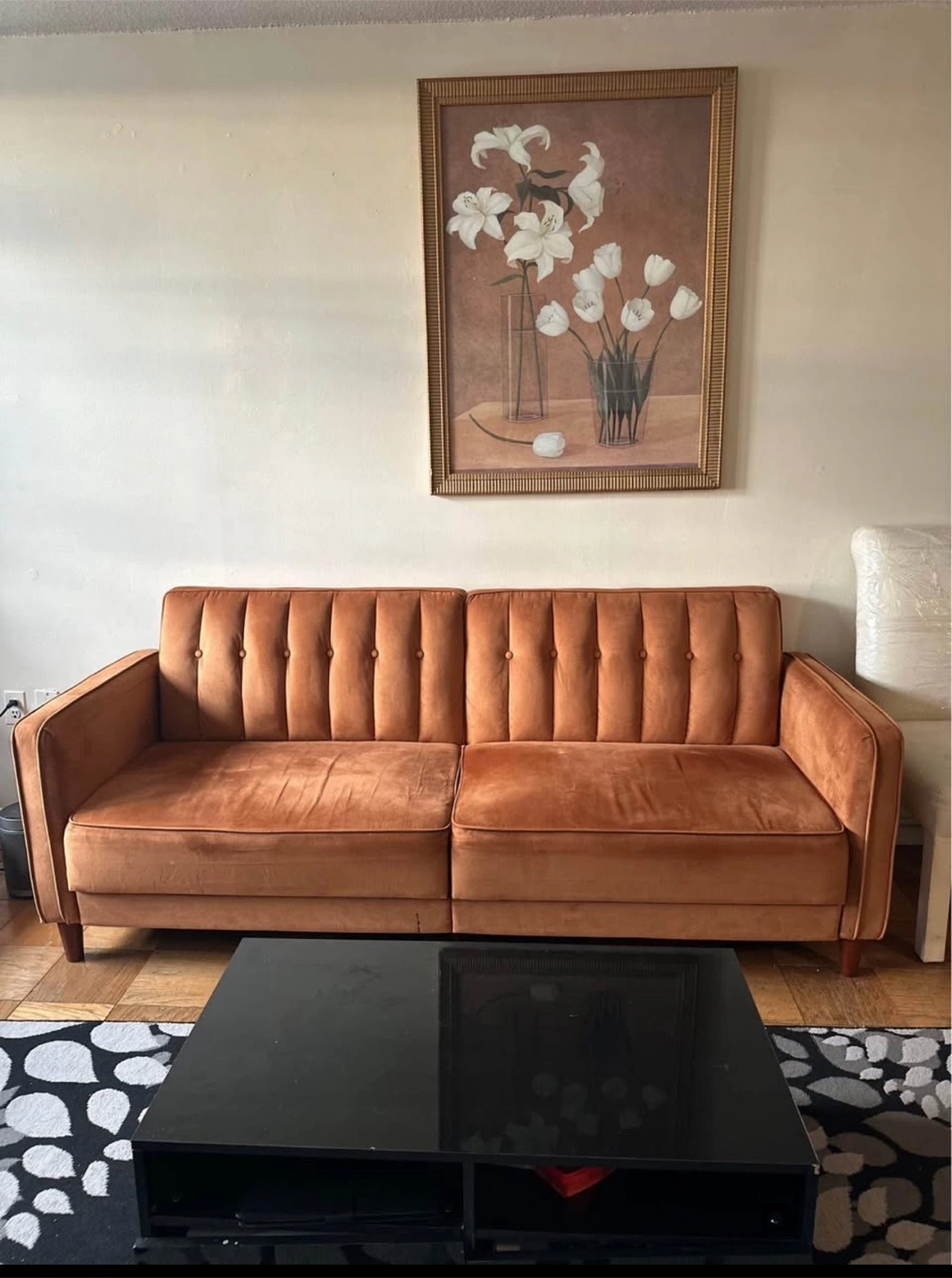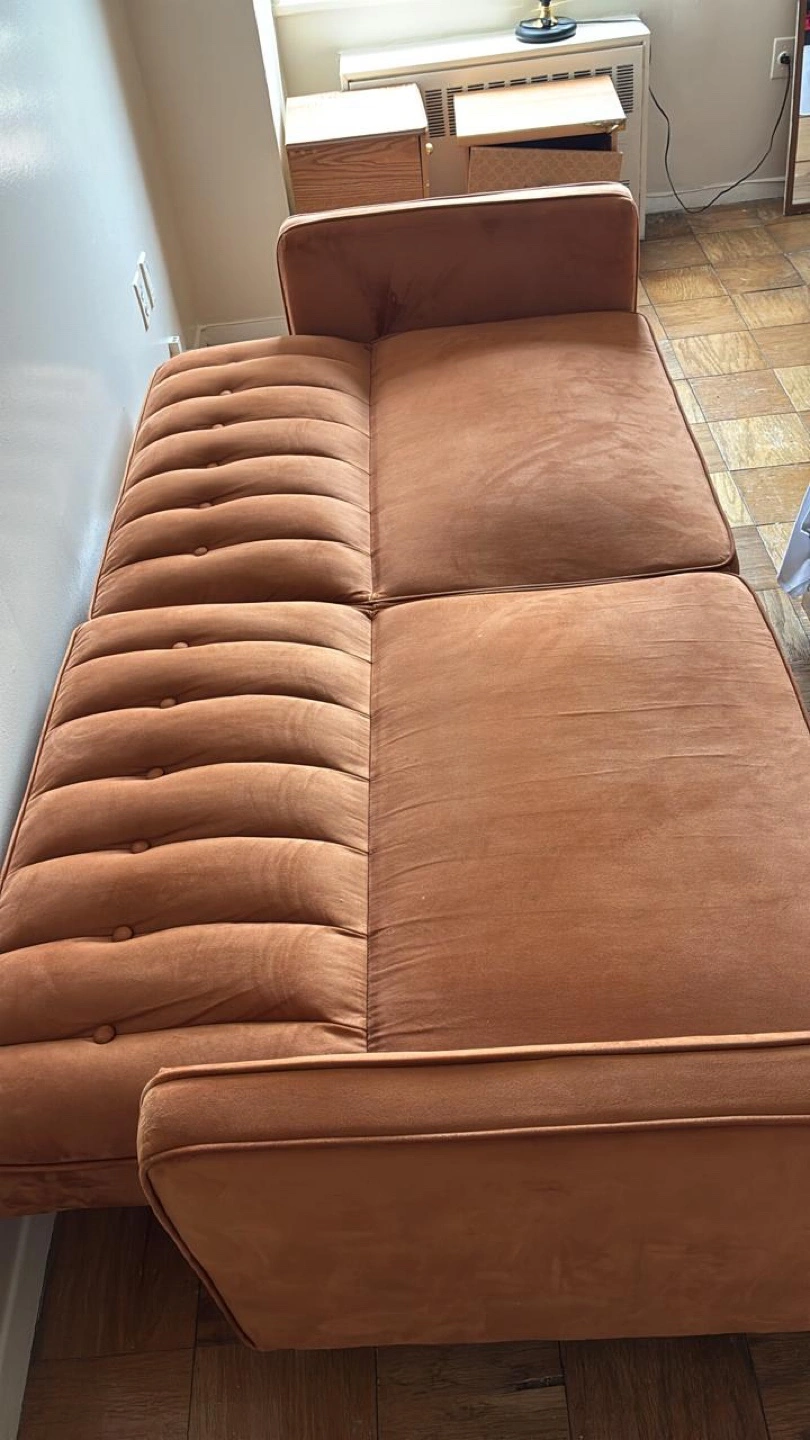 76Selling a stylish orange velvet sofa. It's in great condition and would add a pop of color to any living room. The velvet material is soft and comfortable, perfect for lounging!