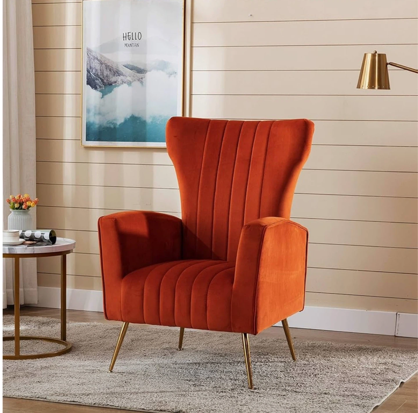 10This stylish orange velvet accent chair is perfect for adding a pop of color to any room! It features a high back design with vertical channel tufting, providing both comfort and visual appeal. The chair is supported by sleek, gold-tone metal legs, adding a touch of modern elegance. It's in great condition and ready to find a new home! It’s barely used (mostly my clothes were tossed over it) but my cat has been digging his claws on the side arm so it has tiny puncture holes - I’ll add photos - and the bottom paper-like cloth that covers how the legs screw in is torn up because I was using it without the legs) so it was sitting on some crates - no one can see that part tho. It’s the underbelly
