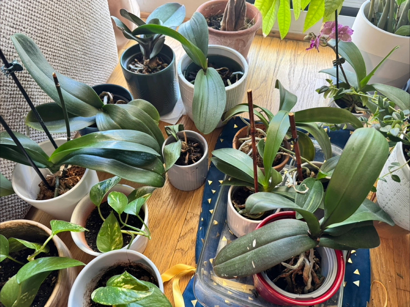 I accidentally collected too many of orchid plants and want to give away to a home that will take care of them. Several potted orchid plants, various sizes and stages of growth. Some plants have visible roots.