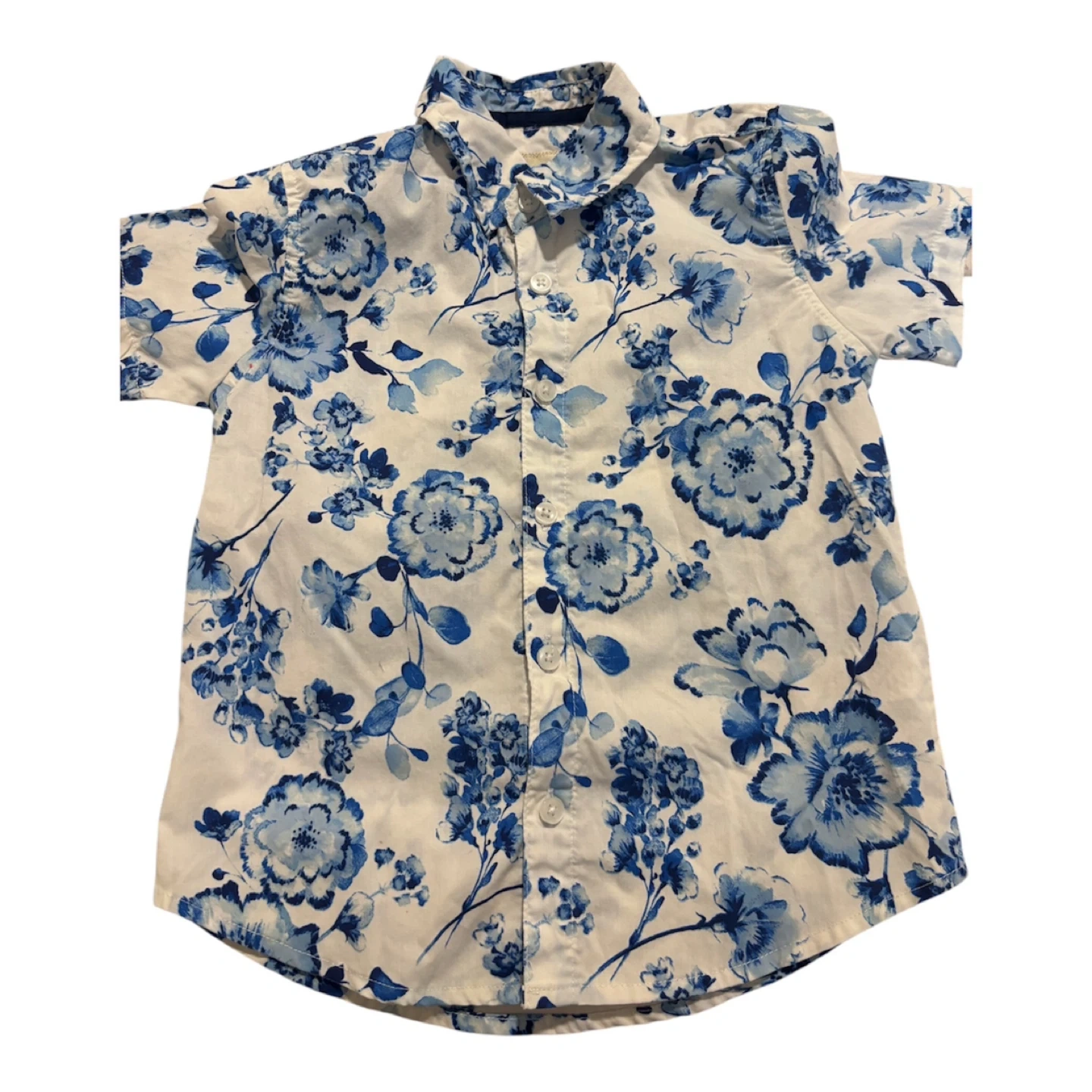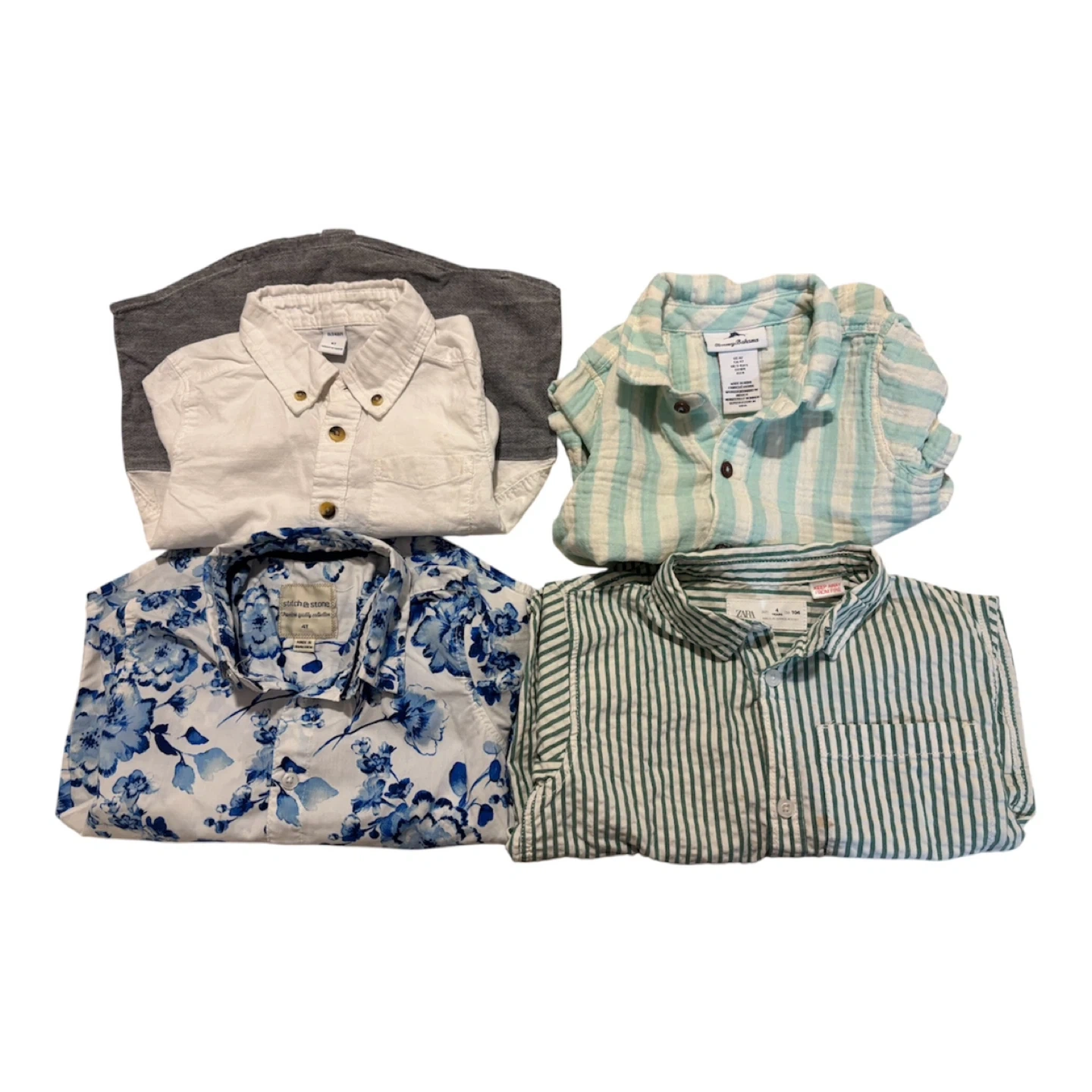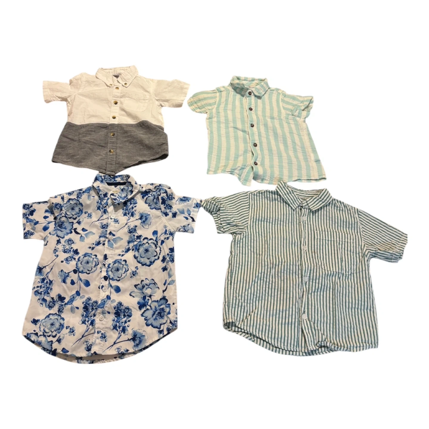 This set includes four boys' short sleeve button-down shirts. Two shirts feature stripes, one has a blue floral pattern, and one is a color-block design in white and grey. Made from breathable cotton. Great for warm weather outfits! One of the shirts has a small stain.