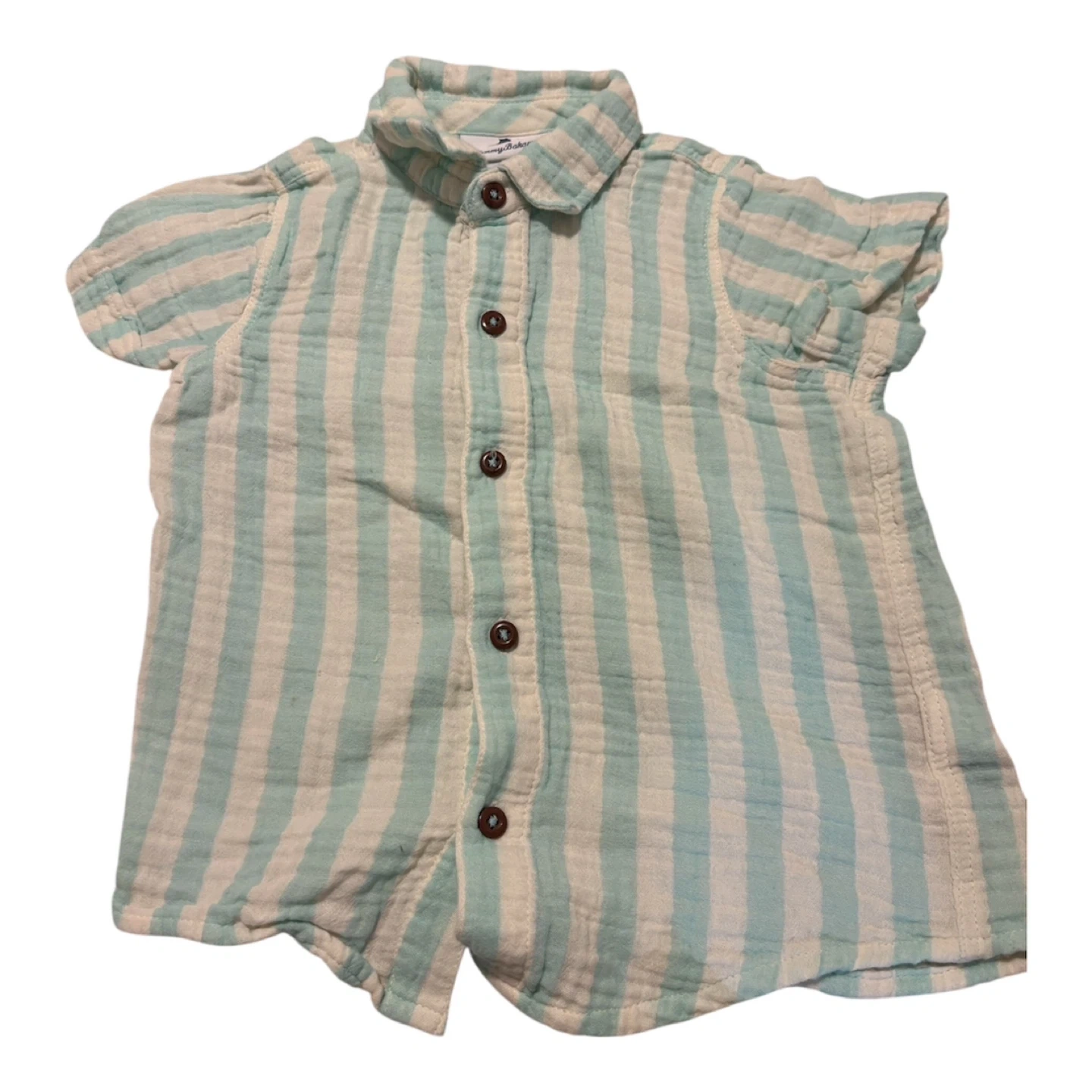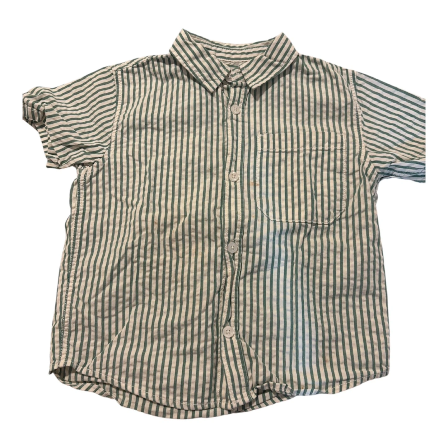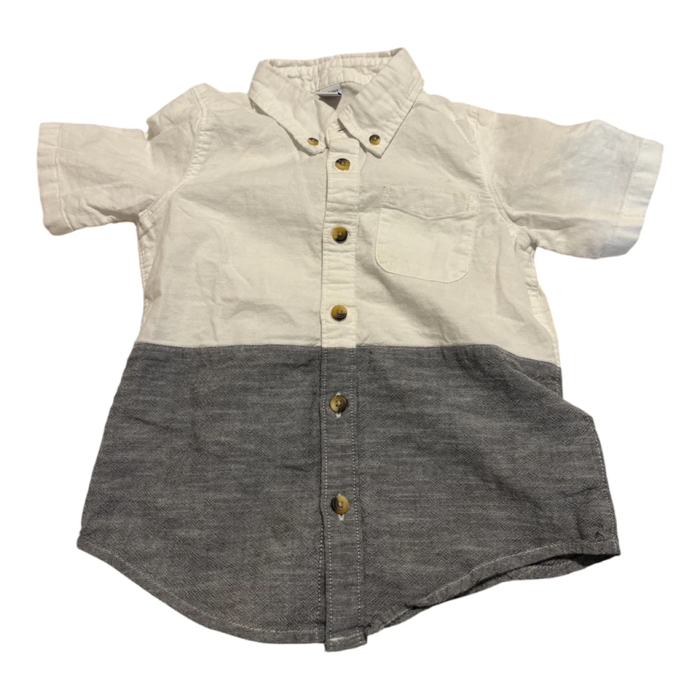 This set includes four boys' short sleeve button-down shirts. Two shirts feature stripes, one has a blue floral pattern, and one is a color-block design in white and grey. Made from breathable cotton. Great for warm weather outfits! One of the shirts has a small stain.
