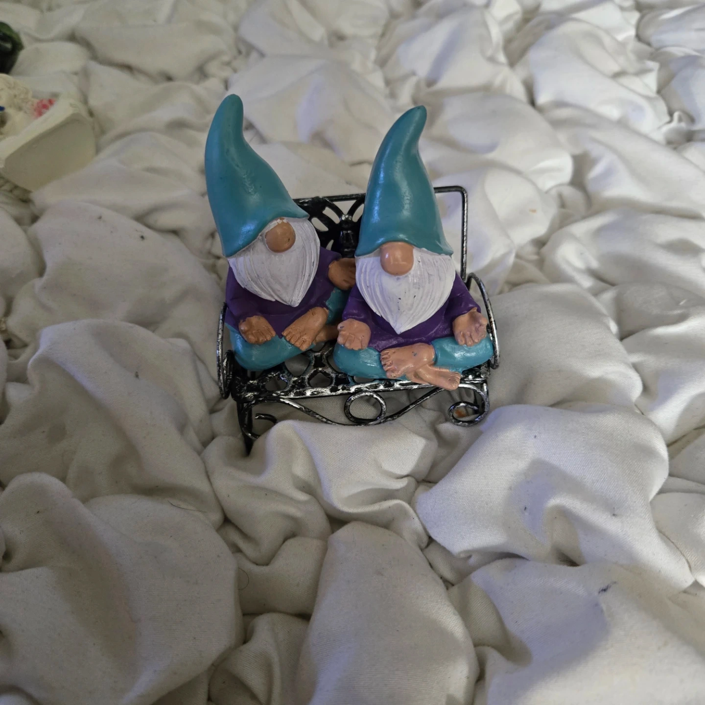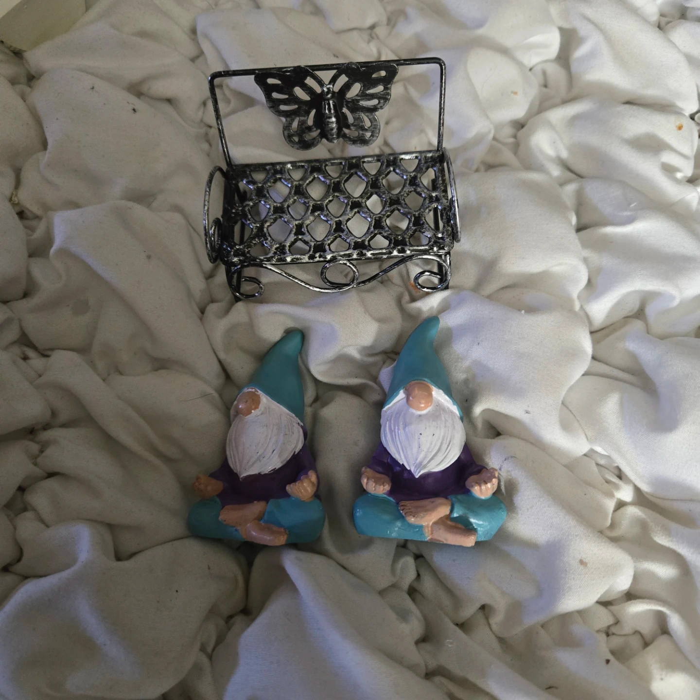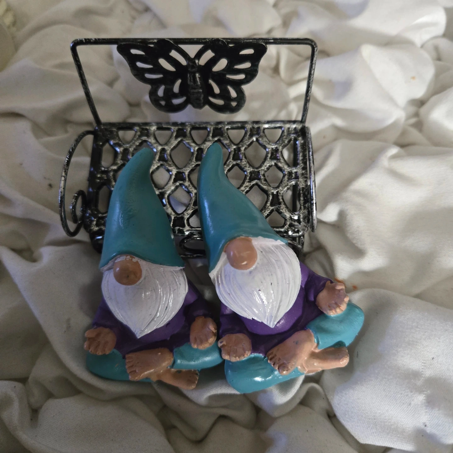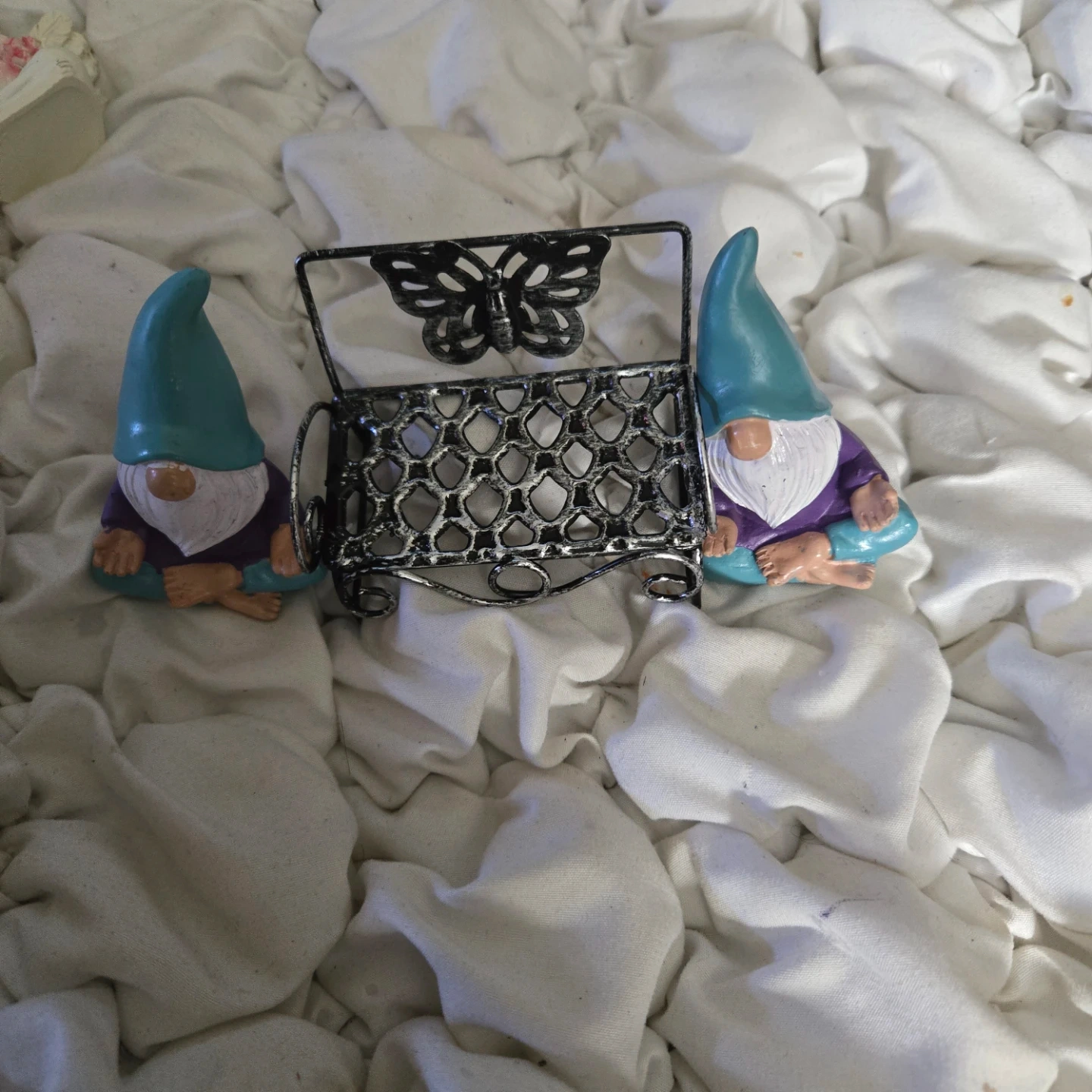 Two cute gnome figurines, each in a meditating pose, and a decorative metal bench with a butterfly design. The gnomes have a teal hat, white beard, purple shirt, and teal pants. There is some wear on the teal paint of one of the gnomes.