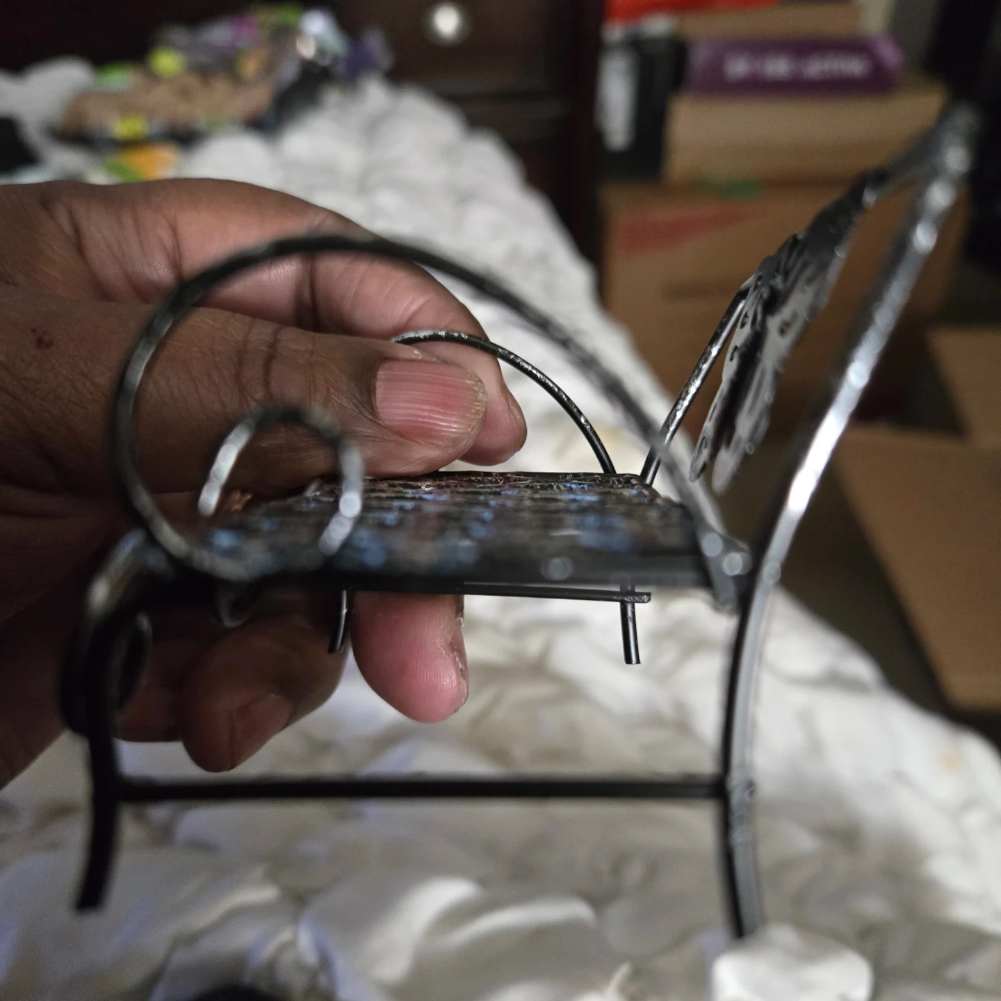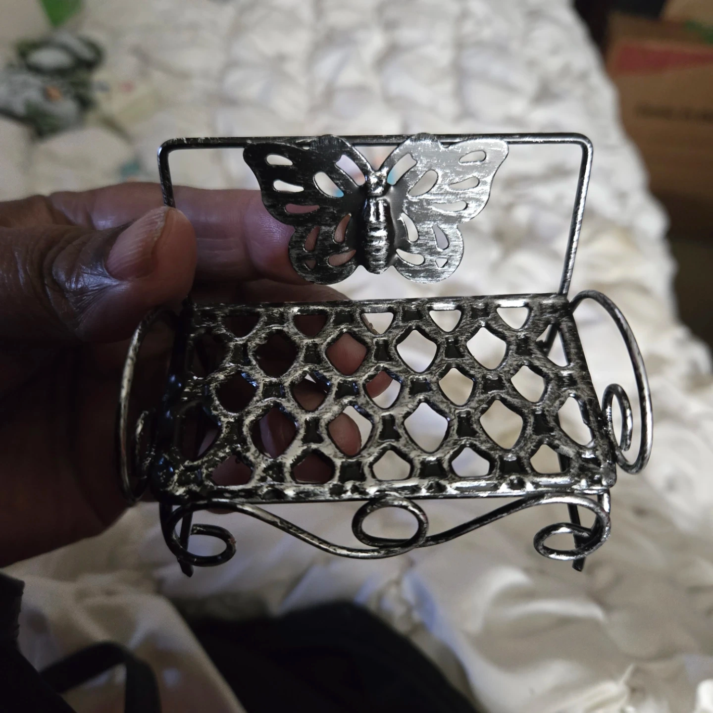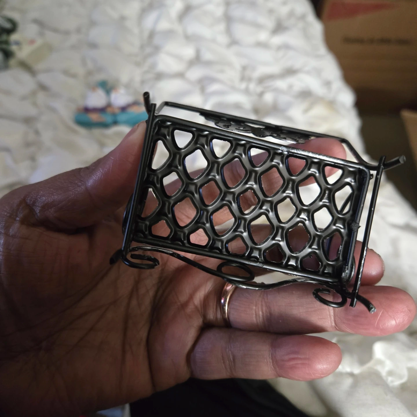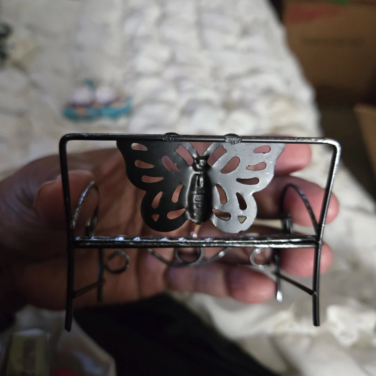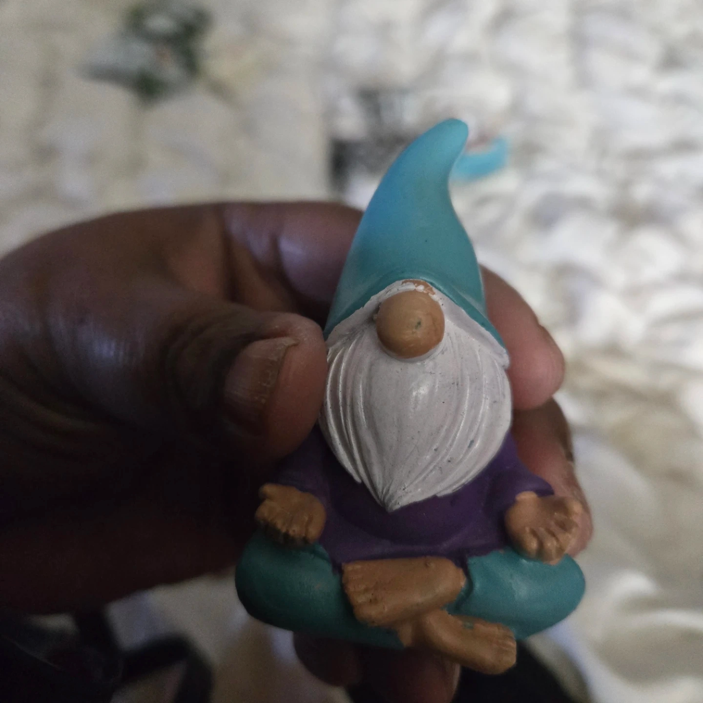 Two cute gnome figurines, each in a meditating pose, and a decorative metal bench with a butterfly design. The gnomes have a teal hat, white beard, purple shirt, and teal pants. There is some wear on the teal paint of one of the gnomes.