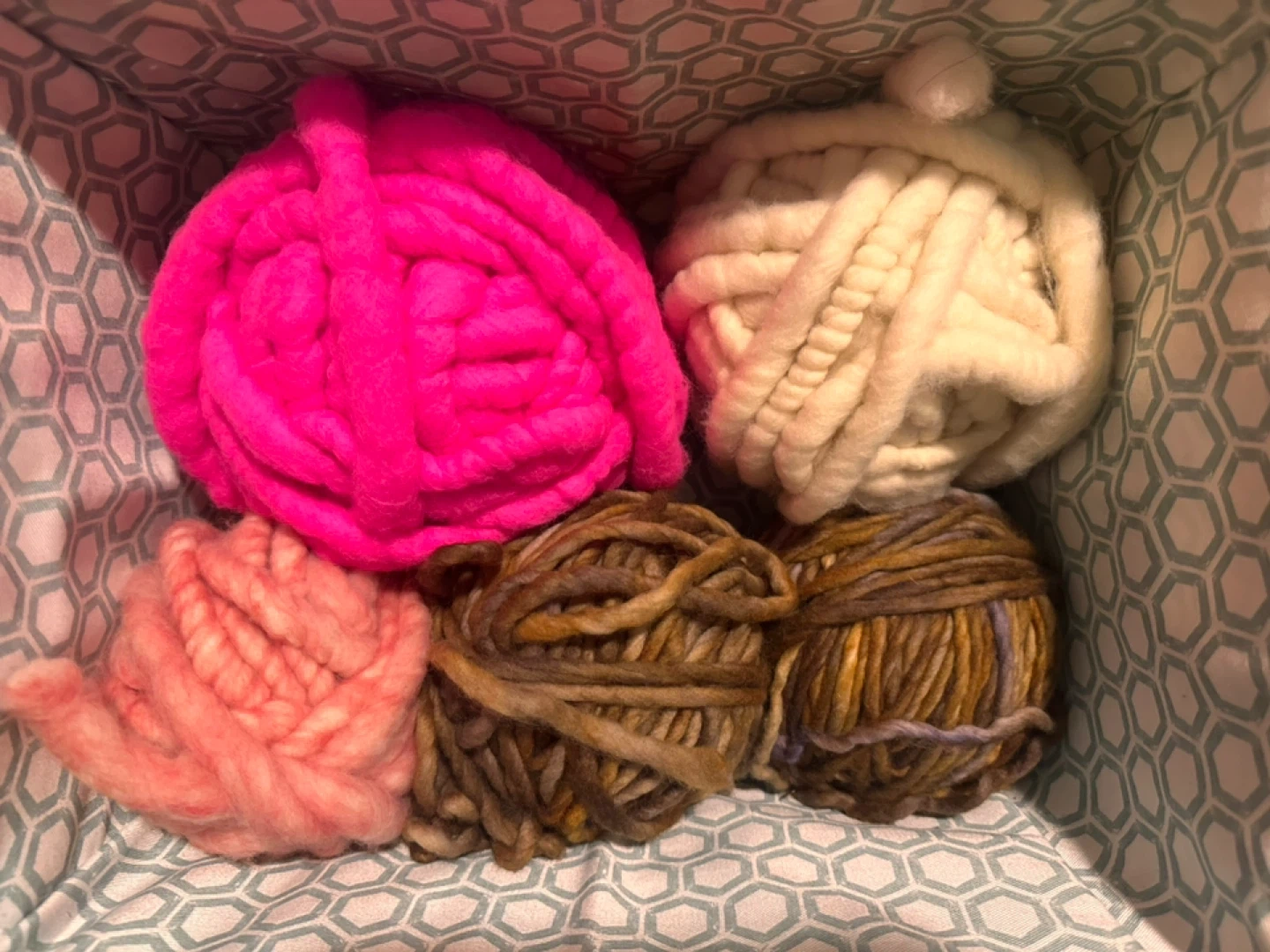 Selling a bundle of organic alpaca yarn in various colors. Includes pink, cream, and brown yarn. Perfect for your next knitting or crochet project!