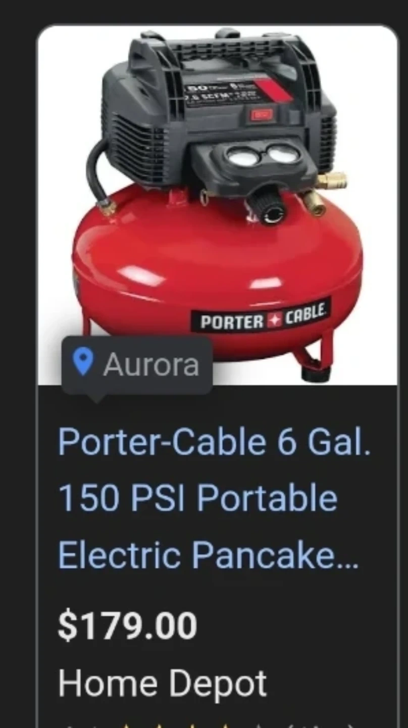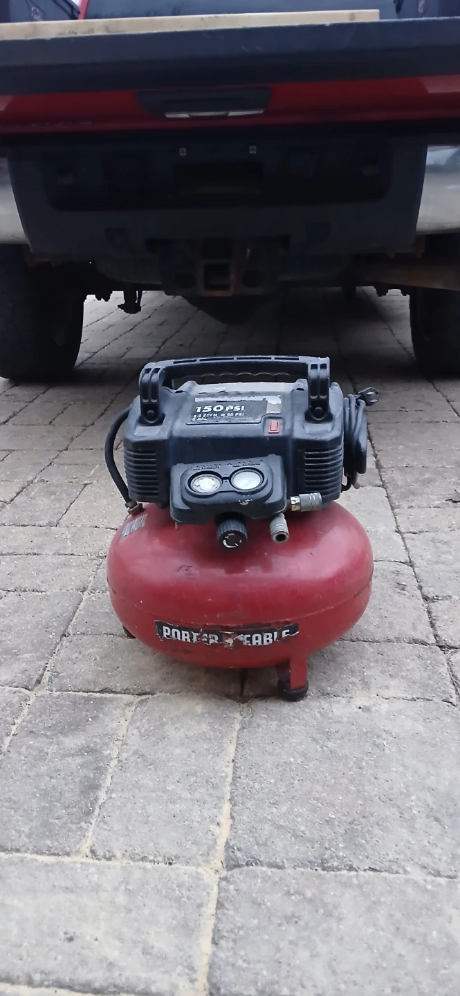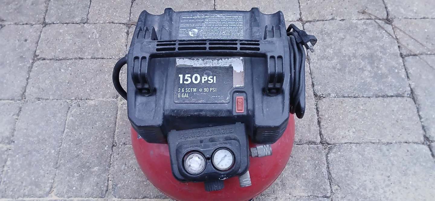 This Porter-Cable electric pancake air compressor has a 6-gallon tank and 150 PSI max pressure. It features a 2.6 SCFM @ 90 PSI rating. It's portable and easy to use for various tasks. This compressor is great for powering nail guns, inflating tires, and more!