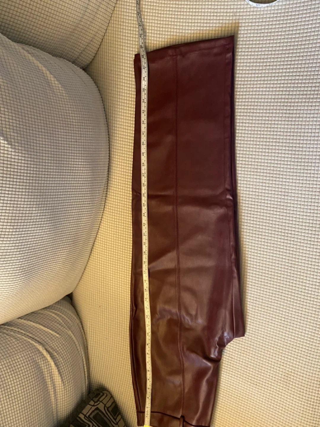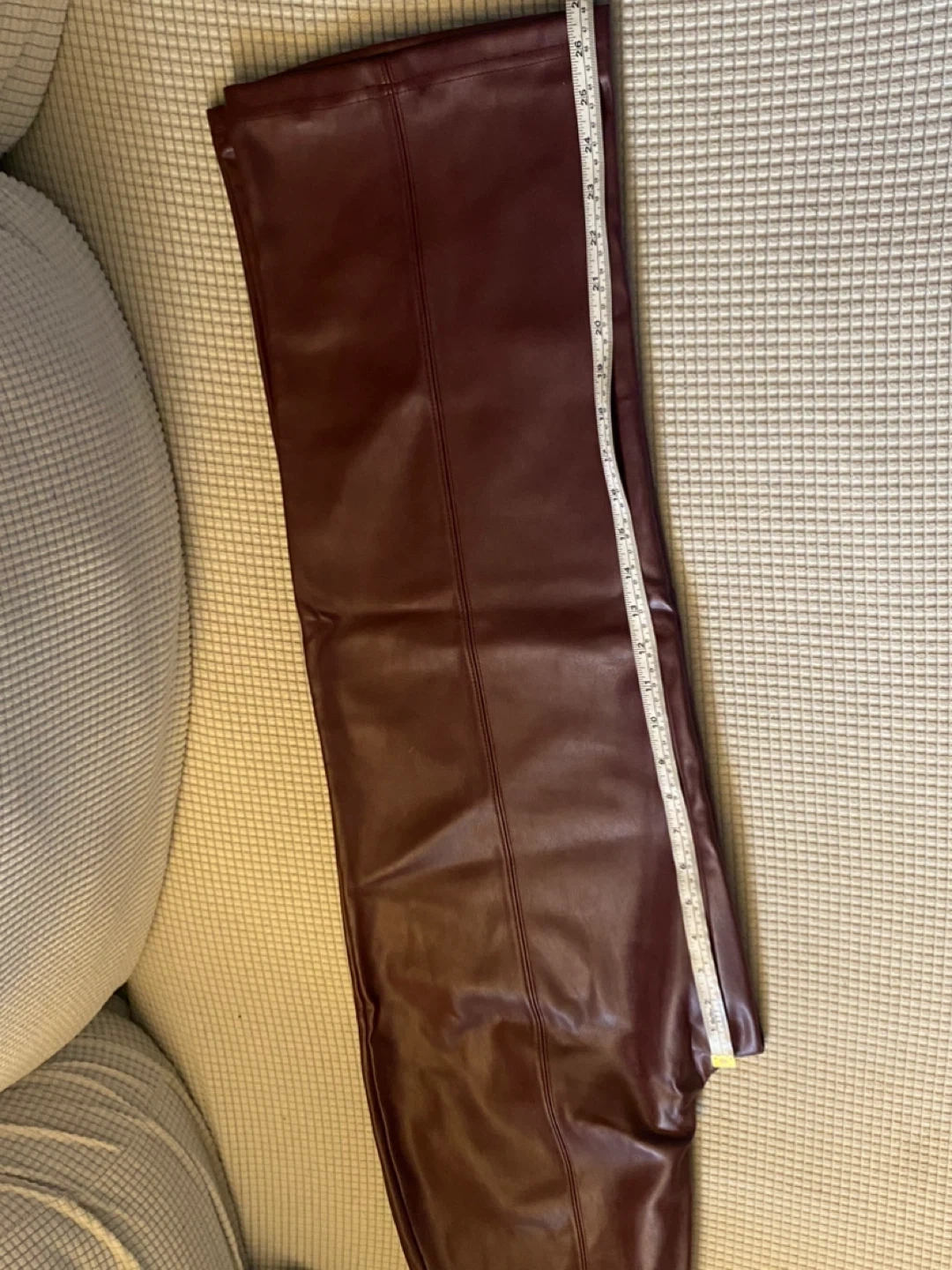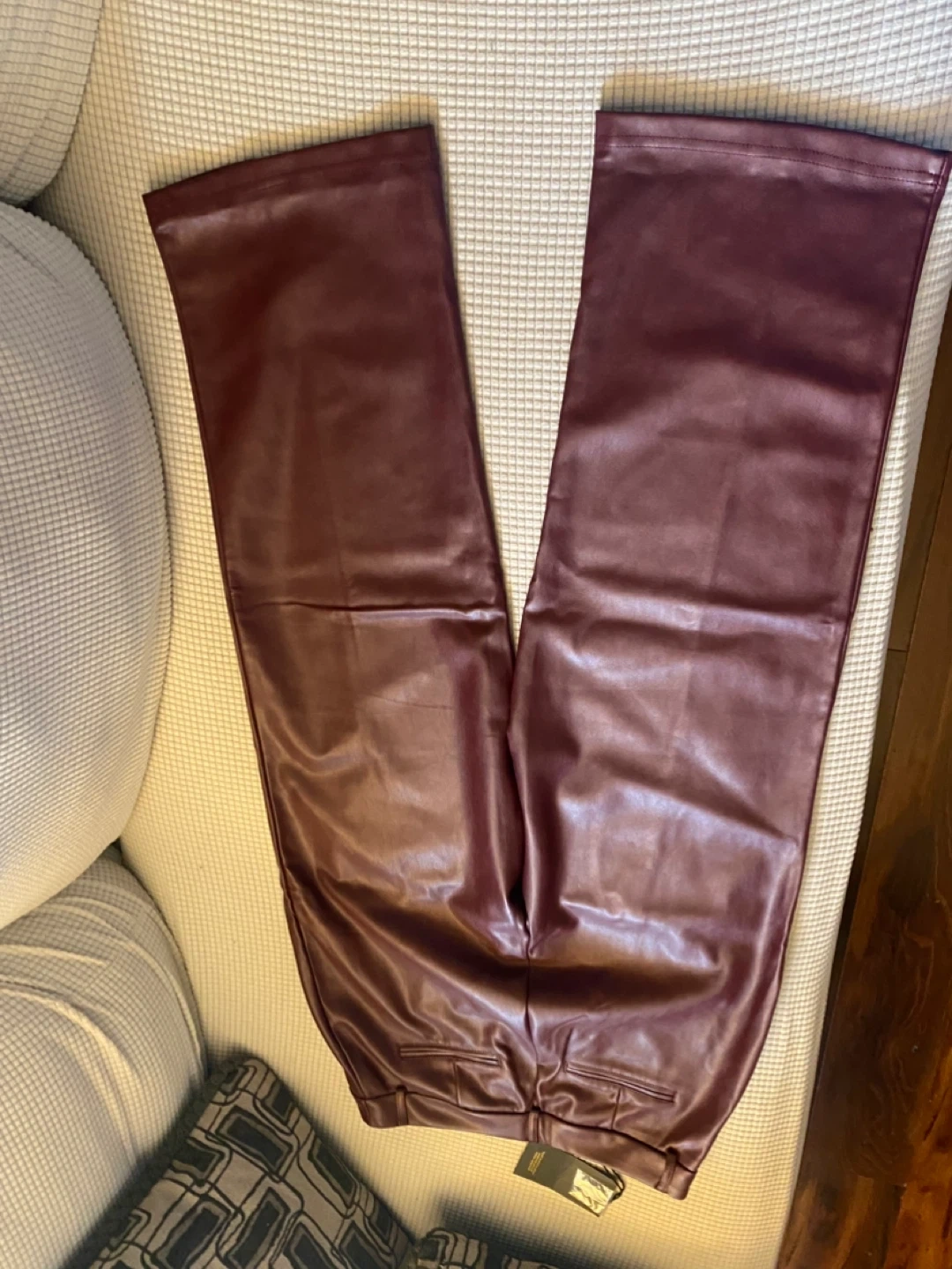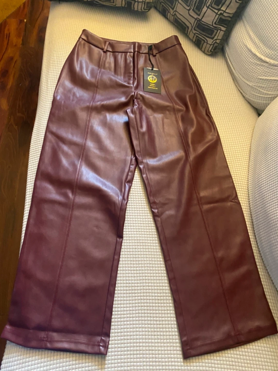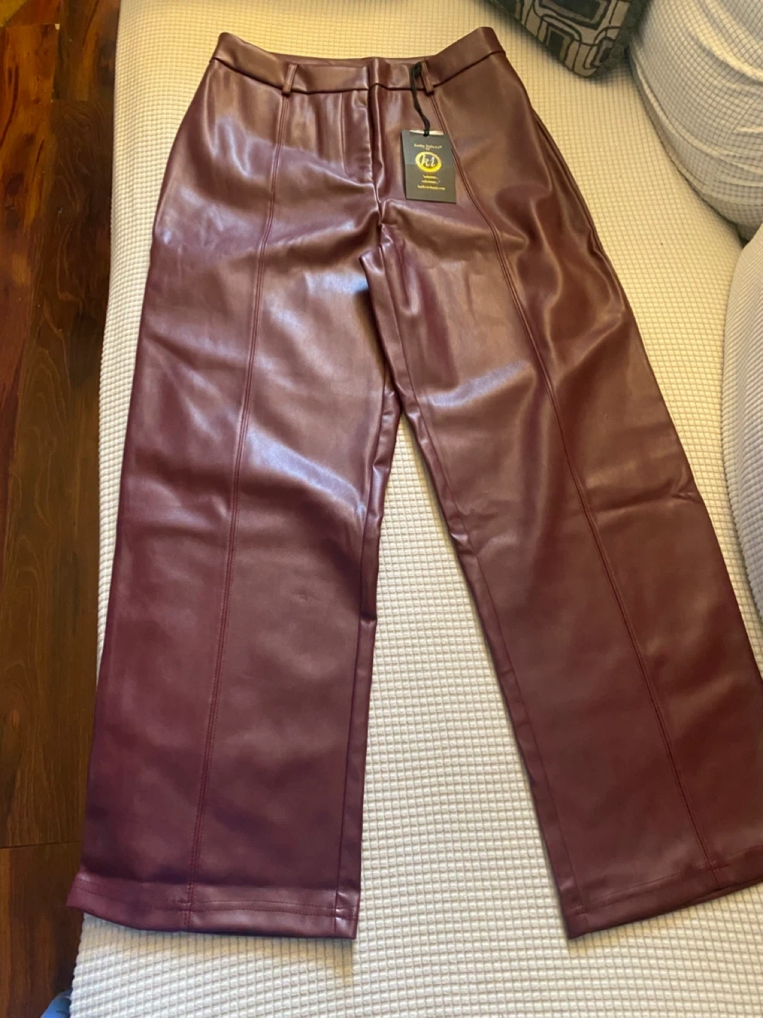 Kathy Ireland Style faux leather pants in a beautiful burgundy color! The pants are a size M and have a stylish, modern look. The material is soft and comfortable, perfect for adding a touch of edgy elegance to any outfit
