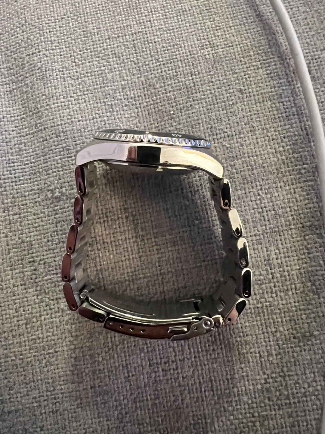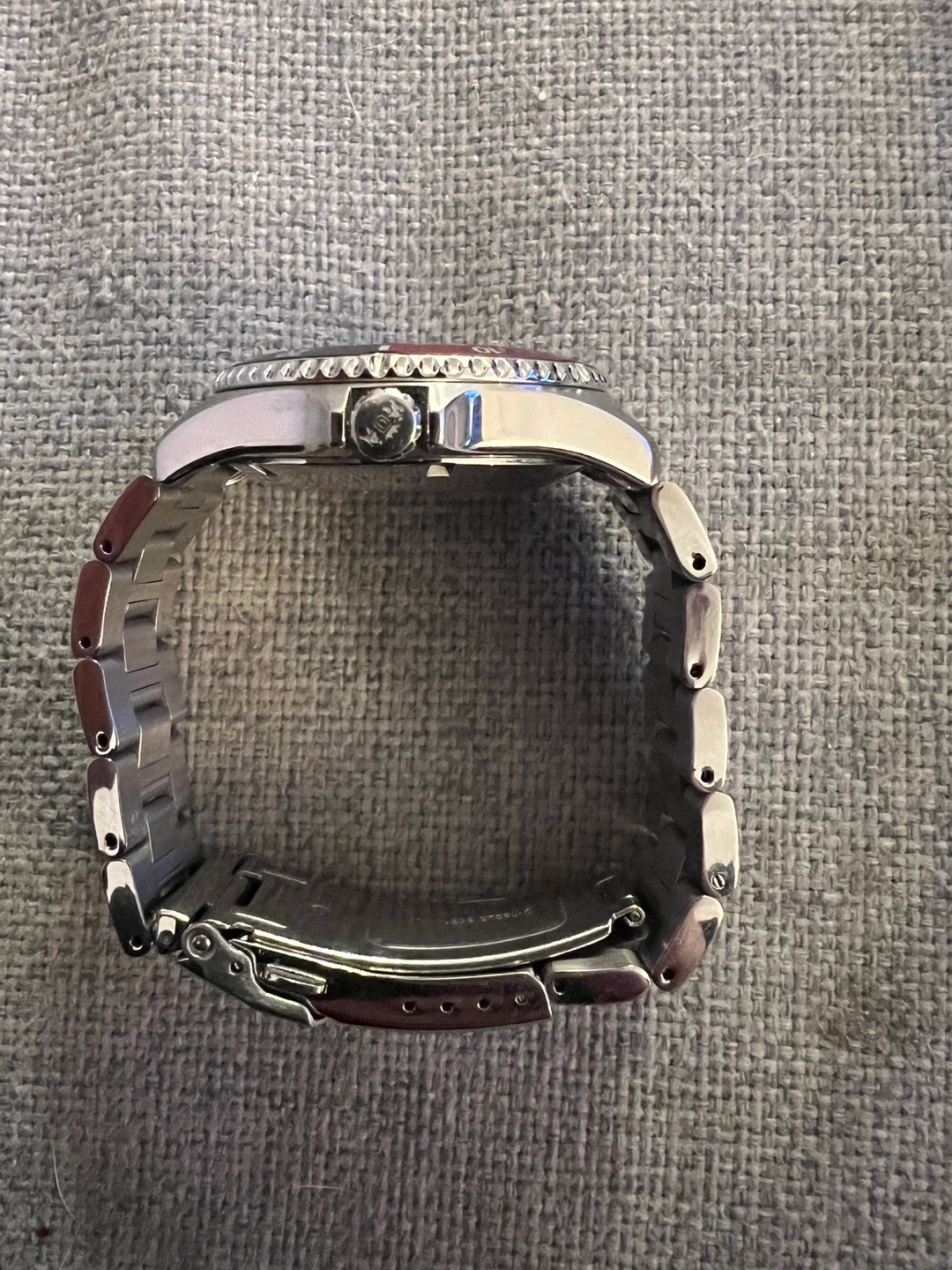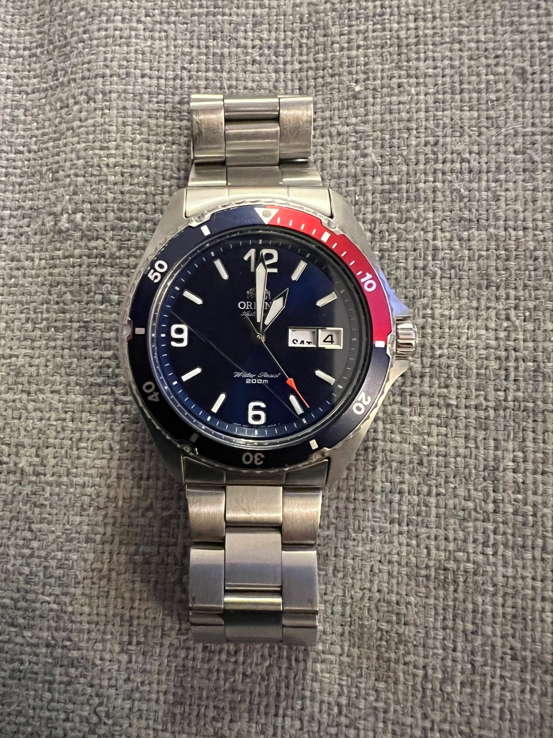 65Men's Orient automatic watch. Stainless steel band and case. Blue dial with red and white accents. Date window. Water resistant. Pre-owned. Long Scratch on glass.
