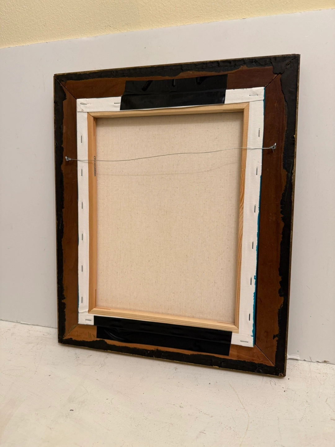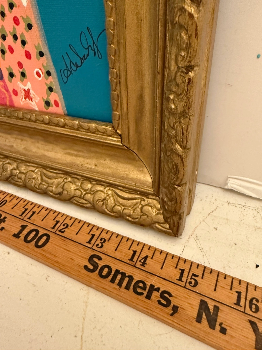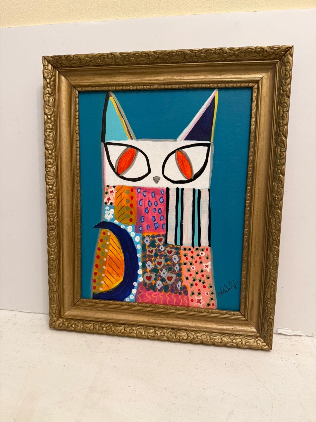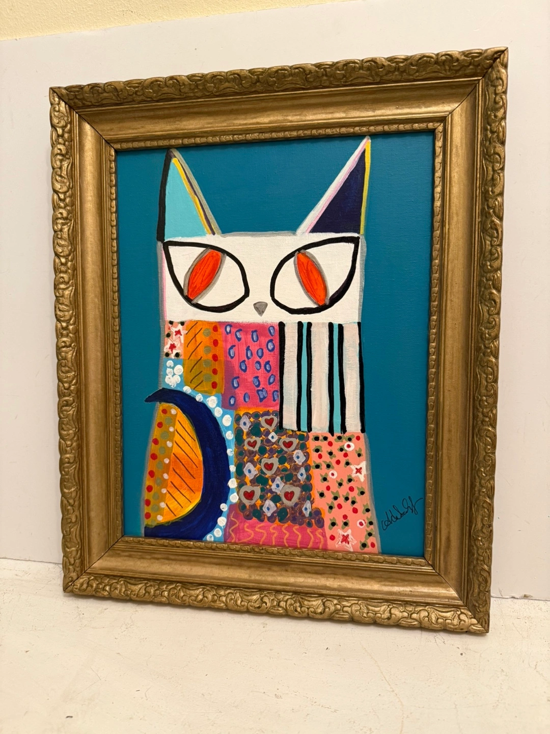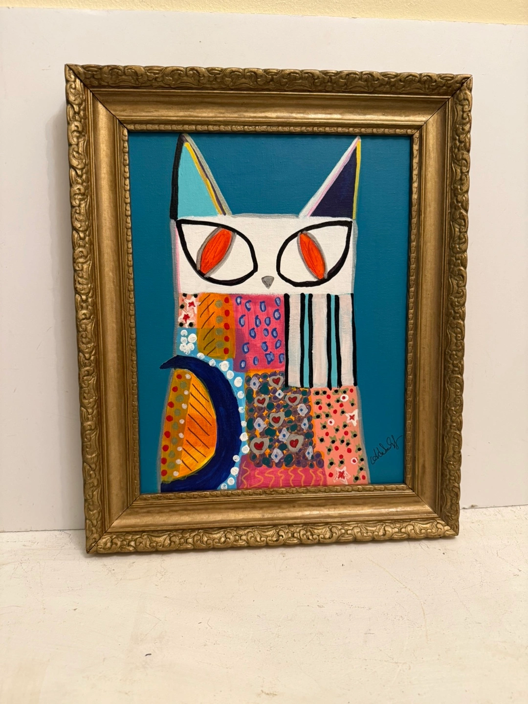Acrylic on canvas in a vintage wooden frame. Whimsical cat painted by me from my cat collection of paintings. Pick up and cash only.