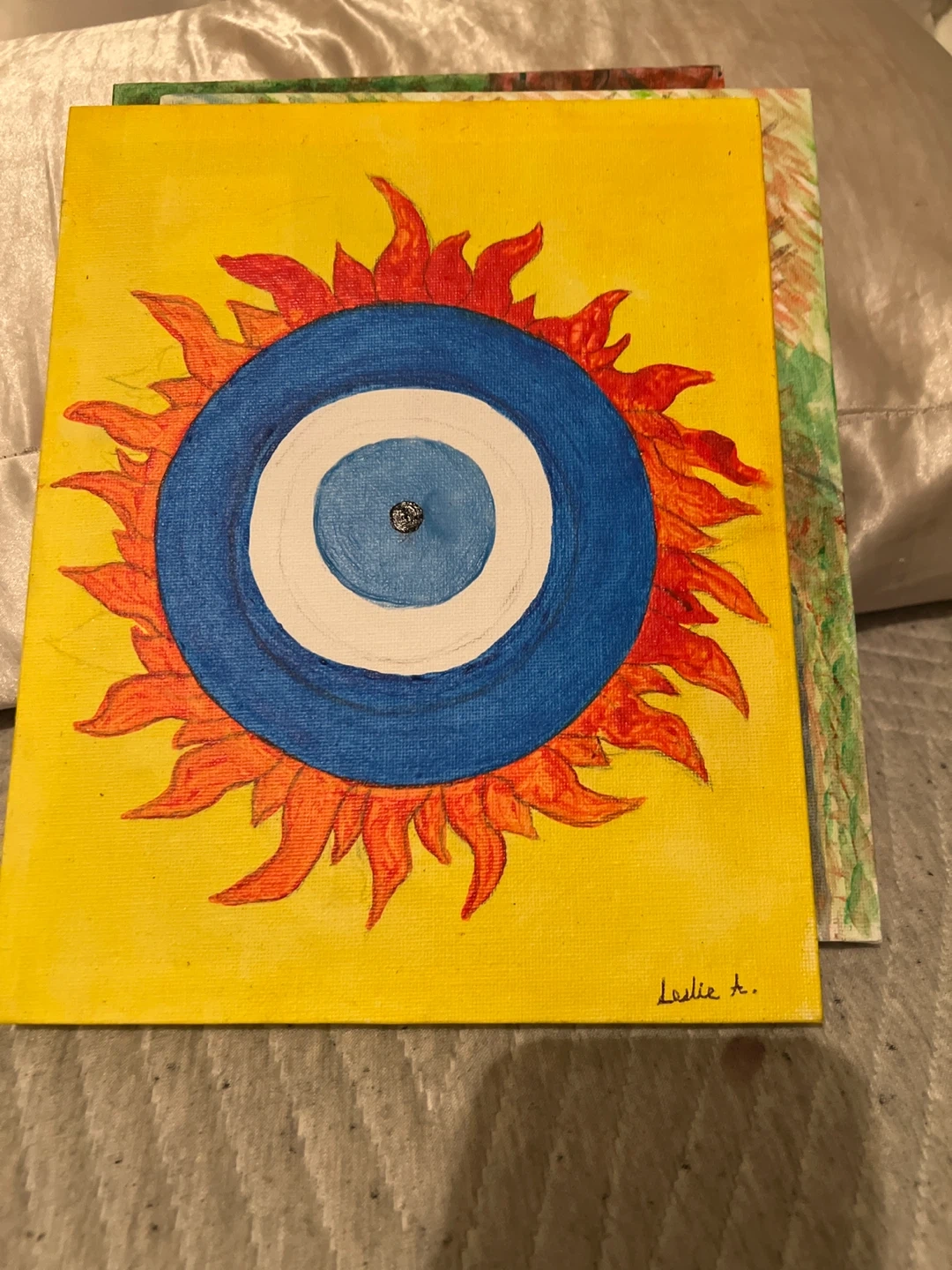 Original painting of an evil eye design on a yellow canvas by artist Leslie A. It's a unique piece with a vibrant color palette!