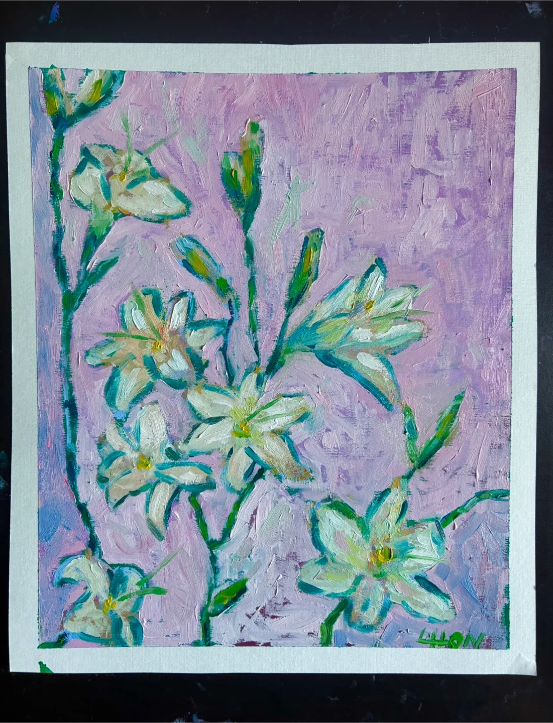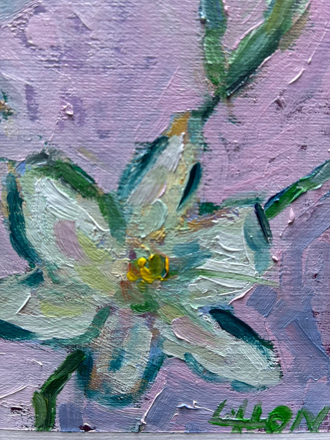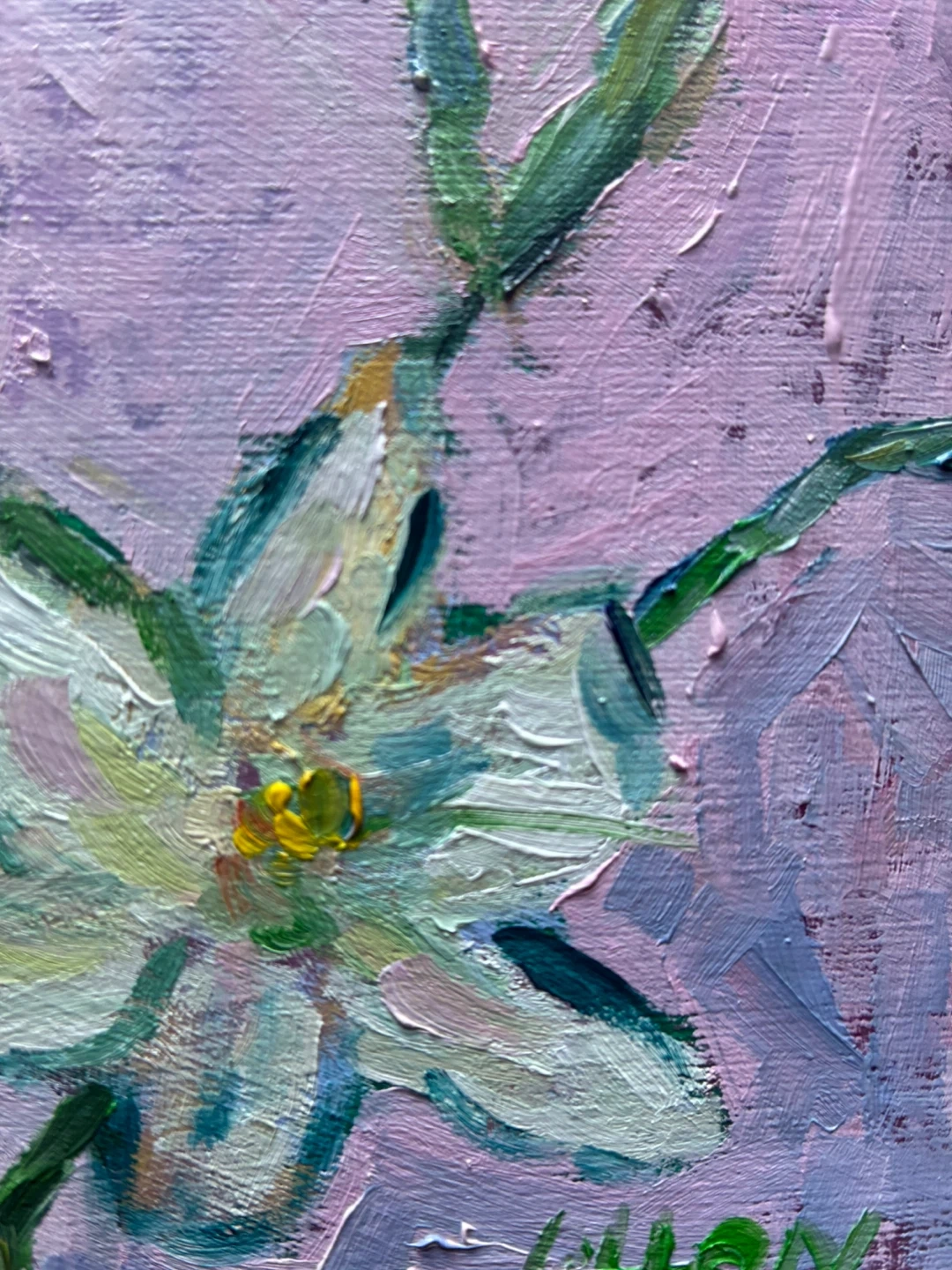 This is an original floral oil painting, perfect for adding a touch of color to any room. The painting features white flowers with green stems against a lavender background. The artist's signature is visible in the bottom right corner.