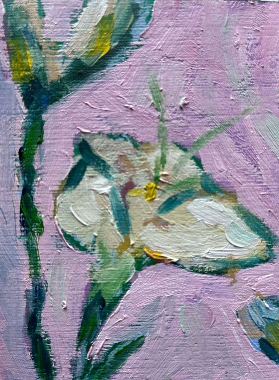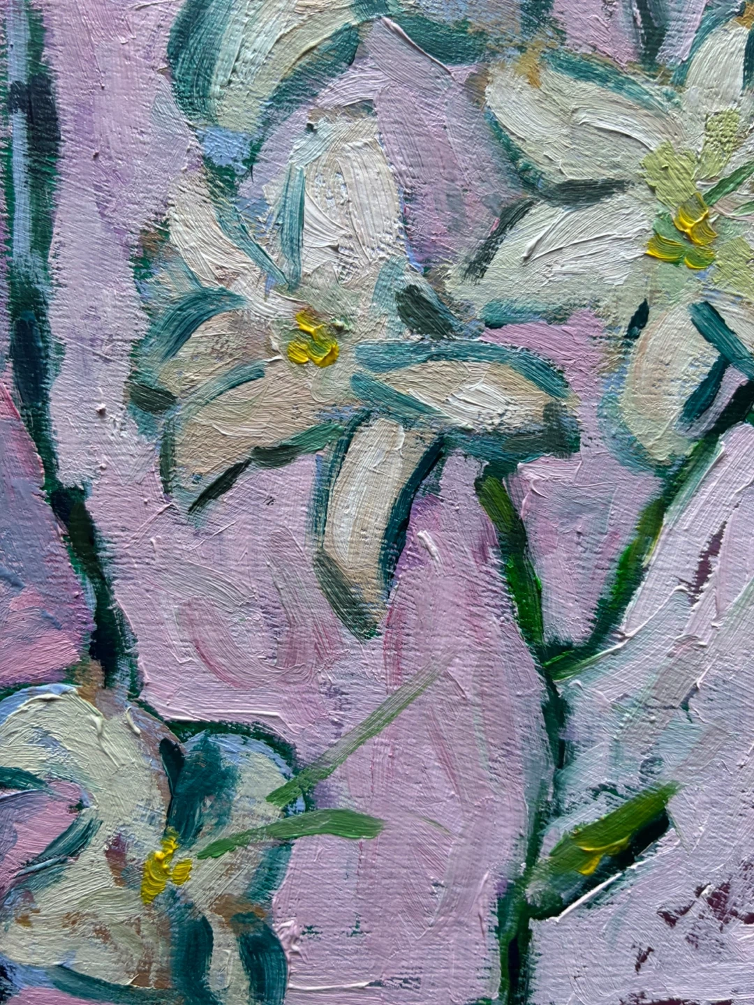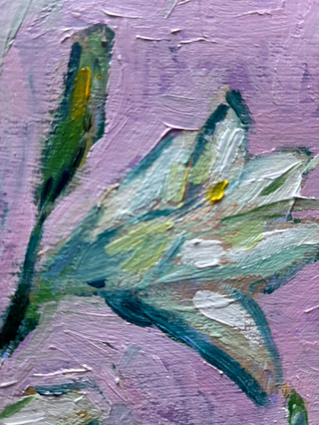 This is an original floral oil painting, perfect for adding a touch of color to any room. The painting features white flowers with green stems against a lavender background. The artist's signature is visible in the bottom right corner.