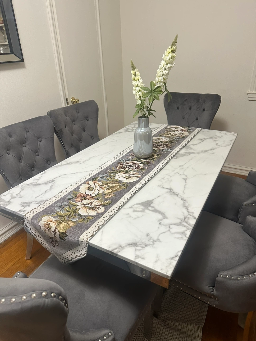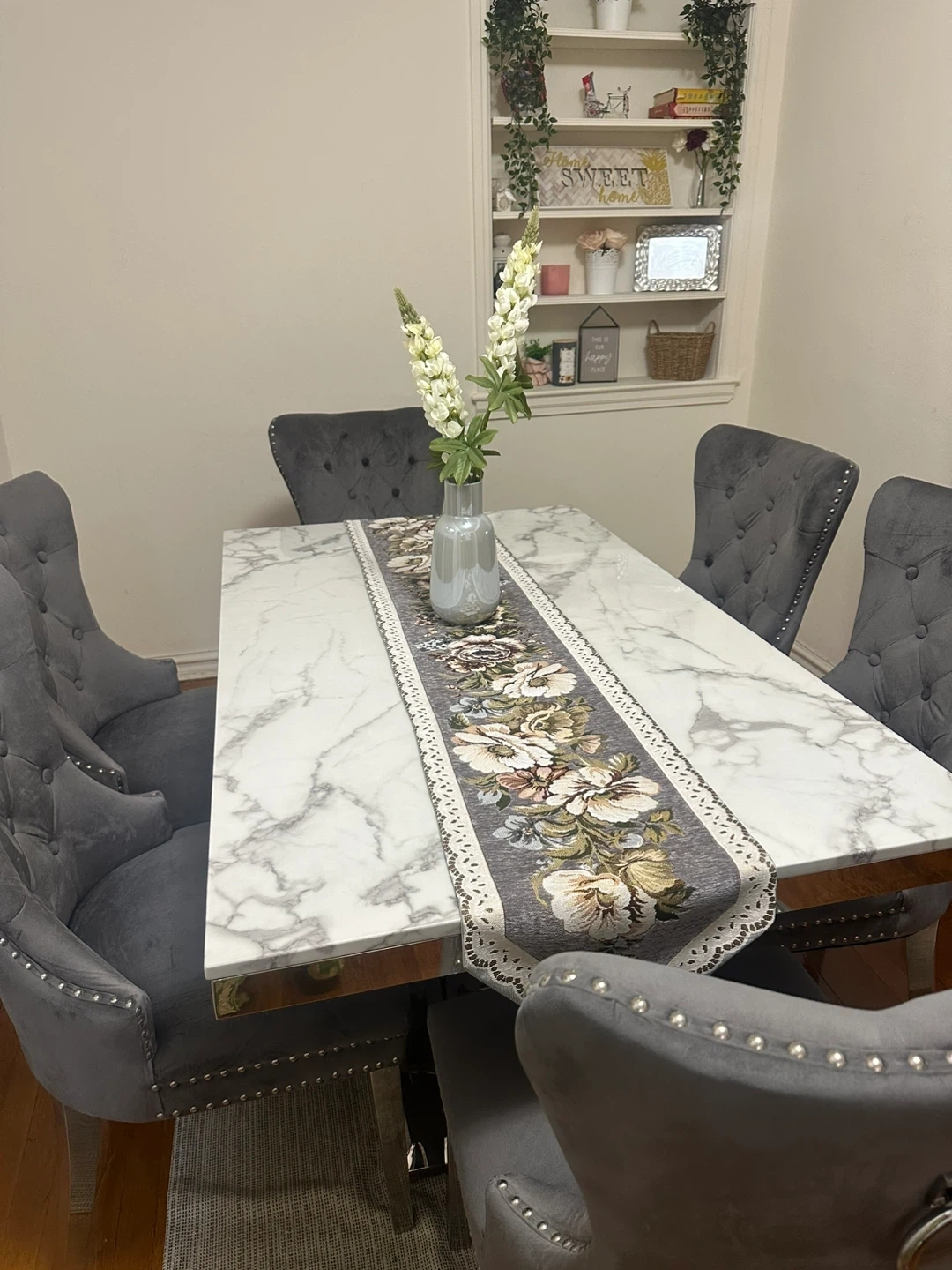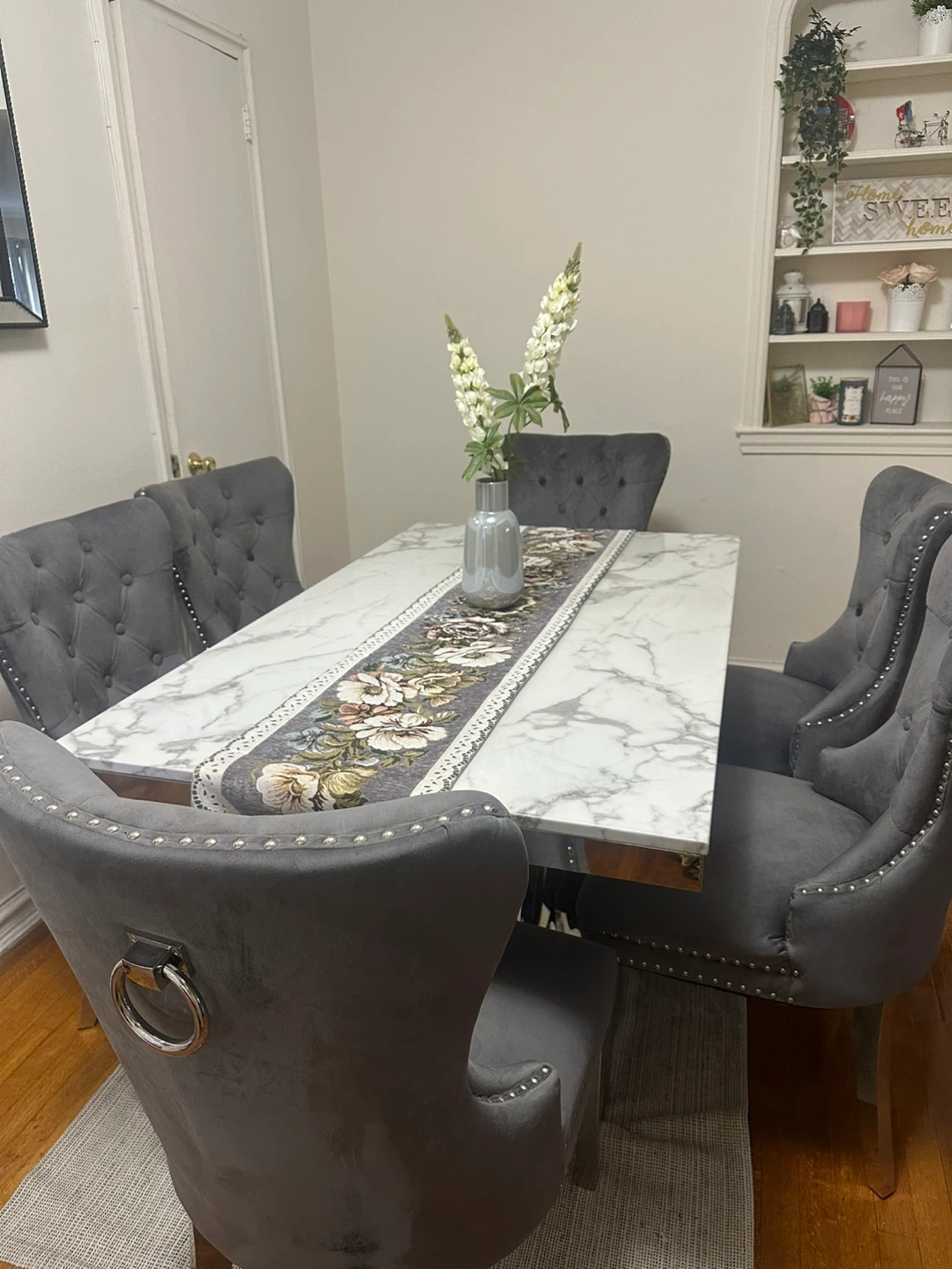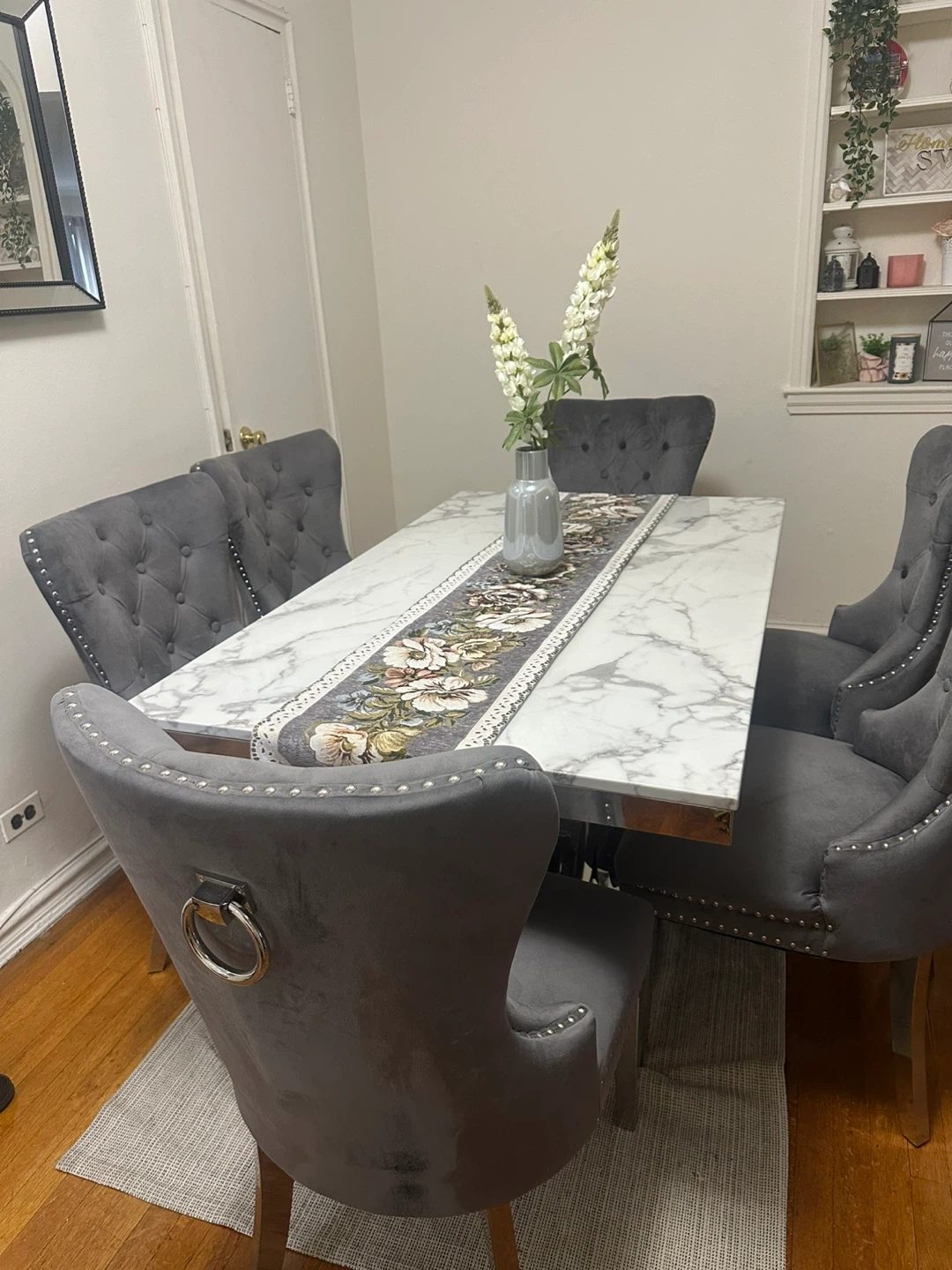 Selling a beautiful dining table set! The table has a marble top, and it comes with six elegant gray velvet chairs. The chairs have a tufted design and a ring detail on the back. It's a stylish set that would look great in any dining room. This was mainly for formal dining so hardly used it. Still like new