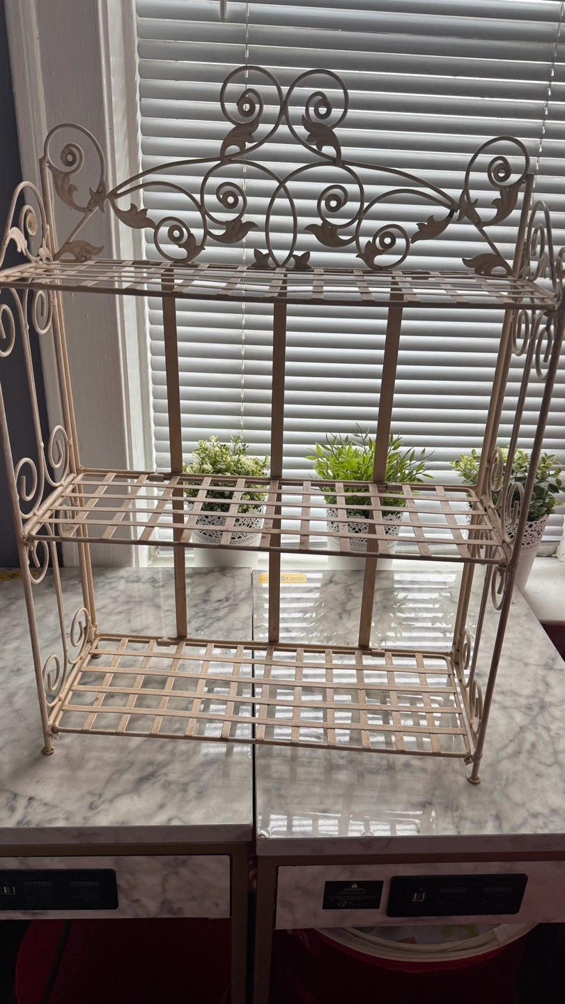 17Three-tiered shelf, metal construction. Ornate detailing. Perfect for plants or decorative items.
