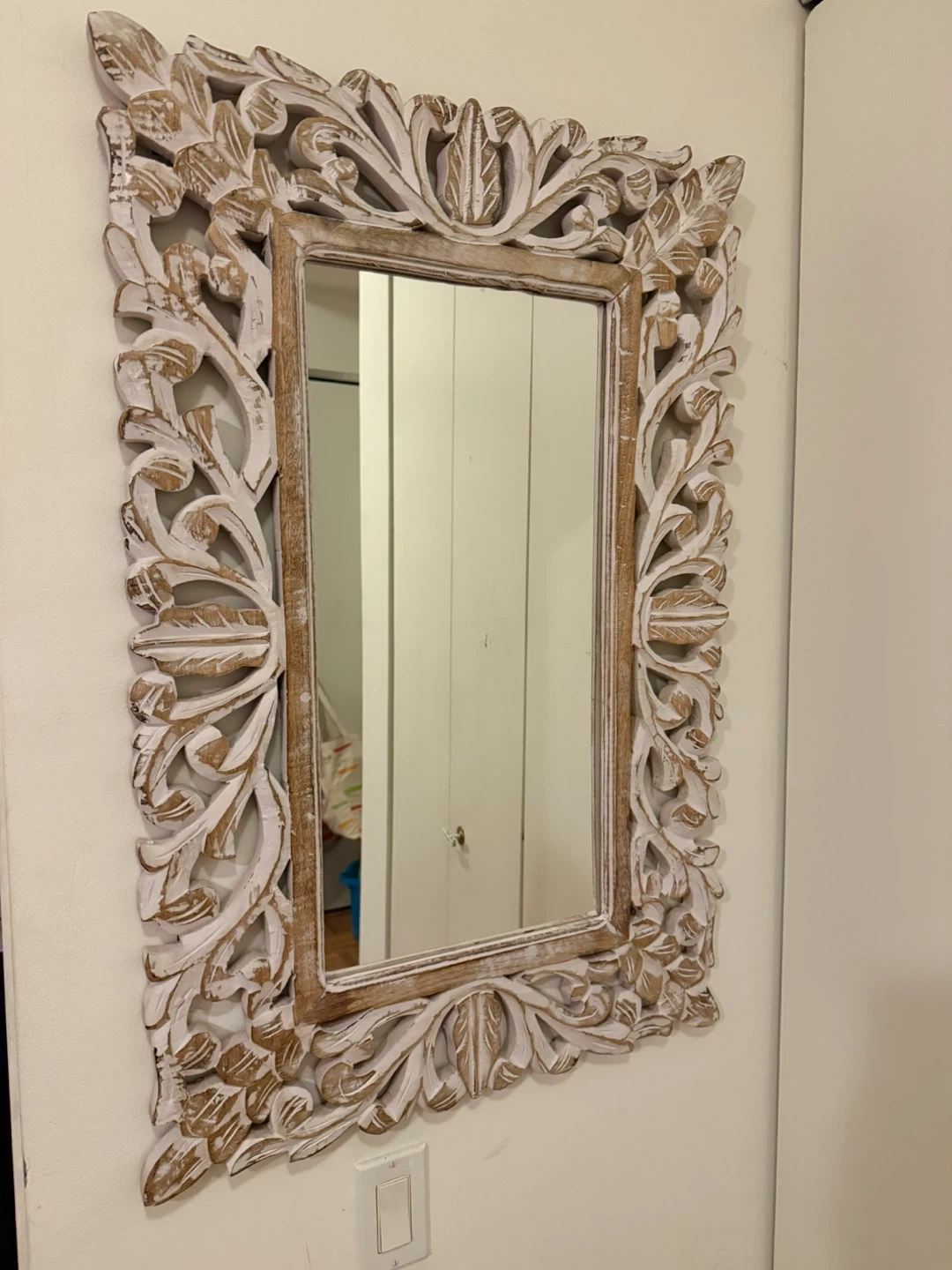 This is a beautiful mirror with an ornate, carved wood frame. It's perfect for adding a touch of elegance to any room. The frame is a light color, possibly white-washed, with intricate floral and leaf designs. It's in great condition and ready to hang