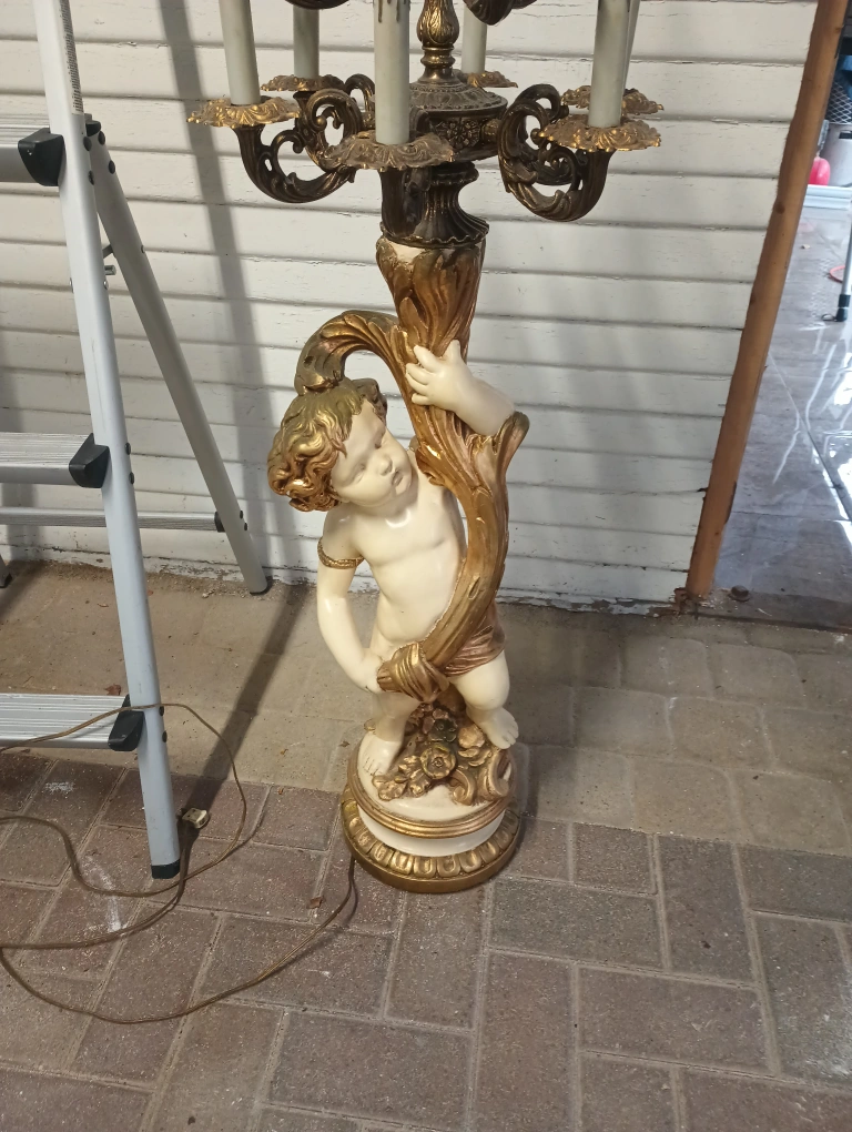 Beautiful cherub floor lamp. Six candle-style lights. Gold and off-white accents. Intricate detailing. Electric cord. Antique