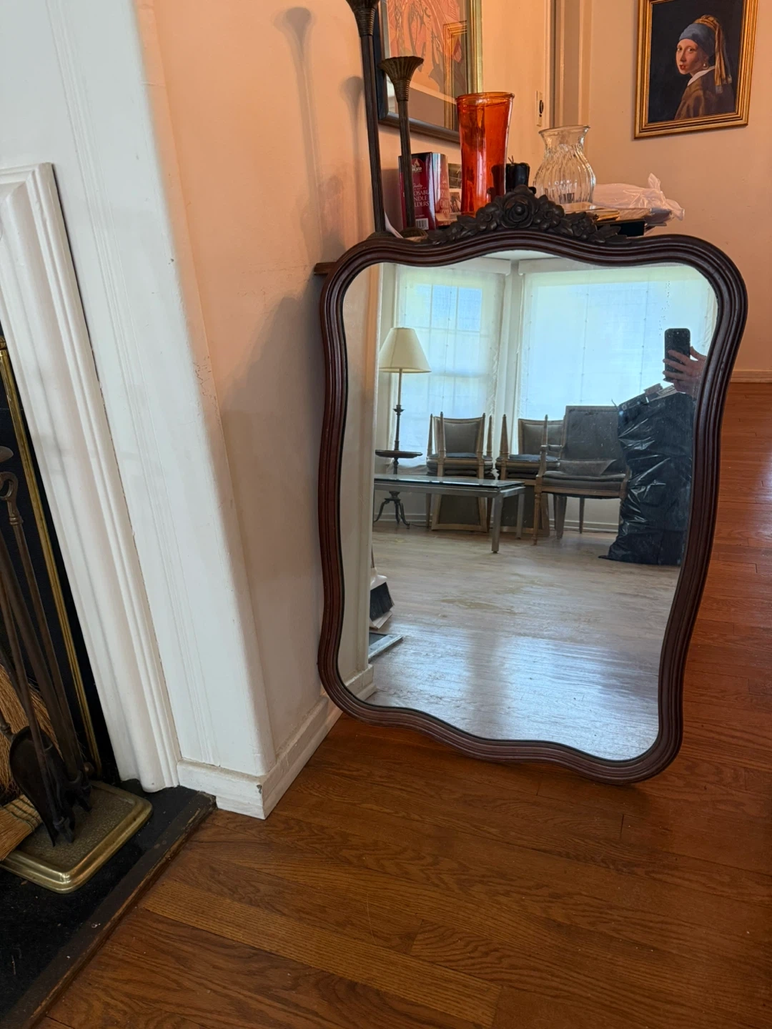 78Selling a beautiful ornate framed mirror. It has a dark wood frame with a decorative design. Perfect for adding a touch of elegance to any room!