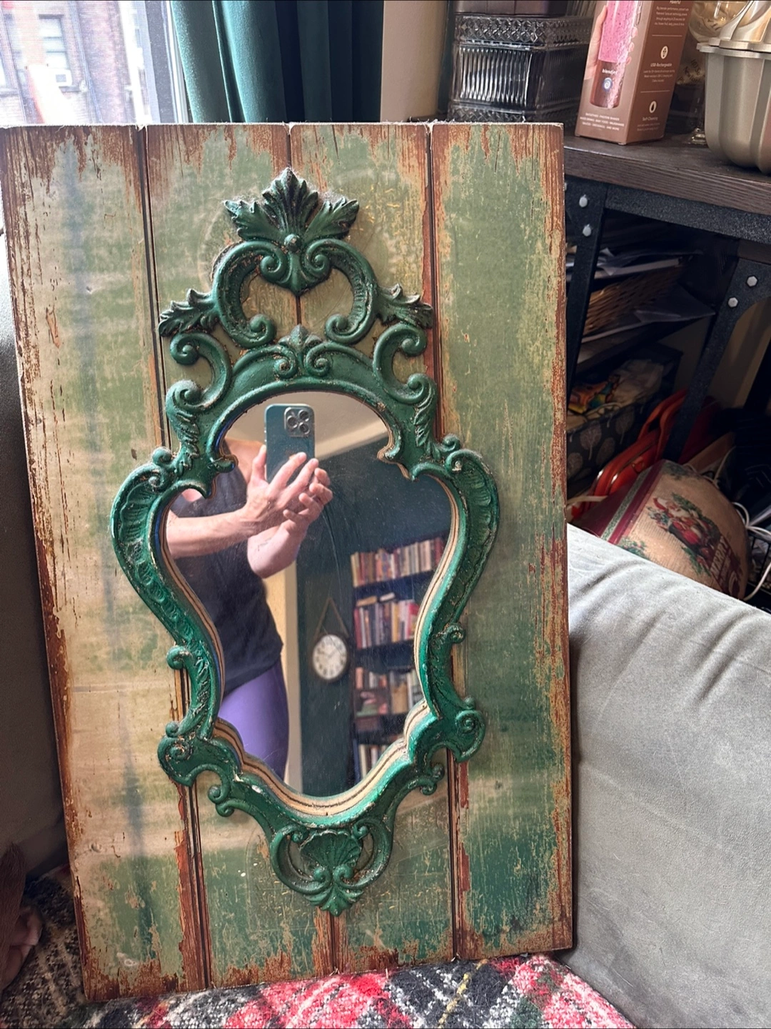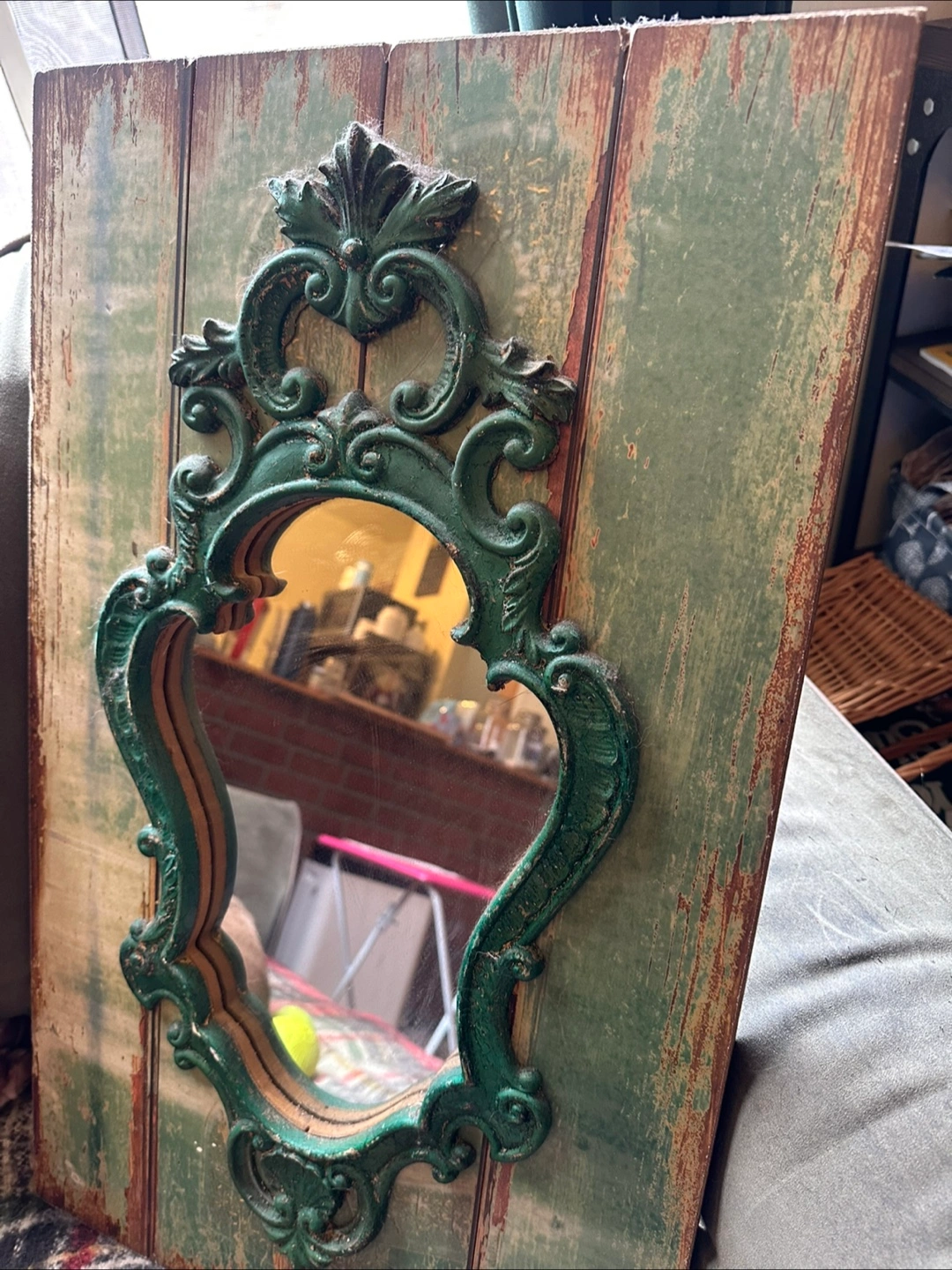 Selling a charming wall mirror with an ornate green frame! It has a rustic, vintage-inspired look that would add character to any room. The mirror is in good condition and ready to hang