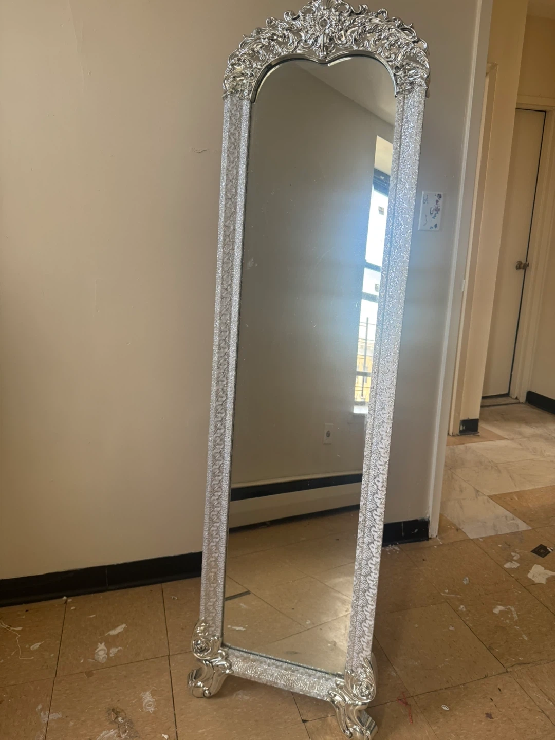 Selling a full-length mirror with a beautiful ornate silver frame. It's perfect for adding a touch of elegance to any room! The mirror is in good condition and ready to find a new home