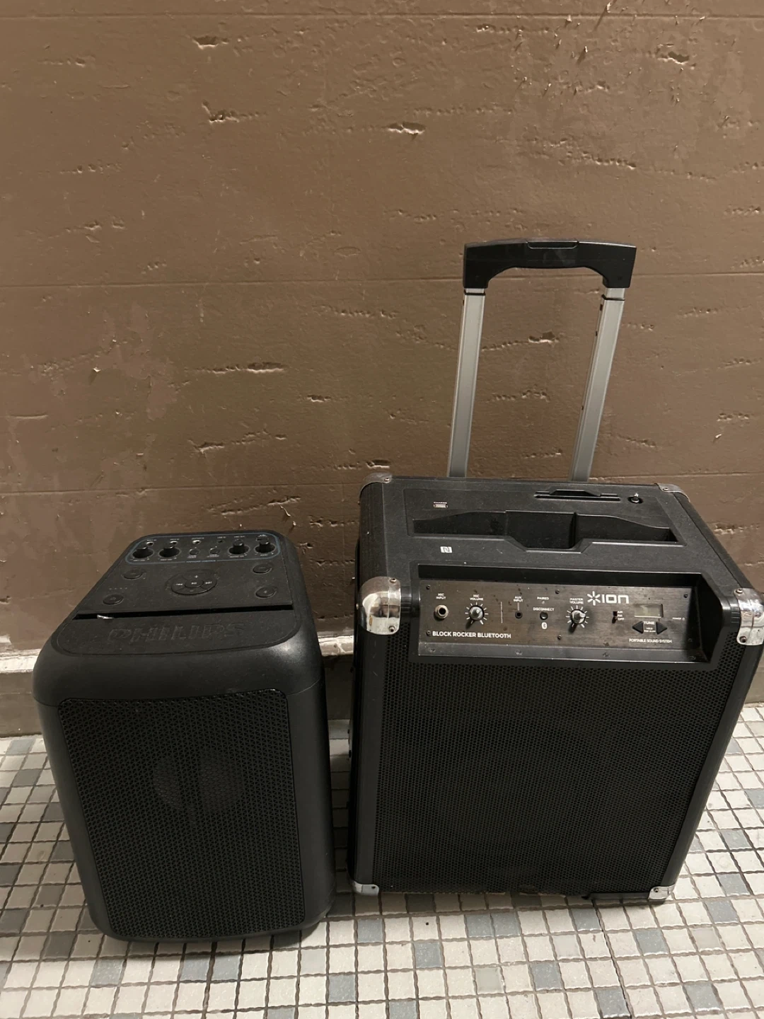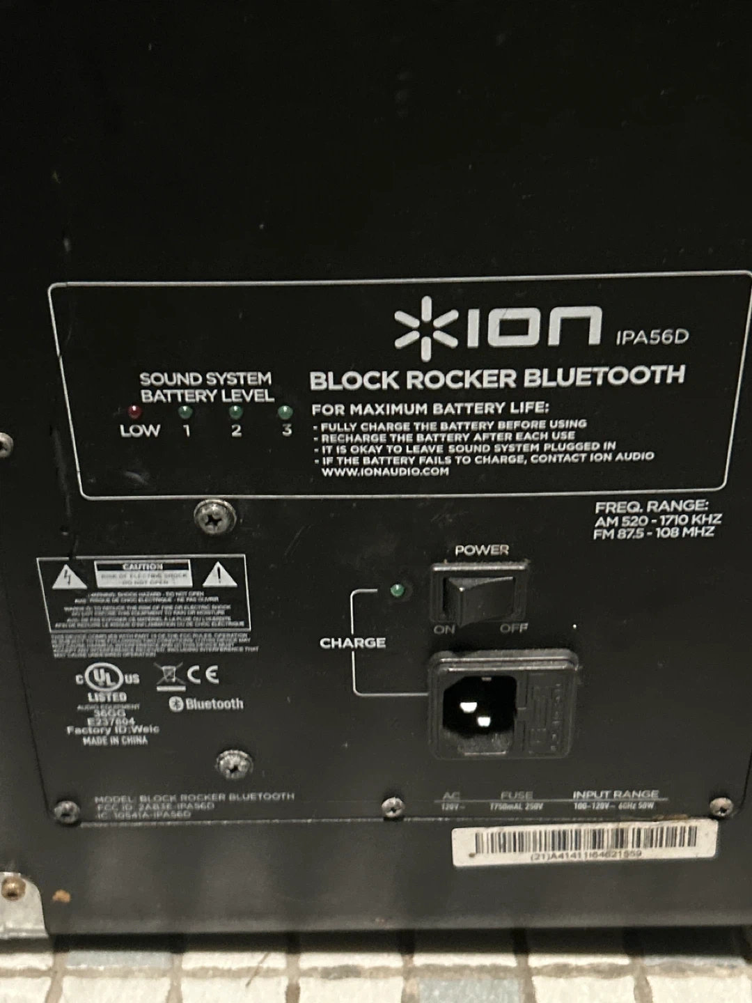 ION Block Rocker Bluetooth IPA56D portable speaker. Features wireless Bluetooth connectivity. Built-in rechargeable battery. Input range 100-240V AC, 50/60Hz, 70W max.