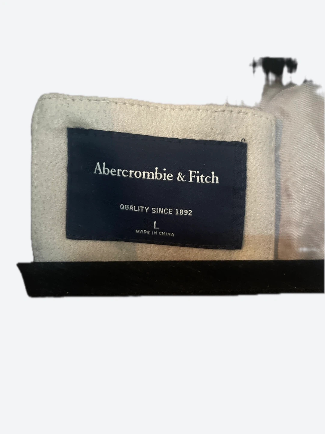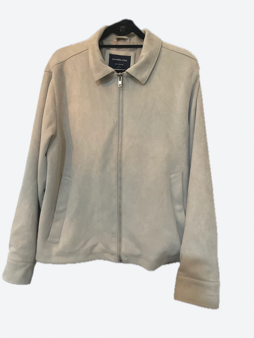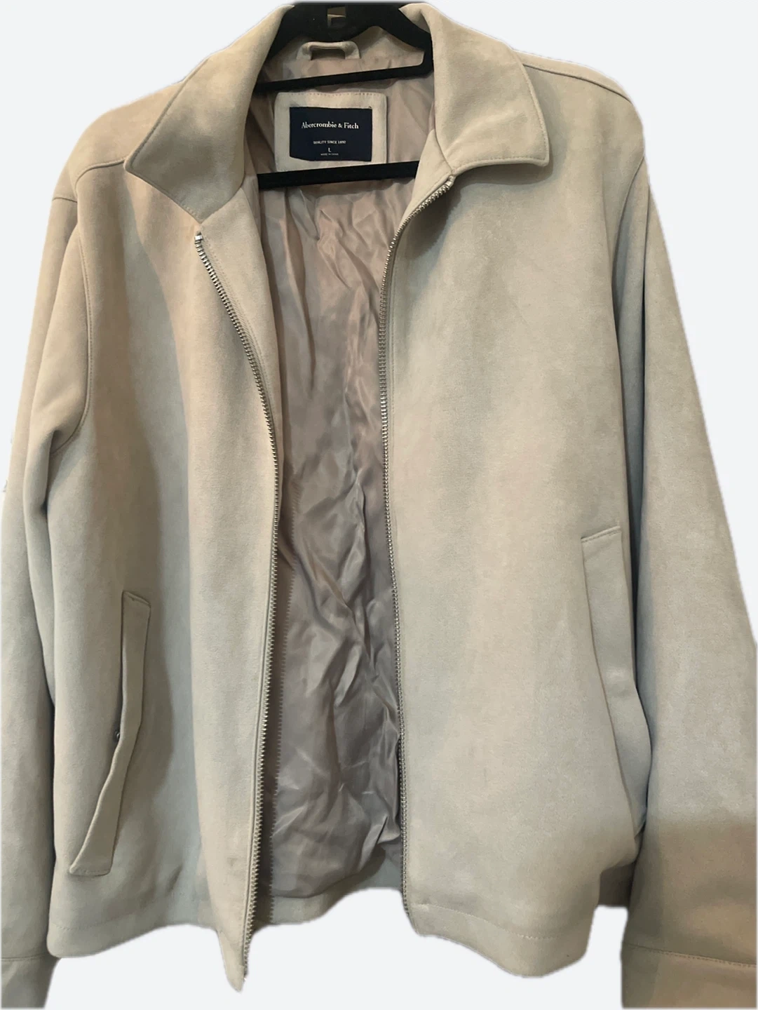 Abercrombie & Fitch bomber jacket in a light tan color. It's made from a soft, suede-like material and features a full zip closure. Size is large.